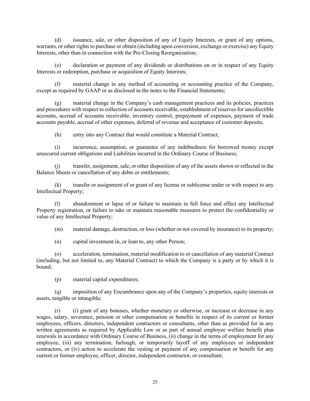 25 (d) issuance, sale, or other disposition of any of Equity Interests, or grant of any options, warrants, or other rights to purchase or obtain (including upon conversion, exchange or exercise) any Equity Interests, other than in connection with the Pre-Closing Reorganization; (e) declaration or payment of any dividends or distributions on or in respect of any Equity Interests or redemption, purchase or acquisition of Equity Interests; (f) material change in any method of accounting or accounting practice of the Company, except as required by GAAP or as disclosed in the notes to the Financial Statements; (g) material change in the Company’s cash management practices and its policies, practices and procedures with respect to collection of accounts receivable, establishment of reserves for uncollectible accounts, accrual of accounts receivable, inventory control, prepayment of expenses, payment of trade accounts payable, accrual of other expenses, deferral of revenue and acceptance of customer deposits; (h) entry into any Contract that would constitute a Material Contract; (i) incurrence, assumption, or guarantee of any indebtedness for borrowed money except unsecured current obligations and Liabilities incurred in the Ordinary Course of Business; (j) transfer, assignment, sale, or other disposition of any of the assets shown or reflected in the Balance Sheets or cancellation of any debts or entitlements; (k) transfer or assignment of or grant of any license or sublicense under or with respect to any Intellectual Property; (l) abandonment or lapse of or failure to maintain in full force and effect any Intellectual Property registration, or failure to take or maintain reasonable measures to protect the confidentiality or value of any Intellectual Property; (m) material damage, destruction, or loss (whether or not covered by insurance) to its property; (n) capital investment in, or loan to, any other Person; (o) acceleration, termination, material modification to or cancellation of any material Contract (including, but not limited to, any Material Contract) to which the Company is a party or by which it is bound; (p) material capital expenditures; (q) imposition of any Encumbrance upon any of the Company’s properties, equity interests or assets, tangible or intangible; (r) (i) grant of any bonuses, whether monetary or otherwise, or increase or decrease in any wages, salary, severance, pension or other compensation or benefits in respect of its current or former employees, officers, directors, independent contractors or consultants, other than as provided for in any written agreements as required by Applicable Law or as part of annual employee welfare benefit plan renewals in accordance with Ordinary Course of Business, (ii) change in the terms of employment for any employee, (iii) any termination, furlough, or temporarily layoff of any employees or independent contractors, or (iv) action to accelerate the vesting or payment of any compensation or benefit for any current or former employee, officer, director, independent contractor, or consultant;