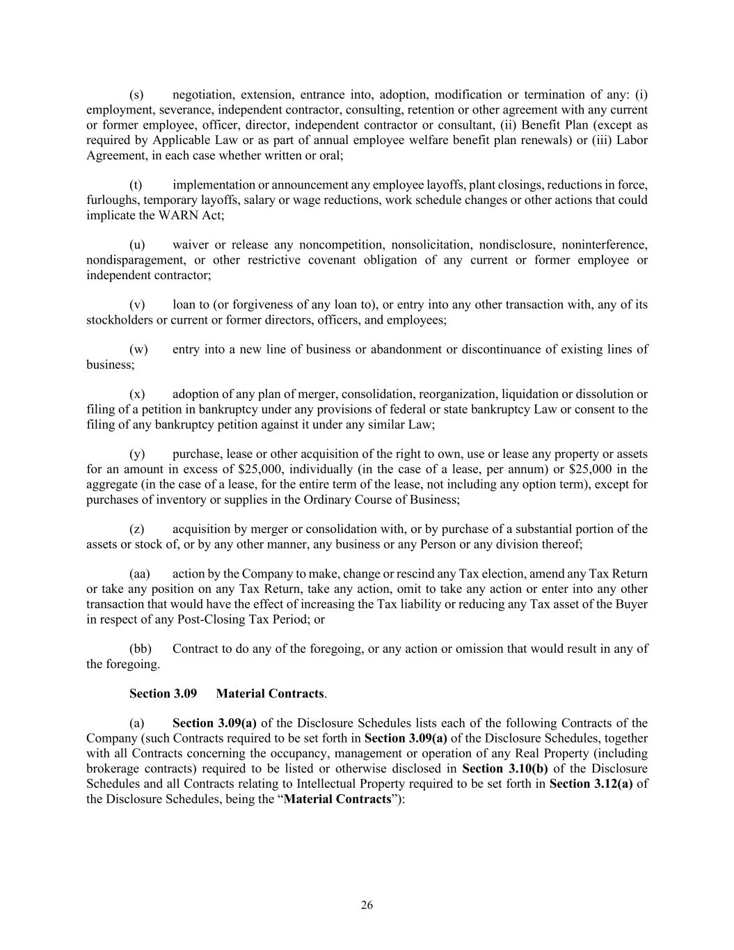 26 (s) negotiation, extension, entrance into, adoption, modification or termination of any: (i) employment, severance, independent contractor, consulting, retention or other agreement with any current or former employee, officer, director, independent contractor or consultant, (ii) Benefit Plan (except as required by Applicable Law or as part of annual employee welfare benefit plan renewals) or (iii) Labor Agreement, in each case whether written or oral; (t) implementation or announcement any employee layoffs, plant closings, reductions in force, furloughs, temporary layoffs, salary or wage reductions, work schedule changes or other actions that could implicate the WARN Act; (u) waiver or release any noncompetition, nonsolicitation, nondisclosure, noninterference, nondisparagement, or other restrictive covenant obligation of any current or former employee or independent contractor; (v) loan to (or forgiveness of any loan to), or entry into any other transaction with, any of its stockholders or current or former directors, officers, and employees; (w) entry into a new line of business or abandonment or discontinuance of existing lines of business; (x) adoption of any plan of merger, consolidation, reorganization, liquidation or dissolution or filing of a petition in bankruptcy under any provisions of federal or state bankruptcy Law or consent to the filing of any bankruptcy petition against it under any similar Law; (y) purchase, lease or other acquisition of the right to own, use or lease any property or assets for an amount in excess of $25,000, individually (in the case of a lease, per annum) or $25,000 in the aggregate (in the case of a lease, for the entire term of the lease, not including any option term), except for purchases of inventory or supplies in the Ordinary Course of Business; (z) acquisition by merger or consolidation with, or by purchase of a substantial portion of the assets or stock of, or by any other manner, any business or any Person or any division thereof; (aa) action by the Company to make, change or rescind any Tax election, amend any Tax Return or take any position on any Tax Return, take any action, omit to take any action or enter into any other transaction that would have the effect of increasing the Tax liability or reducing any Tax asset of the Buyer in respect of any Post-Closing Tax Period; or (bb) Contract to do any of the foregoing, or any action or omission that would result in any of the foregoing. Section 3.09 Material Contracts. (a) Section 3.09(a) of the Disclosure Schedules lists each of the following Contracts of the Company (such Contracts required to be set forth in Section 3.09(a) of the Disclosure Schedules, together with all Contracts concerning the occupancy, management or operation of any Real Property (including brokerage contracts) required to be listed or otherwise disclosed in Section 3.10(b) of the Disclosure Schedules and all Contracts relating to Intellectual Property required to be set forth in Section 3.12(a) of the Disclosure Schedules, being the “Material Contracts”):