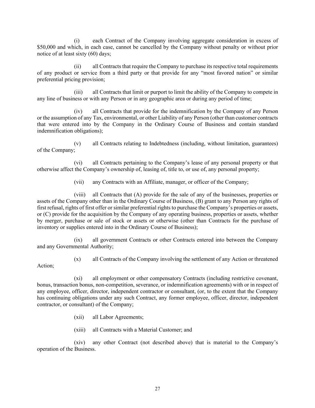 27 (i) each Contract of the Company involving aggregate consideration in excess of $50,000 and which, in each case, cannot be cancelled by the Company without penalty or without prior notice of at least sixty (60) days; (ii) all Contracts that require the Company to purchase its respective total requirements of any product or service from a third party or that provide for any “most favored nation” or similar preferential pricing provision; (iii) all Contracts that limit or purport to limit the ability of the Company to compete in any line of business or with any Person or in any geographic area or during any period of time; (iv) all Contracts that provide for the indemnification by the Company of any Person or the assumption of any Tax, environmental, or other Liability of any Person (other than customer contracts that were entered into by the Company in the Ordinary Course of Business and contain standard indemnification obligations); (v) all Contracts relating to Indebtedness (including, without limitation, guarantees) of the Company; (vi) all Contracts pertaining to the Company’s lease of any personal property or that otherwise affect the Company’s ownership of, leasing of, title to, or use of, any personal property; (vii) any Contracts with an Affiliate, manager, or officer of the Company; (viii) all Contracts that (A) provide for the sale of any of the businesses, properties or assets of the Company other than in the Ordinary Course of Business, (B) grant to any Person any rights of first refusal, rights of first offer or similar preferential rights to purchase the Company’s properties or assets, or (C) provide for the acquisition by the Company of any operating business, properties or assets, whether by merger, purchase or sale of stock or assets or otherwise (other than Contracts for the purchase of inventory or supplies entered into in the Ordinary Course of Business); (ix) all government Contracts or other Contracts entered into between the Company and any Governmental Authority; (x) all Contracts of the Company involving the settlement of any Action or threatened Action; (xi) all employment or other compensatory Contracts (including restrictive covenant, bonus, transaction bonus, non-competition, severance, or indemnification agreements) with or in respect of any employee, officer, director, independent contractor or consultant, (or, to the extent that the Company has continuing obligations under any such Contract, any former employee, officer, director, independent contractor, or consultant) of the Company; (xii) all Labor Agreements; (xiii) all Contracts with a Material Customer; and (xiv) any other Contract (not described above) that is material to the Company’s operation of the Business.