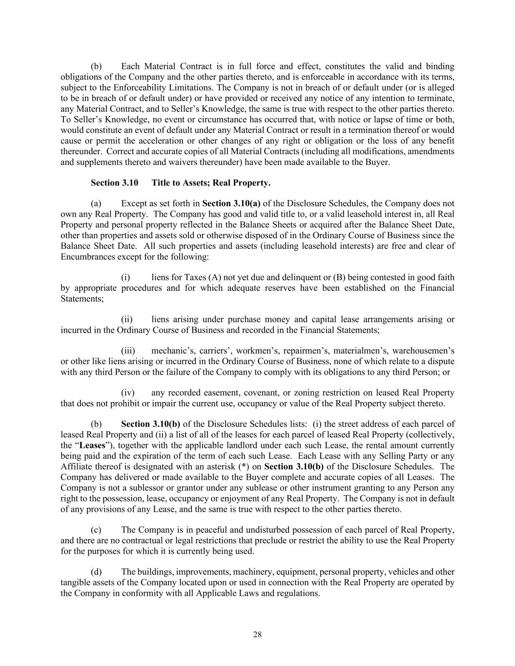 28 (b) Each Material Contract is in full force and effect, constitutes the valid and binding obligations of the Company and the other parties thereto, and is enforceable in accordance with its terms, subject to the Enforceability Limitations. The Company is not in breach of or default under (or is alleged to be in breach of or default under) or have provided or received any notice of any intention to terminate, any Material Contract, and to Seller’s Knowledge, the same is true with respect to the other parties thereto. To Seller’s Knowledge, no event or circumstance has occurred that, with notice or lapse of time or both, would constitute an event of default under any Material Contract or result in a termination thereof or would cause or permit the acceleration or other changes of any right or obligation or the loss of any benefit thereunder. Correct and accurate copies of all Material Contracts (including all modifications, amendments and supplements thereto and waivers thereunder) have been made available to the Buyer. Section 3.10 Title to Assets; Real Property. (a) Except as set forth in Section 3.10(a) of the Disclosure Schedules, the Company does not own any Real Property. The Company has good and valid title to, or a valid leasehold interest in, all Real Property and personal property reflected in the Balance Sheets or acquired after the Balance Sheet Date, other than properties and assets sold or otherwise disposed of in the Ordinary Course of Business since the Balance Sheet Date. All such properties and assets (including leasehold interests) are free and clear of Encumbrances except for the following: (i) liens for Taxes (A) not yet due and delinquent or (B) being contested in good faith by appropriate procedures and for which adequate reserves have been established on the Financial Statements; (ii) liens arising under purchase money and capital lease arrangements arising or incurred in the Ordinary Course of Business and recorded in the Financial Statements; (iii) mechanic’s, carriers’, workmen’s, repairmen’s, materialmen’s, warehousemen’s or other like liens arising or incurred in the Ordinary Course of Business, none of which relate to a dispute with any third Person or the failure of the Company to comply with its obligations to any third Person; or (iv) any recorded easement, covenant, or zoning restriction on leased Real Property that does not prohibit or impair the current use, occupancy or value of the Real Property subject thereto. (b) Section 3.10(b) of the Disclosure Schedules lists: (i) the street address of each parcel of leased Real Property and (ii) a list of all of the leases for each parcel of leased Real Property (collectively, the “Leases”), together with the applicable landlord under each such Lease, the rental amount currently being paid and the expiration of the term of each such Lease. Each Lease with any Selling Party or any Affiliate thereof is designated with an asterisk (*) on Section 3.10(b) of the Disclosure Schedules. The Company has delivered or made available to the Buyer complete and accurate copies of all Leases. The Company is not a sublessor or grantor under any sublease or other instrument granting to any Person any right to the possession, lease, occupancy or enjoyment of any Real Property. The Company is not in default of any provisions of any Lease, and the same is true with respect to the other parties thereto. (c) The Company is in peaceful and undisturbed possession of each parcel of Real Property, and there are no contractual or legal restrictions that preclude or restrict the ability to use the Real Property for the purposes for which it is currently being used. (d) The buildings, improvements, machinery, equipment, personal property, vehicles and other tangible assets of the Company located upon or used in connection with the Real Property are operated by the Company in conformity with all Applicable Laws and regulations.