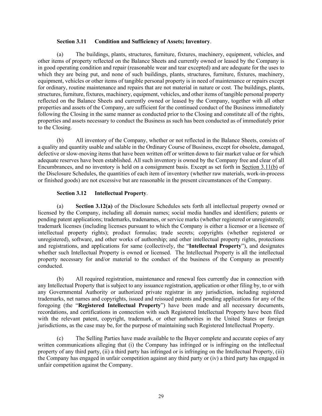 29 Section 3.11 Condition and Sufficiency of Assets; Inventory. (a) The buildings, plants, structures, furniture, fixtures, machinery, equipment, vehicles, and other items of property reflected on the Balance Sheets and currently owned or leased by the Company is in good operating condition and repair (reasonable wear and tear excepted) and are adequate for the uses to which they are being put, and none of such buildings, plants, structures, furniture, fixtures, machinery, equipment, vehicles or other items of tangible personal property is in need of maintenance or repairs except for ordinary, routine maintenance and repairs that are not material in nature or cost. The buildings, plants, structures, furniture, fixtures, machinery, equipment, vehicles, and other items of tangible personal property reflected on the Balance Sheets and currently owned or leased by the Company, together with all other properties and assets of the Company, are sufficient for the continued conduct of the Business immediately following the Closing in the same manner as conducted prior to the Closing and constitute all of the rights, properties and assets necessary to conduct the Business as such has been conducted as of immediately prior to the Closing. (b) All inventory of the Company, whether or not reflected in the Balance Sheets, consists of a quality and quantity usable and salable in the Ordinary Course of Business, except for obsolete, damaged, defective or slow-moving items that have been written off or written down to fair market value or for which adequate reserves have been established. All such inventory is owned by the Company free and clear of all Encumbrances, and no inventory is held on a consignment basis. Except as set forth in Section 3.11(b) of the Disclosure Schedules, the quantities of each item of inventory (whether raw materials, work-in-process or finished goods) are not excessive but are reasonable in the present circumstances of the Company. Section 3.12 Intellectual Property. (a) Section 3.12(a) of the Disclosure Schedules sets forth all intellectual property owned or licensed by the Company, including all domain names; social media handles and identifiers; patents or pending patent applications; trademarks, tradenames, or service marks (whether registered or unregistered); trademark licenses (including licenses pursuant to which the Company is either a licensor or a licensee of intellectual property rights); product formulas; trade secrets; copyrights (whether registered or unregistered), software, and other works of authorship; and other intellectual property rights, protections and registrations, and applications for same (collectively, the “Intellectual Property”), and designates whether such Intellectual Property is owned or licensed. The Intellectual Property is all the intellectual property necessary for and/or material to the conduct of the business of the Company as presently conducted. (b) All required registration, maintenance and renewal fees currently due in connection with any Intellectual Property that is subject to any issuance registration, application or other filing by, to or with any Governmental Authority or authorized private registrar in any jurisdiction, including registered trademarks, net names and copyrights, issued and reissued patents and pending applications for any of the foregoing (the “Registered Intellectual Property”) have been made and all necessary documents, recordations, and certifications in connection with such Registered Intellectual Property have been filed with the relevant patent, copyright, trademark, or other authorities in the United States or foreign jurisdictions, as the case may be, for the purpose of maintaining such Registered Intellectual Property. (c) The Selling Parties have made available to the Buyer complete and accurate copies of any written communications alleging that (i) the Company has infringed or is infringing on the intellectual property of any third party, (ii) a third party has infringed or is infringing on the Intellectual Property, (iii) the Company has engaged in unfair competition against any third party or (iv) a third party has engaged in unfair competition against the Company.