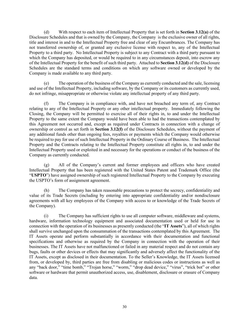 30 (d) With respect to each item of Intellectual Property that is set forth in Section 3.12(a) of the Disclosure Schedules and that is owned by the Company, the Company is the exclusive owner of all rights, title and interest in and to the Intellectual Property free and clear of any Encumbrances. The Company has not transferred ownership of, or granted any exclusive license with respect to, any of the Intellectual Property to a third party. No Intellectual Property is subject to any Contract with a third party pursuant to which the Company has deposited, or would be required to in any circumstances deposit, into escrow any of the Intellectual Property for the benefit of such third party. Attached to Section 3.12(d) of the Disclosure Schedules are the standard terms and conditions on which any software owned or developed by the Company is made available to any third party. (e) The operation of the business of the Company as currently conducted and the sale, licensing and use of the Intellectual Property, including software, by the Company or its customers as currently used, do not infringe, misappropriate or otherwise violate any intellectual property of any third party. (f) The Company is in compliance with, and have not breached any term of, any Contract relating to any of the Intellectual Property or any other intellectual property. Immediately following the Closing, the Company will be permitted to exercise all of their rights in, to and under the Intellectual Property to the same extent the Company would have been able to had the transactions contemplated by this Agreement not occurred and, except as required under Contracts in connection with a change of ownership or control as set forth in Section 3.12(f) of the Disclosure Schedules, without the payment of any additional funds other than ongoing fees, royalties or payments which the Company would otherwise be required to pay for use of such Intellectual Property in the Ordinary Course of Business. The Intellectual Property and the Contracts relating to the Intellectual Property constitute all rights in, to and under the Intellectual Property used or exploited in and necessary for the operations or conduct of the business of the Company as currently conducted. (g) All of the Company’s current and former employees and officers who have created Intellectual Property that has been registered with the United States Patent and Trademark Office (the “USPTO”) have assigned ownership of such registered Intellectual Property to the Company by executing the USPTO’s form of assignment agreement. (h) The Company has taken reasonable precautions to protect the secrecy, confidentiality and value of its Trade Secrets (including by entering into appropriate confidentiality and/or nondisclosure agreements with all key employees of the Company with access to or knowledge of the Trade Secrets of the Company). (i) The Company has sufficient rights to use all computer software, middleware and systems, hardware, information technology equipment and associated documentation used or held for use in connection with the operation of its businesses as presently conducted (the “IT Assets”), all of which rights shall survive unchanged upon the consummation of the transactions contemplated by this Agreement. The IT Assets operate and perform substantially in accordance with their documentation and functional specifications and otherwise as required by the Company in connection with the operation of their businesses. The IT Assets have not malfunctioned or failed in any material respect and do not contain any bugs, faults or other devices or effects that may significantly and adversely affect the functionality of the IT Assets, except as disclosed in their documentation. To the Seller’s Knowledge, the IT Assets licensed from, or developed by, third parties are free from disabling or malicious codes or instructions as well as any “back door,” “time bomb,” “Trojan horse,” “worm,” “drop dead device,” “virus”, “trick bot” or other software or hardware that permit unauthorized access, use, disablement, disclosure or erasure of Company data.