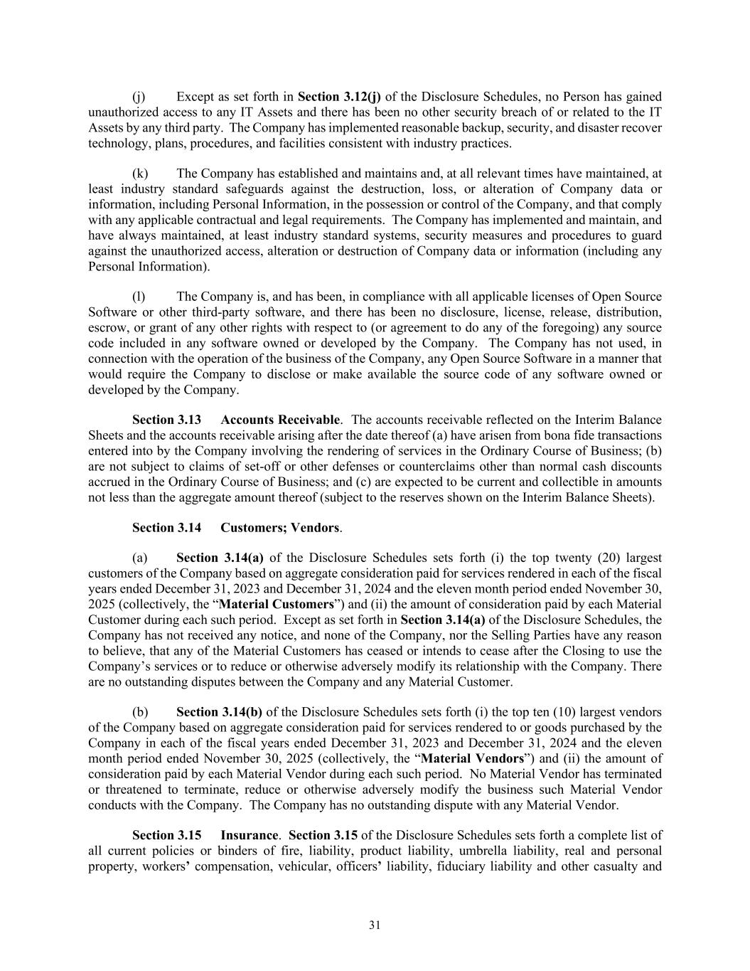 31 (j) Except as set forth in Section 3.12(j) of the Disclosure Schedules, no Person has gained unauthorized access to any IT Assets and there has been no other security breach of or related to the IT Assets by any third party. The Company has implemented reasonable backup, security, and disaster recover technology, plans, procedures, and facilities consistent with industry practices. (k) The Company has established and maintains and, at all relevant times have maintained, at least industry standard safeguards against the destruction, loss, or alteration of Company data or information, including Personal Information, in the possession or control of the Company, and that comply with any applicable contractual and legal requirements. The Company has implemented and maintain, and have always maintained, at least industry standard systems, security measures and procedures to guard against the unauthorized access, alteration or destruction of Company data or information (including any Personal Information). (l) The Company is, and has been, in compliance with all applicable licenses of Open Source Software or other third-party software, and there has been no disclosure, license, release, distribution, escrow, or grant of any other rights with respect to (or agreement to do any of the foregoing) any source code included in any software owned or developed by the Company. The Company has not used, in connection with the operation of the business of the Company, any Open Source Software in a manner that would require the Company to disclose or make available the source code of any software owned or developed by the Company. Section 3.13 Accounts Receivable. The accounts receivable reflected on the Interim Balance Sheets and the accounts receivable arising after the date thereof (a) have arisen from bona fide transactions entered into by the Company involving the rendering of services in the Ordinary Course of Business; (b) are not subject to claims of set-off or other defenses or counterclaims other than normal cash discounts accrued in the Ordinary Course of Business; and (c) are expected to be current and collectible in amounts not less than the aggregate amount thereof (subject to the reserves shown on the Interim Balance Sheets). Section 3.14 Customers; Vendors. (a) Section 3.14(a) of the Disclosure Schedules sets forth (i) the top twenty (20) largest customers of the Company based on aggregate consideration paid for services rendered in each of the fiscal years ended December 31, 2023 and December 31, 2024 and the eleven month period ended November 30, 2025 (collectively, the “Material Customers”) and (ii) the amount of consideration paid by each Material Customer during each such period. Except as set forth in Section 3.14(a) of the Disclosure Schedules, the Company has not received any notice, and none of the Company, nor the Selling Parties have any reason to believe, that any of the Material Customers has ceased or intends to cease after the Closing to use the Company’s services or to reduce or otherwise adversely modify its relationship with the Company. There are no outstanding disputes between the Company and any Material Customer. (b) Section 3.14(b) of the Disclosure Schedules sets forth (i) the top ten (10) largest vendors of the Company based on aggregate consideration paid for services rendered to or goods purchased by the Company in each of the fiscal years ended December 31, 2023 and December 31, 2024 and the eleven month period ended November 30, 2025 (collectively, the “Material Vendors”) and (ii) the amount of consideration paid by each Material Vendor during each such period. No Material Vendor has terminated or threatened to terminate, reduce or otherwise adversely modify the business such Material Vendor conducts with the Company. The Company has no outstanding dispute with any Material Vendor. Section 3.15 Insurance. Section 3.15 of the Disclosure Schedules sets forth a complete list of all current policies or binders of fire, liability, product liability, umbrella liability, real and personal property, workers’ compensation, vehicular, officers’ liability, fiduciary liability and other casualty and