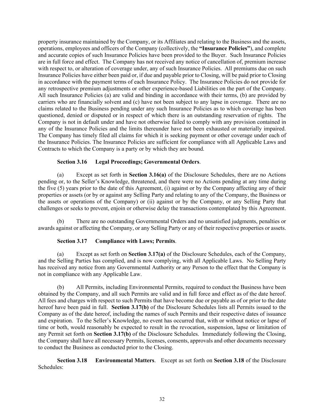 32 property insurance maintained by the Company, or its Affiliates and relating to the Business and the assets, operations, employees and officers of the Company (collectively, the “Insurance Policies”), and complete and accurate copies of such Insurance Policies have been provided to the Buyer. Such Insurance Policies are in full force and effect. The Company has not received any notice of cancellation of, premium increase with respect to, or alteration of coverage under, any of such Insurance Policies. All premiums due on such Insurance Policies have either been paid or, if due and payable prior to Closing, will be paid prior to Closing in accordance with the payment terms of each Insurance Policy. The Insurance Policies do not provide for any retrospective premium adjustments or other experience-based Liabilities on the part of the Company. All such Insurance Policies (a) are valid and binding in accordance with their terms, (b) are provided by carriers who are financially solvent and (c) have not been subject to any lapse in coverage. There are no claims related to the Business pending under any such Insurance Policies as to which coverage has been questioned, denied or disputed or in respect of which there is an outstanding reservation of rights. The Company is not in default under and have not otherwise failed to comply with any provision contained in any of the Insurance Policies and the limits thereunder have not been exhausted or materially impaired. The Company has timely filed all claims for which it is seeking payment or other coverage under each of the Insurance Policies. The Insurance Policies are sufficient for compliance with all Applicable Laws and Contracts to which the Company is a party or by which they are bound. Section 3.16 Legal Proceedings; Governmental Orders. (a) Except as set forth in Section 3.16(a) of the Disclosure Schedules, there are no Actions pending or, to the Seller’s Knowledge, threatened, and there were no Actions pending at any time during the five (5) years prior to the date of this Agreement, (i) against or by the Company affecting any of their properties or assets (or by or against any Selling Party and relating to any of the Company, the Business or the assets or operations of the Company) or (ii) against or by the Company, or any Selling Party that challenges or seeks to prevent, enjoin or otherwise delay the transactions contemplated by this Agreement. (b) There are no outstanding Governmental Orders and no unsatisfied judgments, penalties or awards against or affecting the Company, or any Selling Party or any of their respective properties or assets. Section 3.17 Compliance with Laws; Permits. (a) Except as set forth on Section 3.17(a) of the Disclosure Schedules, each of the Company, and the Selling Parties has complied, and is now complying, with all Applicable Laws. No Selling Party has received any notice from any Governmental Authority or any Person to the effect that the Company is not in compliance with any Applicable Law. (b) All Permits, including Environmental Permits, required to conduct the Business have been obtained by the Company, and all such Permits are valid and in full force and effect as of the date hereof. All fees and charges with respect to such Permits that have become due or payable as of or prior to the date hereof have been paid in full. Section 3.17(b) of the Disclosure Schedules lists all Permits issued to the Company as of the date hereof, including the names of such Permits and their respective dates of issuance and expiration. To the Seller’s Knowledge, no event has occurred that, with or without notice or lapse of time or both, would reasonably be expected to result in the revocation, suspension, lapse or limitation of any Permit set forth on Section 3.17(b) of the Disclosure Schedules. Immediately following the Closing, the Company shall have all necessary Permits, licenses, consents, approvals and other documents necessary to conduct the Business as conducted prior to the Closing. Section 3.18 Environmental Matters. Except as set forth on Section 3.18 of the Disclosure Schedules: