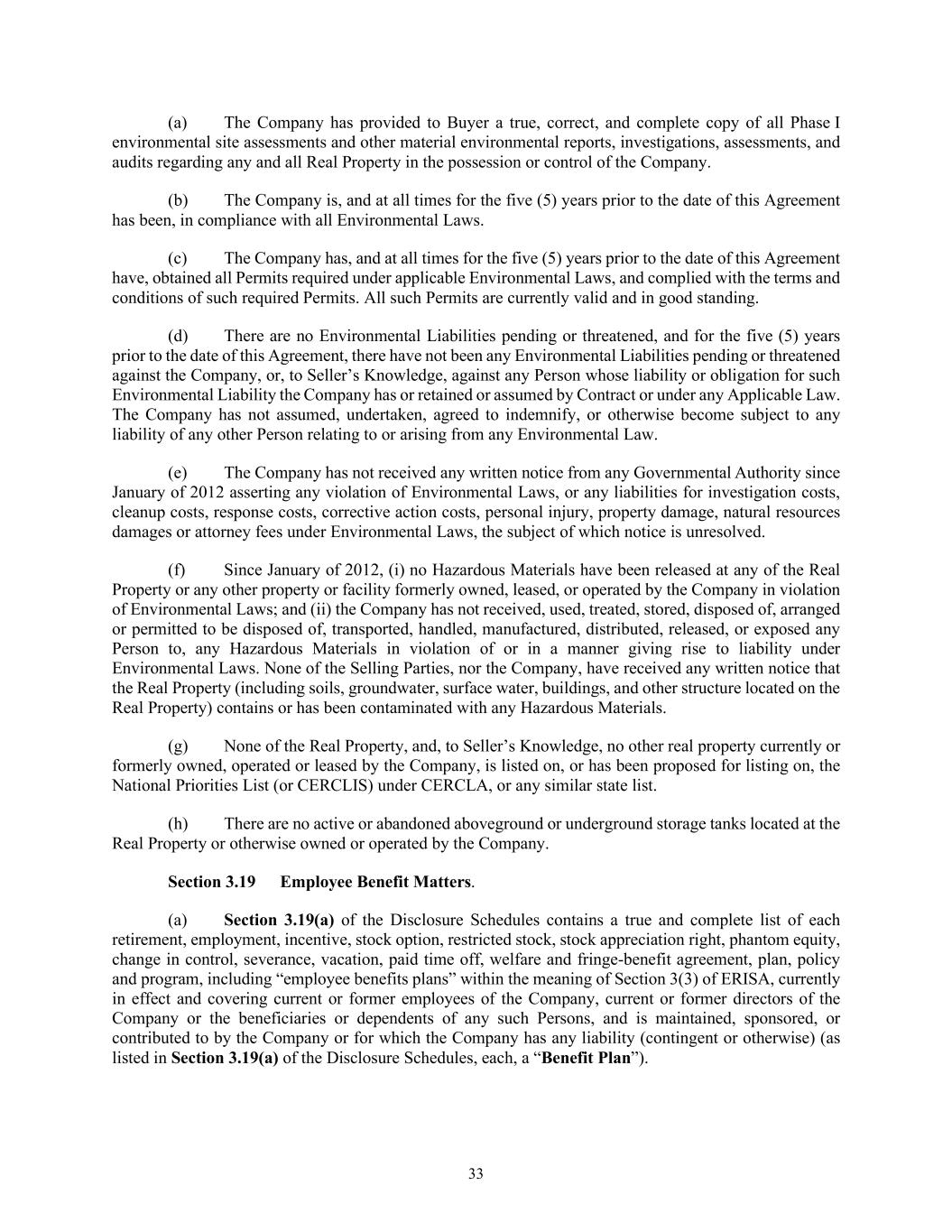 33 (a) The Company has provided to Buyer a true, correct, and complete copy of all Phase I environmental site assessments and other material environmental reports, investigations, assessments, and audits regarding any and all Real Property in the possession or control of the Company. (b) The Company is, and at all times for the five (5) years prior to the date of this Agreement has been, in compliance with all Environmental Laws. (c) The Company has, and at all times for the five (5) years prior to the date of this Agreement have, obtained all Permits required under applicable Environmental Laws, and complied with the terms and conditions of such required Permits. All such Permits are currently valid and in good standing. (d) There are no Environmental Liabilities pending or threatened, and for the five (5) years prior to the date of this Agreement, there have not been any Environmental Liabilities pending or threatened against the Company, or, to Seller’s Knowledge, against any Person whose liability or obligation for such Environmental Liability the Company has or retained or assumed by Contract or under any Applicable Law. The Company has not assumed, undertaken, agreed to indemnify, or otherwise become subject to any liability of any other Person relating to or arising from any Environmental Law. (e) The Company has not received any written notice from any Governmental Authority since January of 2012 asserting any violation of Environmental Laws, or any liabilities for investigation costs, cleanup costs, response costs, corrective action costs, personal injury, property damage, natural resources damages or attorney fees under Environmental Laws, the subject of which notice is unresolved. (f) Since January of 2012, (i) no Hazardous Materials have been released at any of the Real Property or any other property or facility formerly owned, leased, or operated by the Company in violation of Environmental Laws; and (ii) the Company has not received, used, treated, stored, disposed of, arranged or permitted to be disposed of, transported, handled, manufactured, distributed, released, or exposed any Person to, any Hazardous Materials in violation of or in a manner giving rise to liability under Environmental Laws. None of the Selling Parties, nor the Company, have received any written notice that the Real Property (including soils, groundwater, surface water, buildings, and other structure located on the Real Property) contains or has been contaminated with any Hazardous Materials. (g) None of the Real Property, and, to Seller’s Knowledge, no other real property currently or formerly owned, operated or leased by the Company, is listed on, or has been proposed for listing on, the National Priorities List (or CERCLIS) under CERCLA, or any similar state list. (h) There are no active or abandoned aboveground or underground storage tanks located at the Real Property or otherwise owned or operated by the Company. Section 3.19 Employee Benefit Matters. (a) Section 3.19(a) of the Disclosure Schedules contains a true and complete list of each retirement, employment, incentive, stock option, restricted stock, stock appreciation right, phantom equity, change in control, severance, vacation, paid time off, welfare and fringe-benefit agreement, plan, policy and program, including “employee benefits plans” within the meaning of Section 3(3) of ERISA, currently in effect and covering current or former employees of the Company, current or former directors of the Company or the beneficiaries or dependents of any such Persons, and is maintained, sponsored, or contributed to by the Company or for which the Company has any liability (contingent or otherwise) (as listed in Section 3.19(a) of the Disclosure Schedules, each, a “Benefit Plan”).