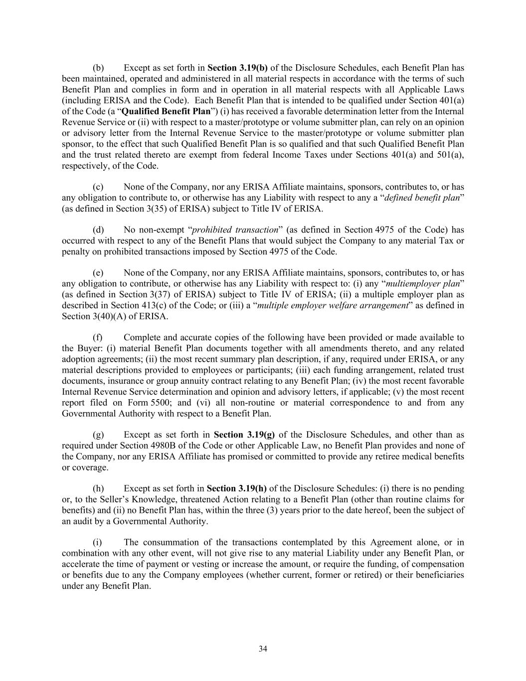 34 (b) Except as set forth in Section 3.19(b) of the Disclosure Schedules, each Benefit Plan has been maintained, operated and administered in all material respects in accordance with the terms of such Benefit Plan and complies in form and in operation in all material respects with all Applicable Laws (including ERISA and the Code). Each Benefit Plan that is intended to be qualified under Section 401(a) of the Code (a “Qualified Benefit Plan”) (i) has received a favorable determination letter from the Internal Revenue Service or (ii) with respect to a master/prototype or volume submitter plan, can rely on an opinion or advisory letter from the Internal Revenue Service to the master/prototype or volume submitter plan sponsor, to the effect that such Qualified Benefit Plan is so qualified and that such Qualified Benefit Plan and the trust related thereto are exempt from federal Income Taxes under Sections 401(a) and 501(a), respectively, of the Code. (c) None of the Company, nor any ERISA Affiliate maintains, sponsors, contributes to, or has any obligation to contribute to, or otherwise has any Liability with respect to any a “defined benefit plan” (as defined in Section 3(35) of ERISA) subject to Title IV of ERISA. (d) No non-exempt “prohibited transaction” (as defined in Section 4975 of the Code) has occurred with respect to any of the Benefit Plans that would subject the Company to any material Tax or penalty on prohibited transactions imposed by Section 4975 of the Code. (e) None of the Company, nor any ERISA Affiliate maintains, sponsors, contributes to, or has any obligation to contribute, or otherwise has any Liability with respect to: (i) any “multiemployer plan” (as defined in Section 3(37) of ERISA) subject to Title IV of ERISA; (ii) a multiple employer plan as described in Section 413(c) of the Code; or (iii) a “multiple employer welfare arrangement” as defined in Section 3(40)(A) of ERISA. (f) Complete and accurate copies of the following have been provided or made available to the Buyer: (i) material Benefit Plan documents together with all amendments thereto, and any related adoption agreements; (ii) the most recent summary plan description, if any, required under ERISA, or any material descriptions provided to employees or participants; (iii) each funding arrangement, related trust documents, insurance or group annuity contract relating to any Benefit Plan; (iv) the most recent favorable Internal Revenue Service determination and opinion and advisory letters, if applicable; (v) the most recent report filed on Form 5500; and (vi) all non-routine or material correspondence to and from any Governmental Authority with respect to a Benefit Plan. (g) Except as set forth in Section 3.19(g) of the Disclosure Schedules, and other than as required under Section 4980B of the Code or other Applicable Law, no Benefit Plan provides and none of the Company, nor any ERISA Affiliate has promised or committed to provide any retiree medical benefits or coverage. (h) Except as set forth in Section 3.19(h) of the Disclosure Schedules: (i) there is no pending or, to the Seller’s Knowledge, threatened Action relating to a Benefit Plan (other than routine claims for benefits) and (ii) no Benefit Plan has, within the three (3) years prior to the date hereof, been the subject of an audit by a Governmental Authority. (i) The consummation of the transactions contemplated by this Agreement alone, or in combination with any other event, will not give rise to any material Liability under any Benefit Plan, or accelerate the time of payment or vesting or increase the amount, or require the funding, of compensation or benefits due to any the Company employees (whether current, former or retired) or their beneficiaries under any Benefit Plan.