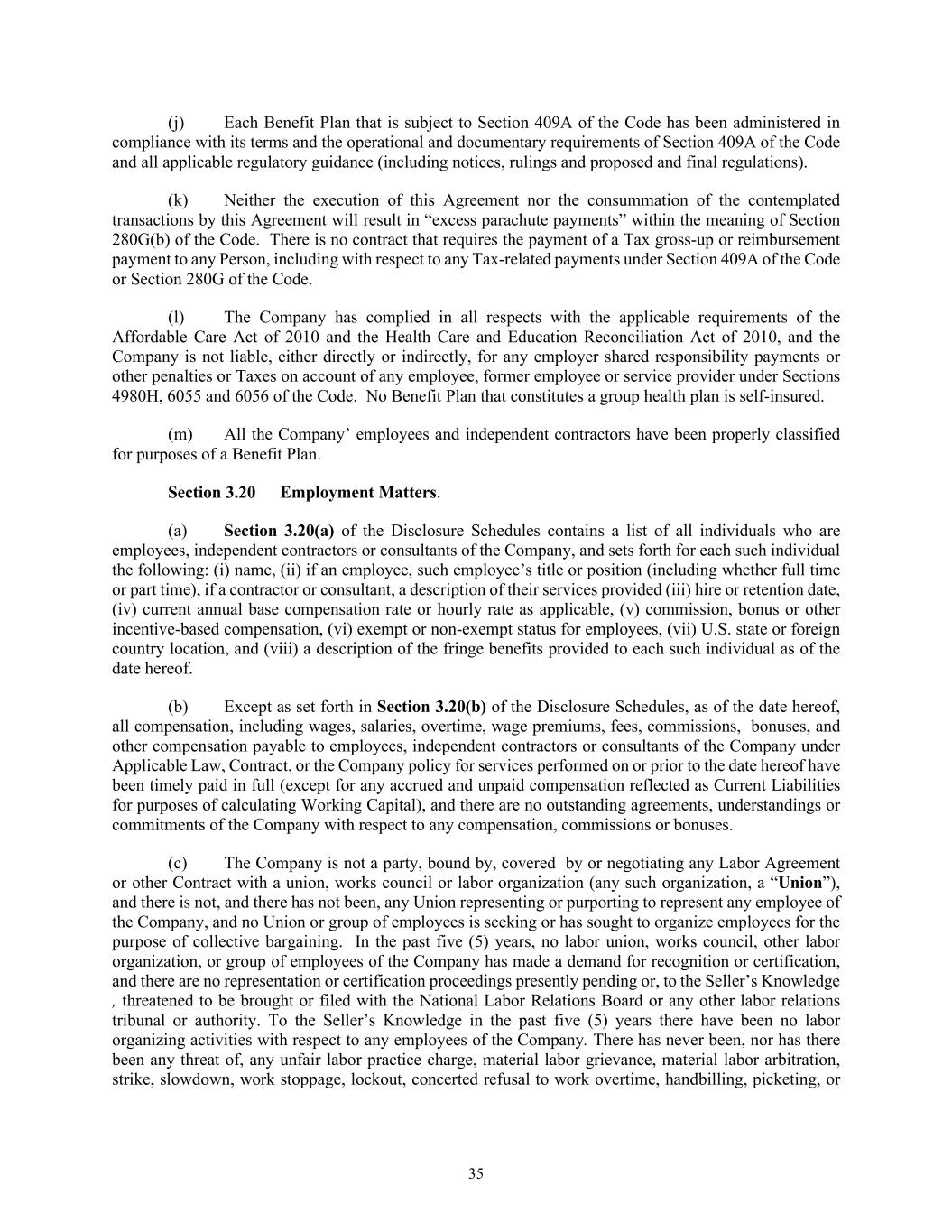 35 (j) Each Benefit Plan that is subject to Section 409A of the Code has been administered in compliance with its terms and the operational and documentary requirements of Section 409A of the Code and all applicable regulatory guidance (including notices, rulings and proposed and final regulations). (k) Neither the execution of this Agreement nor the consummation of the contemplated transactions by this Agreement will result in “excess parachute payments” within the meaning of Section 280G(b) of the Code. There is no contract that requires the payment of a Tax gross-up or reimbursement payment to any Person, including with respect to any Tax-related payments under Section 409A of the Code or Section 280G of the Code. (l) The Company has complied in all respects with the applicable requirements of the Affordable Care Act of 2010 and the Health Care and Education Reconciliation Act of 2010, and the Company is not liable, either directly or indirectly, for any employer shared responsibility payments or other penalties or Taxes on account of any employee, former employee or service provider under Sections 4980H, 6055 and 6056 of the Code. No Benefit Plan that constitutes a group health plan is self-insured. (m) All the Company’ employees and independent contractors have been properly classified for purposes of a Benefit Plan. Section 3.20 Employment Matters. (a) Section 3.20(a) of the Disclosure Schedules contains a list of all individuals who are employees, independent contractors or consultants of the Company, and sets forth for each such individual the following: (i) name, (ii) if an employee, such employee’s title or position (including whether full time or part time), if a contractor or consultant, a description of their services provided (iii) hire or retention date, (iv) current annual base compensation rate or hourly rate as applicable, (v) commission, bonus or other incentive-based compensation, (vi) exempt or non-exempt status for employees, (vii) U.S. state or foreign country location, and (viii) a description of the fringe benefits provided to each such individual as of the date hereof. (b) Except as set forth in Section 3.20(b) of the Disclosure Schedules, as of the date hereof, all compensation, including wages, salaries, overtime, wage premiums, fees, commissions, bonuses, and other compensation payable to employees, independent contractors or consultants of the Company under Applicable Law, Contract, or the Company policy for services performed on or prior to the date hereof have been timely paid in full (except for any accrued and unpaid compensation reflected as Current Liabilities for purposes of calculating Working Capital), and there are no outstanding agreements, understandings or commitments of the Company with respect to any compensation, commissions or bonuses. (c) The Company is not a party, bound by, covered by or negotiating any Labor Agreement or other Contract with a union, works council or labor organization (any such organization, a “Union”), and there is not, and there has not been, any Union representing or purporting to represent any employee of the Company, and no Union or group of employees is seeking or has sought to organize employees for the purpose of collective bargaining. In the past five (5) years, no labor union, works council, other labor organization, or group of employees of the Company has made a demand for recognition or certification, and there are no representation or certification proceedings presently pending or, to the Seller’s Knowledge , threatened to be brought or filed with the National Labor Relations Board or any other labor relations tribunal or authority. To the Seller’s Knowledge in the past five (5) years there have been no labor organizing activities with respect to any employees of the Company. There has never been, nor has there been any threat of, any unfair labor practice charge, material labor grievance, material labor arbitration, strike, slowdown, work stoppage, lockout, concerted refusal to work overtime, handbilling, picketing, or