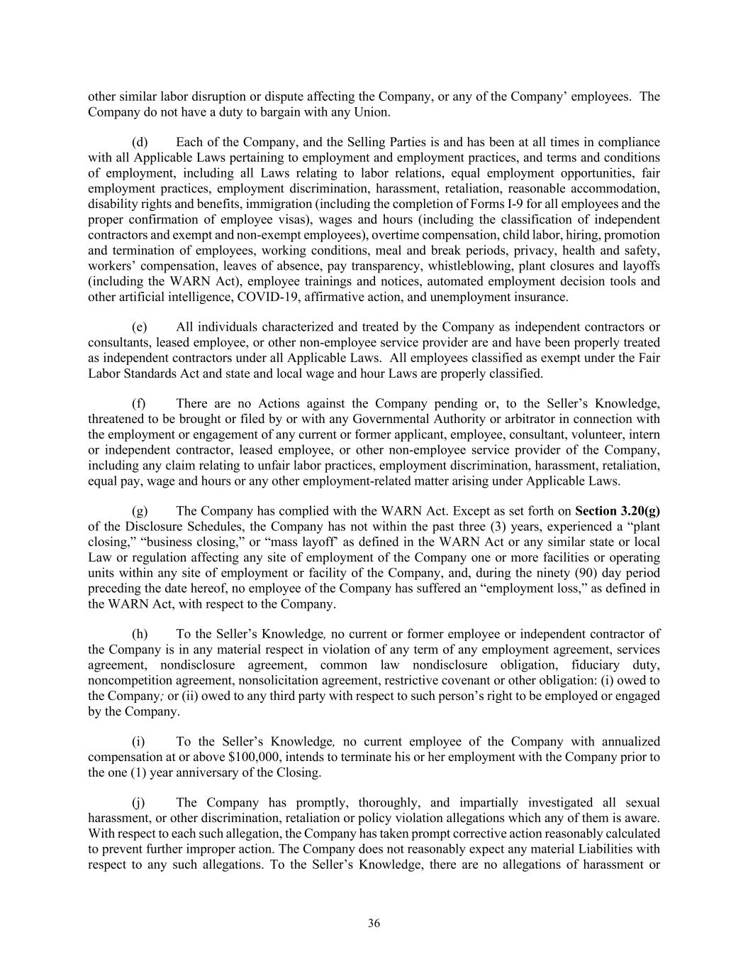 36 other similar labor disruption or dispute affecting the Company, or any of the Company’ employees. The Company do not have a duty to bargain with any Union. (d) Each of the Company, and the Selling Parties is and has been at all times in compliance with all Applicable Laws pertaining to employment and employment practices, and terms and conditions of employment, including all Laws relating to labor relations, equal employment opportunities, fair employment practices, employment discrimination, harassment, retaliation, reasonable accommodation, disability rights and benefits, immigration (including the completion of Forms I-9 for all employees and the proper confirmation of employee visas), wages and hours (including the classification of independent contractors and exempt and non-exempt employees), overtime compensation, child labor, hiring, promotion and termination of employees, working conditions, meal and break periods, privacy, health and safety, workers’ compensation, leaves of absence, pay transparency, whistleblowing, plant closures and layoffs (including the WARN Act), employee trainings and notices, automated employment decision tools and other artificial intelligence, COVID-19, affirmative action, and unemployment insurance. (e) All individuals characterized and treated by the Company as independent contractors or consultants, leased employee, or other non-employee service provider are and have been properly treated as independent contractors under all Applicable Laws. All employees classified as exempt under the Fair Labor Standards Act and state and local wage and hour Laws are properly classified. (f) There are no Actions against the Company pending or, to the Seller’s Knowledge, threatened to be brought or filed by or with any Governmental Authority or arbitrator in connection with the employment or engagement of any current or former applicant, employee, consultant, volunteer, intern or independent contractor, leased employee, or other non-employee service provider of the Company, including any claim relating to unfair labor practices, employment discrimination, harassment, retaliation, equal pay, wage and hours or any other employment-related matter arising under Applicable Laws. (g) The Company has complied with the WARN Act. Except as set forth on Section 3.20(g) of the Disclosure Schedules, the Company has not within the past three (3) years, experienced a “plant closing,” “business closing,” or “mass layoff’ as defined in the WARN Act or any similar state or local Law or regulation affecting any site of employment of the Company one or more facilities or operating units within any site of employment or facility of the Company, and, during the ninety (90) day period preceding the date hereof, no employee of the Company has suffered an “employment loss,” as defined in the WARN Act, with respect to the Company. (h) To the Seller’s Knowledge, no current or former employee or independent contractor of the Company is in any material respect in violation of any term of any employment agreement, services agreement, nondisclosure agreement, common law nondisclosure obligation, fiduciary duty, noncompetition agreement, nonsolicitation agreement, restrictive covenant or other obligation: (i) owed to the Company; or (ii) owed to any third party with respect to such person’s right to be employed or engaged by the Company. (i) To the Seller’s Knowledge, no current employee of the Company with annualized compensation at or above $100,000, intends to terminate his or her employment with the Company prior to the one (1) year anniversary of the Closing. (j) The Company has promptly, thoroughly, and impartially investigated all sexual harassment, or other discrimination, retaliation or policy violation allegations which any of them is aware. With respect to each such allegation, the Company has taken prompt corrective action reasonably calculated to prevent further improper action. The Company does not reasonably expect any material Liabilities with respect to any such allegations. To the Seller’s Knowledge, there are no allegations of harassment or