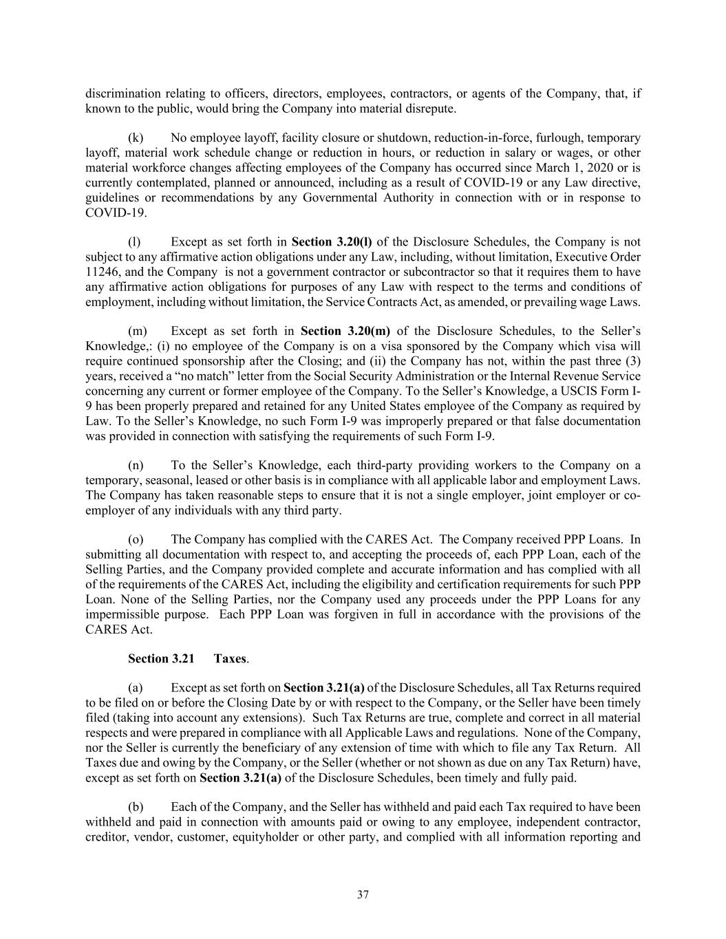 37 discrimination relating to officers, directors, employees, contractors, or agents of the Company, that, if known to the public, would bring the Company into material disrepute. (k) No employee layoff, facility closure or shutdown, reduction-in-force, furlough, temporary layoff, material work schedule change or reduction in hours, or reduction in salary or wages, or other material workforce changes affecting employees of the Company has occurred since March 1, 2020 or is currently contemplated, planned or announced, including as a result of COVID-19 or any Law directive, guidelines or recommendations by any Governmental Authority in connection with or in response to COVID-19. (l) Except as set forth in Section 3.20(l) of the Disclosure Schedules, the Company is not subject to any affirmative action obligations under any Law, including, without limitation, Executive Order 11246, and the Company is not a government contractor or subcontractor so that it requires them to have any affirmative action obligations for purposes of any Law with respect to the terms and conditions of employment, including without limitation, the Service Contracts Act, as amended, or prevailing wage Laws. (m) Except as set forth in Section 3.20(m) of the Disclosure Schedules, to the Seller’s Knowledge,: (i) no employee of the Company is on a visa sponsored by the Company which visa will require continued sponsorship after the Closing; and (ii) the Company has not, within the past three (3) years, received a “no match” letter from the Social Security Administration or the Internal Revenue Service concerning any current or former employee of the Company. To the Seller’s Knowledge, a USCIS Form I- 9 has been properly prepared and retained for any United States employee of the Company as required by Law. To the Seller’s Knowledge, no such Form I-9 was improperly prepared or that false documentation was provided in connection with satisfying the requirements of such Form I-9. (n) To the Seller’s Knowledge, each third-party providing workers to the Company on a temporary, seasonal, leased or other basis is in compliance with all applicable labor and employment Laws. The Company has taken reasonable steps to ensure that it is not a single employer, joint employer or co- employer of any individuals with any third party. (o) The Company has complied with the CARES Act. The Company received PPP Loans. In submitting all documentation with respect to, and accepting the proceeds of, each PPP Loan, each of the Selling Parties, and the Company provided complete and accurate information and has complied with all of the requirements of the CARES Act, including the eligibility and certification requirements for such PPP Loan. None of the Selling Parties, nor the Company used any proceeds under the PPP Loans for any impermissible purpose. Each PPP Loan was forgiven in full in accordance with the provisions of the CARES Act. Section 3.21 Taxes. (a) Except as set forth on Section 3.21(a) of the Disclosure Schedules, all Tax Returns required to be filed on or before the Closing Date by or with respect to the Company, or the Seller have been timely filed (taking into account any extensions). Such Tax Returns are true, complete and correct in all material respects and were prepared in compliance with all Applicable Laws and regulations. None of the Company, nor the Seller is currently the beneficiary of any extension of time with which to file any Tax Return. All Taxes due and owing by the Company, or the Seller (whether or not shown as due on any Tax Return) have, except as set forth on Section 3.21(a) of the Disclosure Schedules, been timely and fully paid. (b) Each of the Company, and the Seller has withheld and paid each Tax required to have been withheld and paid in connection with amounts paid or owing to any employee, independent contractor, creditor, vendor, customer, equityholder or other party, and complied with all information reporting and