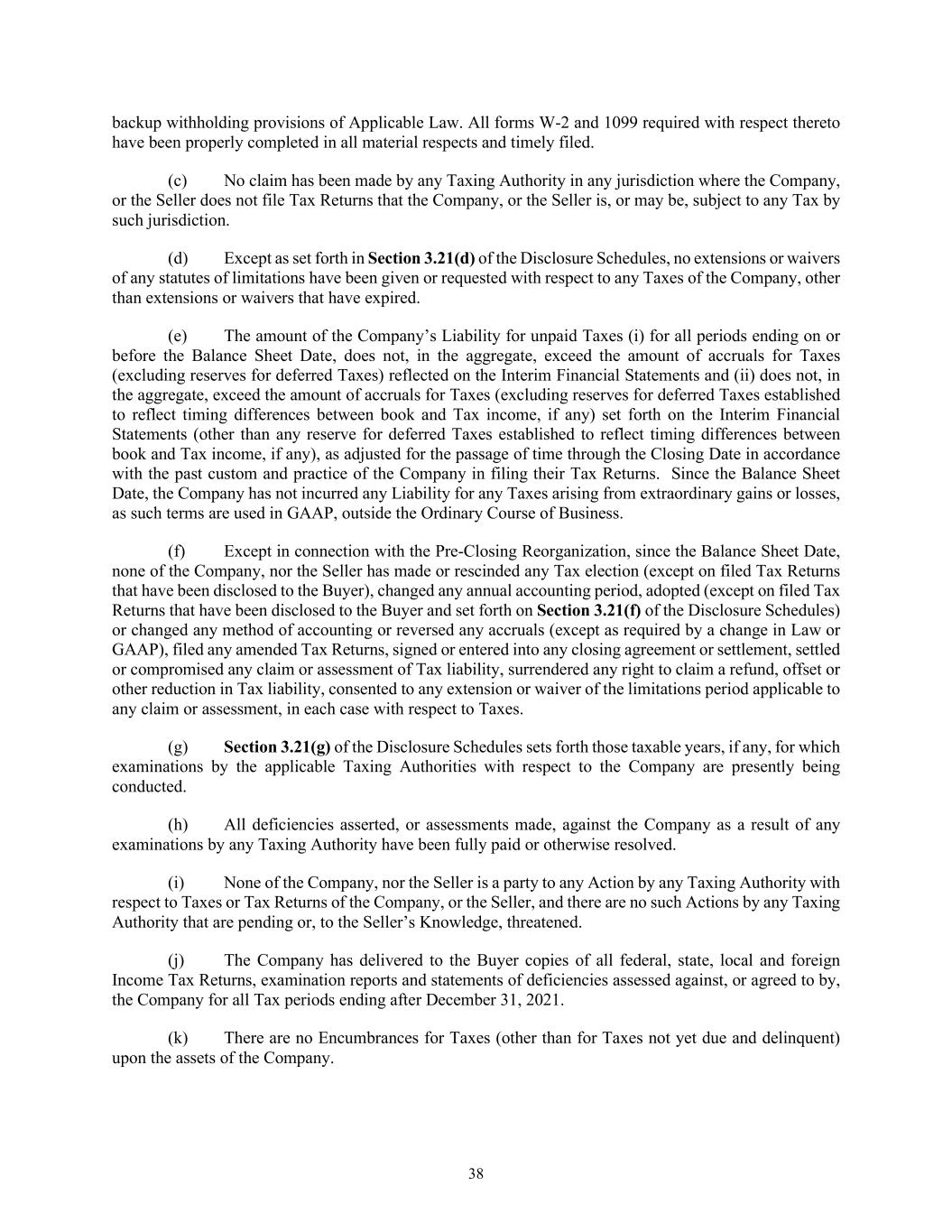 38 backup withholding provisions of Applicable Law. All forms W-2 and 1099 required with respect thereto have been properly completed in all material respects and timely filed. (c) No claim has been made by any Taxing Authority in any jurisdiction where the Company, or the Seller does not file Tax Returns that the Company, or the Seller is, or may be, subject to any Tax by such jurisdiction. (d) Except as set forth in Section 3.21(d) of the Disclosure Schedules, no extensions or waivers of any statutes of limitations have been given or requested with respect to any Taxes of the Company, other than extensions or waivers that have expired. (e) The amount of the Company’s Liability for unpaid Taxes (i) for all periods ending on or before the Balance Sheet Date, does not, in the aggregate, exceed the amount of accruals for Taxes (excluding reserves for deferred Taxes) reflected on the Interim Financial Statements and (ii) does not, in the aggregate, exceed the amount of accruals for Taxes (excluding reserves for deferred Taxes established to reflect timing differences between book and Tax income, if any) set forth on the Interim Financial Statements (other than any reserve for deferred Taxes established to reflect timing differences between book and Tax income, if any), as adjusted for the passage of time through the Closing Date in accordance with the past custom and practice of the Company in filing their Tax Returns. Since the Balance Sheet Date, the Company has not incurred any Liability for any Taxes arising from extraordinary gains or losses, as such terms are used in GAAP, outside the Ordinary Course of Business. (f) Except in connection with the Pre-Closing Reorganization, since the Balance Sheet Date, none of the Company, nor the Seller has made or rescinded any Tax election (except on filed Tax Returns that have been disclosed to the Buyer), changed any annual accounting period, adopted (except on filed Tax Returns that have been disclosed to the Buyer and set forth on Section 3.21(f) of the Disclosure Schedules) or changed any method of accounting or reversed any accruals (except as required by a change in Law or GAAP), filed any amended Tax Returns, signed or entered into any closing agreement or settlement, settled or compromised any claim or assessment of Tax liability, surrendered any right to claim a refund, offset or other reduction in Tax liability, consented to any extension or waiver of the limitations period applicable to any claim or assessment, in each case with respect to Taxes. (g) Section 3.21(g) of the Disclosure Schedules sets forth those taxable years, if any, for which examinations by the applicable Taxing Authorities with respect to the Company are presently being conducted. (h) All deficiencies asserted, or assessments made, against the Company as a result of any examinations by any Taxing Authority have been fully paid or otherwise resolved. (i) None of the Company, nor the Seller is a party to any Action by any Taxing Authority with respect to Taxes or Tax Returns of the Company, or the Seller, and there are no such Actions by any Taxing Authority that are pending or, to the Seller’s Knowledge, threatened. (j) The Company has delivered to the Buyer copies of all federal, state, local and foreign Income Tax Returns, examination reports and statements of deficiencies assessed against, or agreed to by, the Company for all Tax periods ending after December 31, 2021. (k) There are no Encumbrances for Taxes (other than for Taxes not yet due and delinquent) upon the assets of the Company.