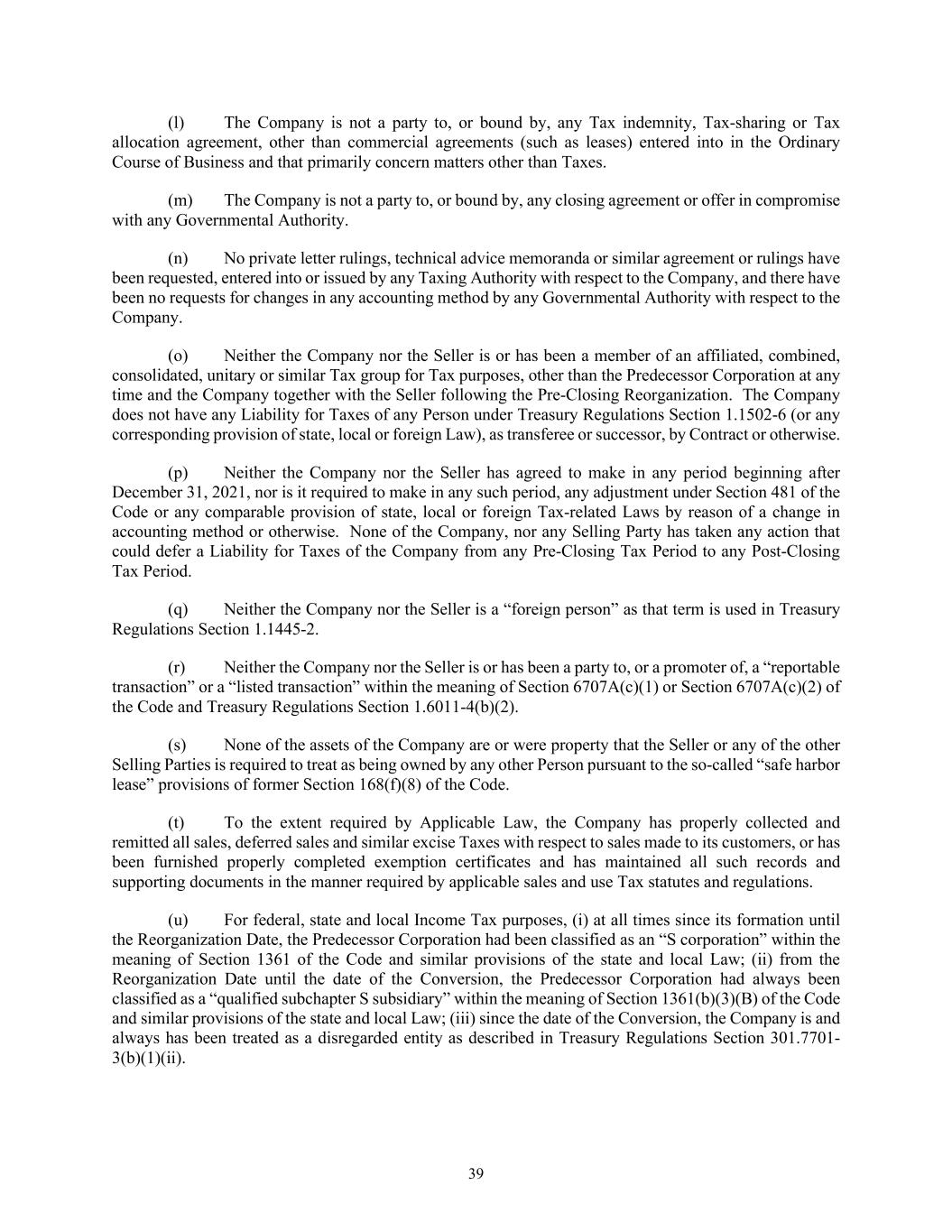 39 (l) The Company is not a party to, or bound by, any Tax indemnity, Tax-sharing or Tax allocation agreement, other than commercial agreements (such as leases) entered into in the Ordinary Course of Business and that primarily concern matters other than Taxes. (m) The Company is not a party to, or bound by, any closing agreement or offer in compromise with any Governmental Authority. (n) No private letter rulings, technical advice memoranda or similar agreement or rulings have been requested, entered into or issued by any Taxing Authority with respect to the Company, and there have been no requests for changes in any accounting method by any Governmental Authority with respect to the Company. (o) Neither the Company nor the Seller is or has been a member of an affiliated, combined, consolidated, unitary or similar Tax group for Tax purposes, other than the Predecessor Corporation at any time and the Company together with the Seller following the Pre-Closing Reorganization. The Company does not have any Liability for Taxes of any Person under Treasury Regulations Section 1.1502-6 (or any corresponding provision of state, local or foreign Law), as transferee or successor, by Contract or otherwise. (p) Neither the Company nor the Seller has agreed to make in any period beginning after December 31, 2021, nor is it required to make in any such period, any adjustment under Section 481 of the Code or any comparable provision of state, local or foreign Tax-related Laws by reason of a change in accounting method or otherwise. None of the Company, nor any Selling Party has taken any action that could defer a Liability for Taxes of the Company from any Pre-Closing Tax Period to any Post-Closing Tax Period. (q) Neither the Company nor the Seller is a “foreign person” as that term is used in Treasury Regulations Section 1.1445-2. (r) Neither the Company nor the Seller is or has been a party to, or a promoter of, a “reportable transaction” or a “listed transaction” within the meaning of Section 6707A(c)(1) or Section 6707A(c)(2) of the Code and Treasury Regulations Section 1.6011-4(b)(2). (s) None of the assets of the Company are or were property that the Seller or any of the other Selling Parties is required to treat as being owned by any other Person pursuant to the so-called “safe harbor lease” provisions of former Section 168(f)(8) of the Code. (t) To the extent required by Applicable Law, the Company has properly collected and remitted all sales, deferred sales and similar excise Taxes with respect to sales made to its customers, or has been furnished properly completed exemption certificates and has maintained all such records and supporting documents in the manner required by applicable sales and use Tax statutes and regulations. (u) For federal, state and local Income Tax purposes, (i) at all times since its formation until the Reorganization Date, the Predecessor Corporation had been classified as an “S corporation” within the meaning of Section 1361 of the Code and similar provisions of the state and local Law; (ii) from the Reorganization Date until the date of the Conversion, the Predecessor Corporation had always been classified as a “qualified subchapter S subsidiary” within the meaning of Section 1361(b)(3)(B) of the Code and similar provisions of the state and local Law; (iii) since the date of the Conversion, the Company is and always has been treated as a disregarded entity as described in Treasury Regulations Section 301.7701- 3(b)(1)(ii).