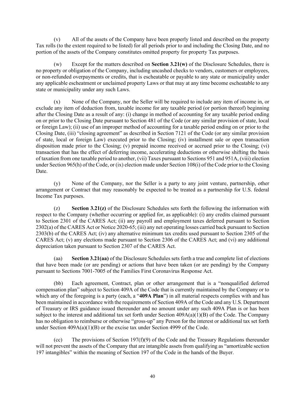 40 (v) All of the assets of the Company have been properly listed and described on the property Tax rolls (to the extent required to be listed) for all periods prior to and including the Closing Date, and no portion of the assets of the Company constitutes omitted property for property Tax purposes. (w) Except for the matters described on Section 3.21(w) of the Disclosure Schedules, there is no property or obligation of the Company, including uncashed checks to vendors, customers or employees, or non-refunded overpayments or credits, that is escheatable or payable to any state or municipality under any applicable escheatment or unclaimed property Laws or that may at any time become escheatable to any state or municipality under any such Laws. (x) None of the Company, nor the Seller will be required to include any item of income in, or exclude any item of deduction from, taxable income for any taxable period (or portion thereof) beginning after the Closing Date as a result of any: (i) change in method of accounting for any taxable period ending on or prior to the Closing Date pursuant to Section 481 of the Code (or any similar provision of state, local or foreign Law); (ii) use of an improper method of accounting for a taxable period ending on or prior to the Closing Date, (iii) “closing agreement” as described in Section 7121 of the Code (or any similar provision of state, local or foreign Law) executed prior to the Closing; (iv) installment sale or open transaction disposition made prior to the Closing; (v) prepaid income received or accrued prior to the Closing; (vi) transaction that has the effect of deferring income, accelerating deductions or otherwise shifting the basis of taxation from one taxable period to another, (vii) Taxes pursuant to Sections 951 and 951A, (viii) election under Section 965(h) of the Code, or (ix) election made under Section 108(i) of the Code prior to the Closing Date. (y) None of the Company, nor the Seller is a party to any joint venture, partnership, other arrangement or Contract that may reasonably be expected to be treated as a partnership for U.S. federal Income Tax purposes. (z) Section 3.21(z) of the Disclosure Schedules sets forth the following the information with respect to the Company (whether occurring or applied for, as applicable): (i) any credits claimed pursuant to Section 2301 of the CARES Act; (ii) any payroll and employment taxes deferred pursuant to Section 2302(a) of the CARES Act or Notice 2020-65; (iii) any net operating losses carried back pursuant to Section 2303(b) of the CARES Act; (iv) any alternative minimum tax credits used pursuant to Section 2305 of the CARES Act; (v) any elections made pursuant to Section 2306 of the CARES Act; and (vi) any additional depreciation taken pursuant to Section 2307 of the CARES Act. (aa) Section 3.21(aa) of the Disclosure Schedules sets forth a true and complete list of elections that have been made (or are pending) or actions that have been taken (or are pending) by the Company pursuant to Sections 7001-7005 of the Families First Coronavirus Response Act. (bb) Each agreement, Contract, plan or other arrangement that is a “nonqualified deferred compensation plan” subject to Section 409A of the Code that is currently maintained by the Company or to which any of the foregoing is a party (each, a “409A Plan”) in all material respects complies with and has been maintained in accordance with the requirements of Section 409A of the Code and any U.S. Department of Treasury or IRS guidance issued thereunder and no amount under any such 409A Plan is or has been subject to the interest and additional tax set forth under Section 409A(a)(1)(B) of the Code. The Company has no obligation to reimburse or otherwise “gross-up” any Person for the interest or additional tax set forth under Section 409A(a)(1)(B) or the excise tax under Section 4999 of the Code. (cc) The provisions of Section 197(f)(9) of the Code and the Treasury Regulations thereunder will not prevent the assets of the Company that are intangible assets from qualifying as “amortizable section 197 intangibles” within the meaning of Section 197 of the Code in the hands of the Buyer.