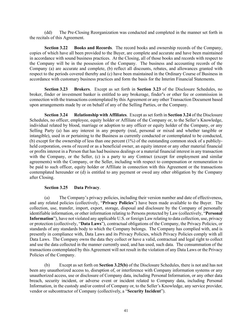 41 (dd) The Pre-Closing Reorganization was conducted and completed in the manner set forth in the recitals of this Agreement. Section 3.22 Books and Records. The record books and ownership records of the Company, copies of which have all been provided to the Buyer, are complete and accurate and have been maintained in accordance with sound business practices. At the Closing, all of those books and records with respect to the Company will be in the possession of the Company. The business and accounting records of the Company (a) are accurate and complete, (b) reflect all discounts, rebates, and allowances granted with respect to the periods covered thereby and (c) have been maintained in the Ordinary Course of Business in accordance with customary business practices and form the basis for the Interim Financial Statements. Section 3.23 Brokers. Except as set forth in Section 3.23 of the Disclosure Schedules, no broker, finder or investment banker is entitled to any brokerage, finder’s or other fee or commission in connection with the transactions contemplated by this Agreement or any other Transaction Document based upon arrangements made by or on behalf of any of the Selling Parties, or the Company. Section 3.24 Relationship with Affiliates. Except as set forth in Section 3.24 of the Disclosure Schedules, no officer, employee, equity holder or Affiliate of the Company or, to the Seller’s Knowledge, individual related by blood, marriage or adoption to any officer or equity holder of the Company, or any Selling Party (a) has any interest in any property (real, personal or mixed and whether tangible or intangible), used in or pertaining to the Business as currently conducted or contemplated to be conducted, (b) except for the ownership of less than one percent (1%) of the outstanding common stock of a publicly- held corporation, owns of record or as a beneficial owner, an equity interest or any other material financial or profits interest in a Person that has had business dealings or a material financial interest in any transaction with the Company, or the Seller, (c) is a party to any Contract (except for employment and similar agreements) with the Company, or the Seller, including with respect to compensation or remuneration to be paid to such officer, equity holder or Affiliate in connection with this Agreement or the transactions contemplated hereunder or (d) is entitled to any payment or owed any other obligation by the Company after Closing. Section 3.25 Data Privacy. (a) The Company’s privacy policies, including their version number and date of effectiveness, and any related policies (collectively, “Privacy Policies”) have been made available to the Buyer. The collection, use, transfer, import, export, storage, disposal and disclosure by the Company of personally identifiable information, or other information relating to Persons protected by Law (collectively, “Personal Information”), have not violated any applicable U.S. or foreign Law relating to data collection, use, privacy or protection (collectively, “Data Laws”), contractual obligations of the Company, the Privacy Policies, or standards of any standards body to which the Company belongs. The Company has complied with, and is presently in compliance with, Data Laws and its Privacy Policies, which Privacy Policies comply with all Data Laws. The Company owns the data they collect or have a valid, contractual and legal right to collect and use the data collected in the manner currently used, and has used, such data. The consummation of the transactions contemplated by this Agreement will not result in the violation of any Data Laws or the Privacy Policies of the Company. (b) Except as set forth on Section 3.25(b) of the Disclosure Schedules, there is not and has not been any unauthorized access to, disruption of, or interference with Company information systems or any unauthorized access, use or disclosure of Company data, including Personal Information, or any other data breach, security incident, or adverse event or incident related to Company data, including Personal Information, in the custody and/or control of Company or, to the Seller’s Knowledge, any service provider, vendor or subcontractor of Company (collectively, a “Security Incident”).