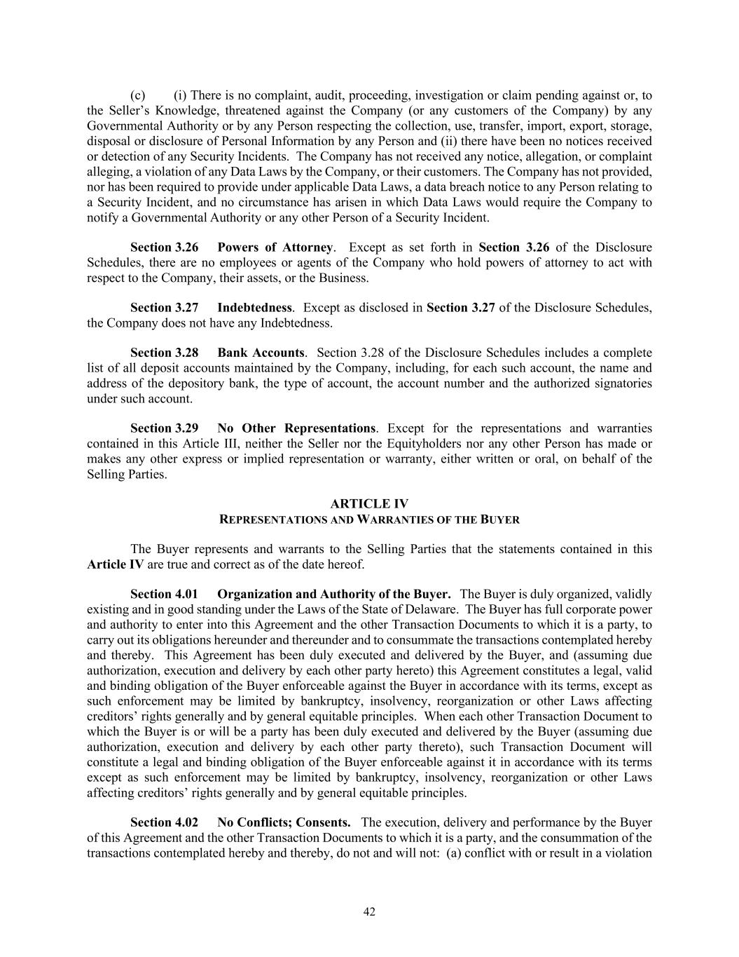 42 (c) (i) There is no complaint, audit, proceeding, investigation or claim pending against or, to the Seller’s Knowledge, threatened against the Company (or any customers of the Company) by any Governmental Authority or by any Person respecting the collection, use, transfer, import, export, storage, disposal or disclosure of Personal Information by any Person and (ii) there have been no notices received or detection of any Security Incidents. The Company has not received any notice, allegation, or complaint alleging, a violation of any Data Laws by the Company, or their customers. The Company has not provided, nor has been required to provide under applicable Data Laws, a data breach notice to any Person relating to a Security Incident, and no circumstance has arisen in which Data Laws would require the Company to notify a Governmental Authority or any other Person of a Security Incident. Section 3.26 Powers of Attorney. Except as set forth in Section 3.26 of the Disclosure Schedules, there are no employees or agents of the Company who hold powers of attorney to act with respect to the Company, their assets, or the Business. Section 3.27 Indebtedness. Except as disclosed in Section 3.27 of the Disclosure Schedules, the Company does not have any Indebtedness. Section 3.28 Bank Accounts. Section 3.28 of the Disclosure Schedules includes a complete list of all deposit accounts maintained by the Company, including, for each such account, the name and address of the depository bank, the type of account, the account number and the authorized signatories under such account. Section 3.29 No Other Representations. Except for the representations and warranties contained in this Article III, neither the Seller nor the Equityholders nor any other Person has made or makes any other express or implied representation or warranty, either written or oral, on behalf of the Selling Parties. ARTICLE IV REPRESENTATIONS AND WARRANTIES OF THE BUYER The Buyer represents and warrants to the Selling Parties that the statements contained in this Article IV are true and correct as of the date hereof. Section 4.01 Organization and Authority of the Buyer. The Buyer is duly organized, validly existing and in good standing under the Laws of the State of Delaware. The Buyer has full corporate power and authority to enter into this Agreement and the other Transaction Documents to which it is a party, to carry out its obligations hereunder and thereunder and to consummate the transactions contemplated hereby and thereby. This Agreement has been duly executed and delivered by the Buyer, and (assuming due authorization, execution and delivery by each other party hereto) this Agreement constitutes a legal, valid and binding obligation of the Buyer enforceable against the Buyer in accordance with its terms, except as such enforcement may be limited by bankruptcy, insolvency, reorganization or other Laws affecting creditors’ rights generally and by general equitable principles. When each other Transaction Document to which the Buyer is or will be a party has been duly executed and delivered by the Buyer (assuming due authorization, execution and delivery by each other party thereto), such Transaction Document will constitute a legal and binding obligation of the Buyer enforceable against it in accordance with its terms except as such enforcement may be limited by bankruptcy, insolvency, reorganization or other Laws affecting creditors’ rights generally and by general equitable principles. Section 4.02 No Conflicts; Consents. The execution, delivery and performance by the Buyer of this Agreement and the other Transaction Documents to which it is a party, and the consummation of the transactions contemplated hereby and thereby, do not and will not: (a) conflict with or result in a violation