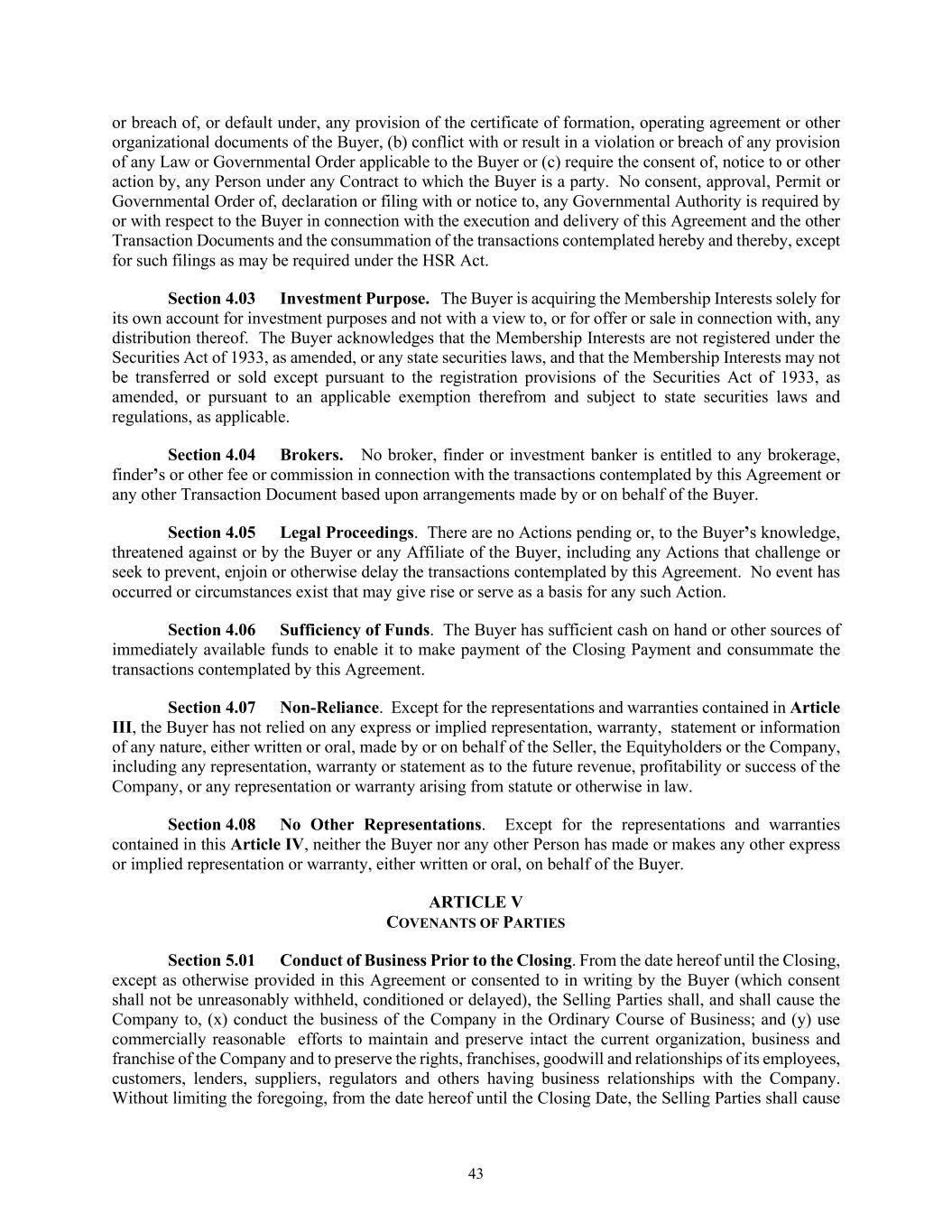 43 or breach of, or default under, any provision of the certificate of formation, operating agreement or other organizational documents of the Buyer, (b) conflict with or result in a violation or breach of any provision of any Law or Governmental Order applicable to the Buyer or (c) require the consent of, notice to or other action by, any Person under any Contract to which the Buyer is a party. No consent, approval, Permit or Governmental Order of, declaration or filing with or notice to, any Governmental Authority is required by or with respect to the Buyer in connection with the execution and delivery of this Agreement and the other Transaction Documents and the consummation of the transactions contemplated hereby and thereby, except for such filings as may be required under the HSR Act. Section 4.03 Investment Purpose. The Buyer is acquiring the Membership Interests solely for its own account for investment purposes and not with a view to, or for offer or sale in connection with, any distribution thereof. The Buyer acknowledges that the Membership Interests are not registered under the Securities Act of 1933, as amended, or any state securities laws, and that the Membership Interests may not be transferred or sold except pursuant to the registration provisions of the Securities Act of 1933, as amended, or pursuant to an applicable exemption therefrom and subject to state securities laws and regulations, as applicable. Section 4.04 Brokers. No broker, finder or investment banker is entitled to any brokerage, finder’s or other fee or commission in connection with the transactions contemplated by this Agreement or any other Transaction Document based upon arrangements made by or on behalf of the Buyer. Section 4.05 Legal Proceedings. There are no Actions pending or, to the Buyer’s knowledge, threatened against or by the Buyer or any Affiliate of the Buyer, including any Actions that challenge or seek to prevent, enjoin or otherwise delay the transactions contemplated by this Agreement. No event has occurred or circumstances exist that may give rise or serve as a basis for any such Action. Section 4.06 Sufficiency of Funds. The Buyer has sufficient cash on hand or other sources of immediately available funds to enable it to make payment of the Closing Payment and consummate the transactions contemplated by this Agreement. Section 4.07 Non-Reliance. Except for the representations and warranties contained in Article III, the Buyer has not relied on any express or implied representation, warranty, statement or information of any nature, either written or oral, made by or on behalf of the Seller, the Equityholders or the Company, including any representation, warranty or statement as to the future revenue, profitability or success of the Company, or any representation or warranty arising from statute or otherwise in law. Section 4.08 No Other Representations. Except for the representations and warranties contained in this Article IV, neither the Buyer nor any other Person has made or makes any other express or implied representation or warranty, either written or oral, on behalf of the Buyer. ARTICLE V COVENANTS OF PARTIES Section 5.01 Conduct of Business Prior to the Closing. From the date hereof until the Closing, except as otherwise provided in this Agreement or consented to in writing by the Buyer (which consent shall not be unreasonably withheld, conditioned or delayed), the Selling Parties shall, and shall cause the Company to, (x) conduct the business of the Company in the Ordinary Course of Business; and (y) use commercially reasonable efforts to maintain and preserve intact the current organization, business and franchise of the Company and to preserve the rights, franchises, goodwill and relationships of its employees, customers, lenders, suppliers, regulators and others having business relationships with the Company. Without limiting the foregoing, from the date hereof until the Closing Date, the Selling Parties shall cause