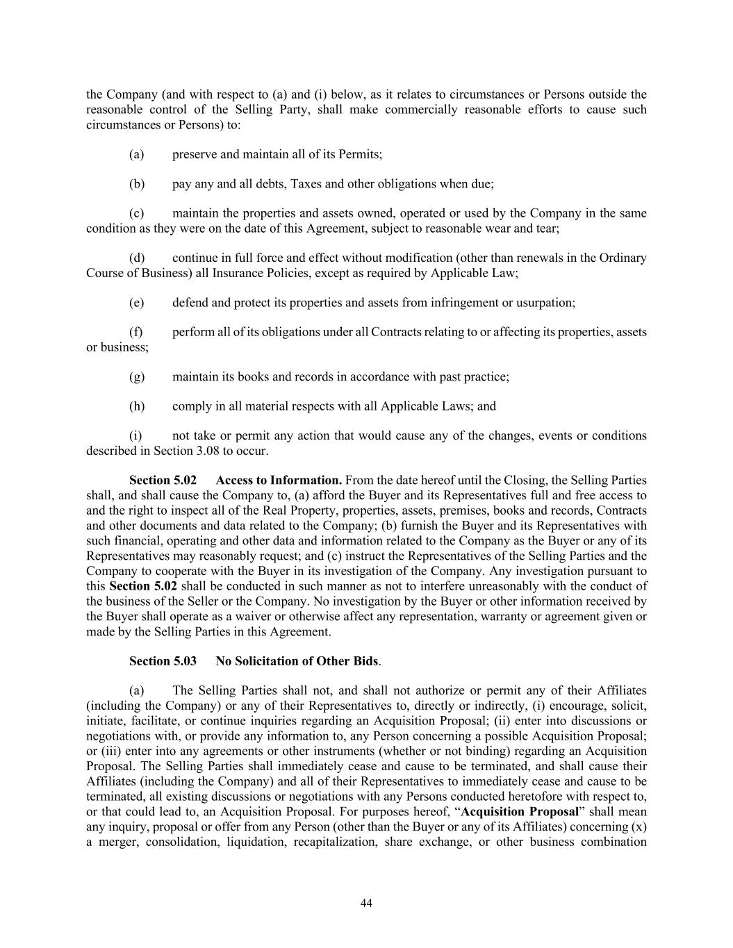 44 the Company (and with respect to (a) and (i) below, as it relates to circumstances or Persons outside the reasonable control of the Selling Party, shall make commercially reasonable efforts to cause such circumstances or Persons) to: (a) preserve and maintain all of its Permits; (b) pay any and all debts, Taxes and other obligations when due; (c) maintain the properties and assets owned, operated or used by the Company in the same condition as they were on the date of this Agreement, subject to reasonable wear and tear; (d) continue in full force and effect without modification (other than renewals in the Ordinary Course of Business) all Insurance Policies, except as required by Applicable Law; (e) defend and protect its properties and assets from infringement or usurpation; (f) perform all of its obligations under all Contracts relating to or affecting its properties, assets or business; (g) maintain its books and records in accordance with past practice; (h) comply in all material respects with all Applicable Laws; and (i) not take or permit any action that would cause any of the changes, events or conditions described in Section 3.08 to occur. Section 5.02 Access to Information. From the date hereof until the Closing, the Selling Parties shall, and shall cause the Company to, (a) afford the Buyer and its Representatives full and free access to and the right to inspect all of the Real Property, properties, assets, premises, books and records, Contracts and other documents and data related to the Company; (b) furnish the Buyer and its Representatives with such financial, operating and other data and information related to the Company as the Buyer or any of its Representatives may reasonably request; and (c) instruct the Representatives of the Selling Parties and the Company to cooperate with the Buyer in its investigation of the Company. Any investigation pursuant to this Section 5.02 shall be conducted in such manner as not to interfere unreasonably with the conduct of the business of the Seller or the Company. No investigation by the Buyer or other information received by the Buyer shall operate as a waiver or otherwise affect any representation, warranty or agreement given or made by the Selling Parties in this Agreement. Section 5.03 No Solicitation of Other Bids. (a) The Selling Parties shall not, and shall not authorize or permit any of their Affiliates (including the Company) or any of their Representatives to, directly or indirectly, (i) encourage, solicit, initiate, facilitate, or continue inquiries regarding an Acquisition Proposal; (ii) enter into discussions or negotiations with, or provide any information to, any Person concerning a possible Acquisition Proposal; or (iii) enter into any agreements or other instruments (whether or not binding) regarding an Acquisition Proposal. The Selling Parties shall immediately cease and cause to be terminated, and shall cause their Affiliates (including the Company) and all of their Representatives to immediately cease and cause to be terminated, all existing discussions or negotiations with any Persons conducted heretofore with respect to, or that could lead to, an Acquisition Proposal. For purposes hereof, “Acquisition Proposal” shall mean any inquiry, proposal or offer from any Person (other than the Buyer or any of its Affiliates) concerning (x) a merger, consolidation, liquidation, recapitalization, share exchange, or other business combination