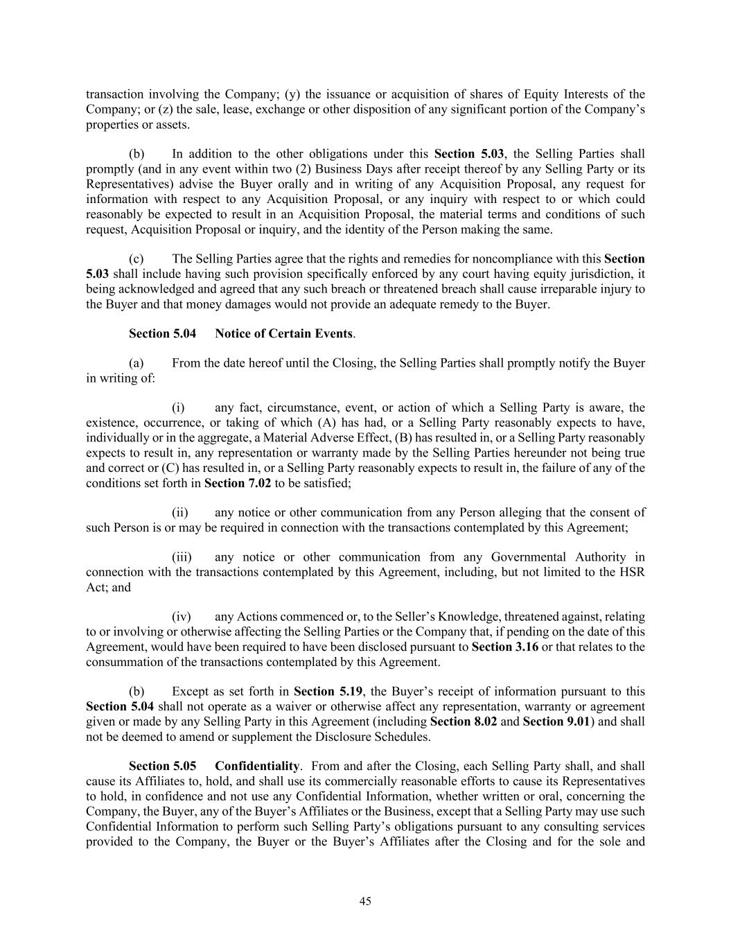 45 transaction involving the Company; (y) the issuance or acquisition of shares of Equity Interests of the Company; or (z) the sale, lease, exchange or other disposition of any significant portion of the Company’s properties or assets. (b) In addition to the other obligations under this Section 5.03, the Selling Parties shall promptly (and in any event within two (2) Business Days after receipt thereof by any Selling Party or its Representatives) advise the Buyer orally and in writing of any Acquisition Proposal, any request for information with respect to any Acquisition Proposal, or any inquiry with respect to or which could reasonably be expected to result in an Acquisition Proposal, the material terms and conditions of such request, Acquisition Proposal or inquiry, and the identity of the Person making the same. (c) The Selling Parties agree that the rights and remedies for noncompliance with this Section 5.03 shall include having such provision specifically enforced by any court having equity jurisdiction, it being acknowledged and agreed that any such breach or threatened breach shall cause irreparable injury to the Buyer and that money damages would not provide an adequate remedy to the Buyer. Section 5.04 Notice of Certain Events. (a) From the date hereof until the Closing, the Selling Parties shall promptly notify the Buyer in writing of: (i) any fact, circumstance, event, or action of which a Selling Party is aware, the existence, occurrence, or taking of which (A) has had, or a Selling Party reasonably expects to have, individually or in the aggregate, a Material Adverse Effect, (B) has resulted in, or a Selling Party reasonably expects to result in, any representation or warranty made by the Selling Parties hereunder not being true and correct or (C) has resulted in, or a Selling Party reasonably expects to result in, the failure of any of the conditions set forth in Section 7.02 to be satisfied; (ii) any notice or other communication from any Person alleging that the consent of such Person is or may be required in connection with the transactions contemplated by this Agreement; (iii) any notice or other communication from any Governmental Authority in connection with the transactions contemplated by this Agreement, including, but not limited to the HSR Act; and (iv) any Actions commenced or, to the Seller’s Knowledge, threatened against, relating to or involving or otherwise affecting the Selling Parties or the Company that, if pending on the date of this Agreement, would have been required to have been disclosed pursuant to Section 3.16 or that relates to the consummation of the transactions contemplated by this Agreement. (b) Except as set forth in Section 5.19, the Buyer’s receipt of information pursuant to this Section 5.04 shall not operate as a waiver or otherwise affect any representation, warranty or agreement given or made by any Selling Party in this Agreement (including Section 8.02 and Section 9.01) and shall not be deemed to amend or supplement the Disclosure Schedules. Section 5.05 Confidentiality. From and after the Closing, each Selling Party shall, and shall cause its Affiliates to, hold, and shall use its commercially reasonable efforts to cause its Representatives to hold, in confidence and not use any Confidential Information, whether written or oral, concerning the Company, the Buyer, any of the Buyer’s Affiliates or the Business, except that a Selling Party may use such Confidential Information to perform such Selling Party’s obligations pursuant to any consulting services provided to the Company, the Buyer or the Buyer’s Affiliates after the Closing and for the sole and