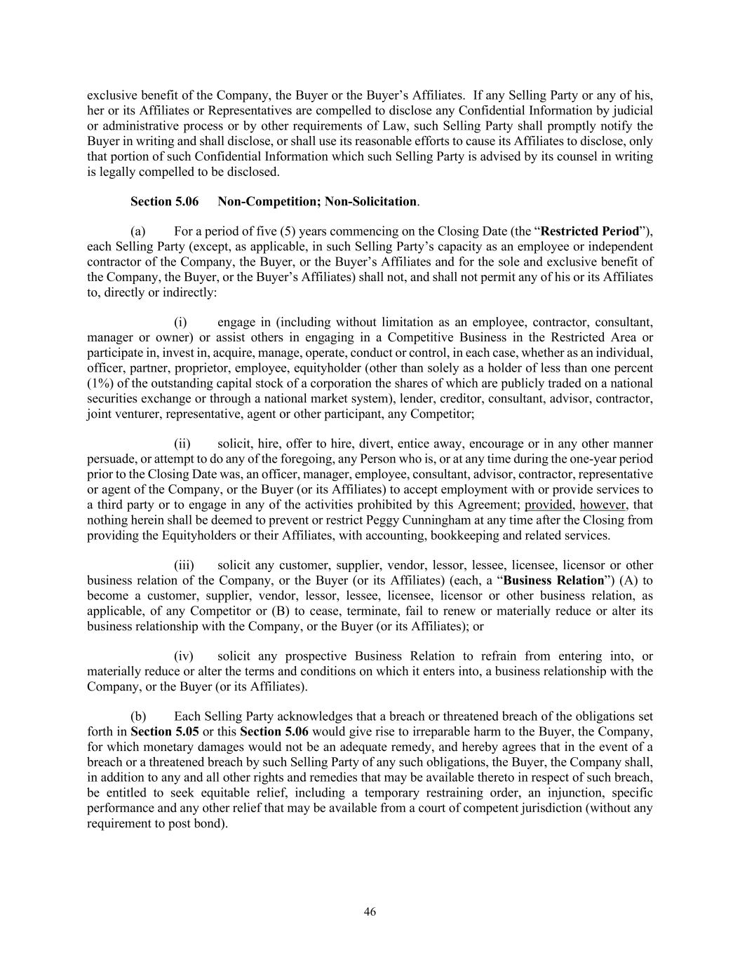 46 exclusive benefit of the Company, the Buyer or the Buyer’s Affiliates. If any Selling Party or any of his, her or its Affiliates or Representatives are compelled to disclose any Confidential Information by judicial or administrative process or by other requirements of Law, such Selling Party shall promptly notify the Buyer in writing and shall disclose, or shall use its reasonable efforts to cause its Affiliates to disclose, only that portion of such Confidential Information which such Selling Party is advised by its counsel in writing is legally compelled to be disclosed. Section 5.06 Non-Competition; Non-Solicitation. (a) For a period of five (5) years commencing on the Closing Date (the “Restricted Period”), each Selling Party (except, as applicable, in such Selling Party’s capacity as an employee or independent contractor of the Company, the Buyer, or the Buyer’s Affiliates and for the sole and exclusive benefit of the Company, the Buyer, or the Buyer’s Affiliates) shall not, and shall not permit any of his or its Affiliates to, directly or indirectly: (i) engage in (including without limitation as an employee, contractor, consultant, manager or owner) or assist others in engaging in a Competitive Business in the Restricted Area or participate in, invest in, acquire, manage, operate, conduct or control, in each case, whether as an individual, officer, partner, proprietor, employee, equityholder (other than solely as a holder of less than one percent (1%) of the outstanding capital stock of a corporation the shares of which are publicly traded on a national securities exchange or through a national market system), lender, creditor, consultant, advisor, contractor, joint venturer, representative, agent or other participant, any Competitor; (ii) solicit, hire, offer to hire, divert, entice away, encourage or in any other manner persuade, or attempt to do any of the foregoing, any Person who is, or at any time during the one-year period prior to the Closing Date was, an officer, manager, employee, consultant, advisor, contractor, representative or agent of the Company, or the Buyer (or its Affiliates) to accept employment with or provide services to a third party or to engage in any of the activities prohibited by this Agreement; provided, however, that nothing herein shall be deemed to prevent or restrict Peggy Cunningham at any time after the Closing from providing the Equityholders or their Affiliates, with accounting, bookkeeping and related services. (iii) solicit any customer, supplier, vendor, lessor, lessee, licensee, licensor or other business relation of the Company, or the Buyer (or its Affiliates) (each, a “Business Relation”) (A) to become a customer, supplier, vendor, lessor, lessee, licensee, licensor or other business relation, as applicable, of any Competitor or (B) to cease, terminate, fail to renew or materially reduce or alter its business relationship with the Company, or the Buyer (or its Affiliates); or (iv) solicit any prospective Business Relation to refrain from entering into, or materially reduce or alter the terms and conditions on which it enters into, a business relationship with the Company, or the Buyer (or its Affiliates). (b) Each Selling Party acknowledges that a breach or threatened breach of the obligations set forth in Section 5.05 or this Section 5.06 would give rise to irreparable harm to the Buyer, the Company, for which monetary damages would not be an adequate remedy, and hereby agrees that in the event of a breach or a threatened breach by such Selling Party of any such obligations, the Buyer, the Company shall, in addition to any and all other rights and remedies that may be available thereto in respect of such breach, be entitled to seek equitable relief, including a temporary restraining order, an injunction, specific performance and any other relief that may be available from a court of competent jurisdiction (without any requirement to post bond).