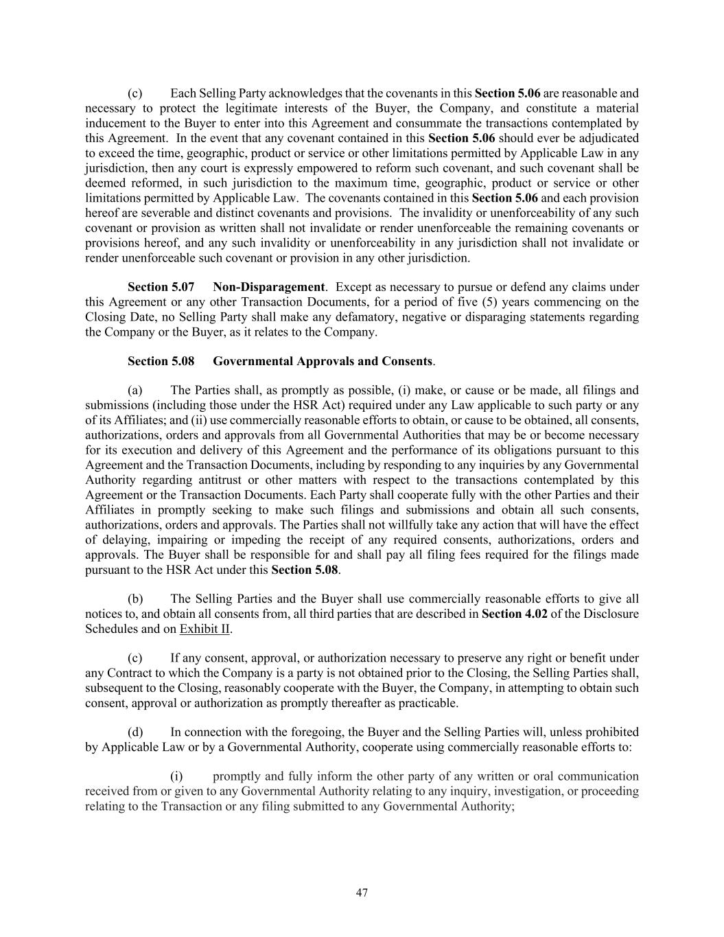 47 (c) Each Selling Party acknowledges that the covenants in this Section 5.06 are reasonable and necessary to protect the legitimate interests of the Buyer, the Company, and constitute a material inducement to the Buyer to enter into this Agreement and consummate the transactions contemplated by this Agreement. In the event that any covenant contained in this Section 5.06 should ever be adjudicated to exceed the time, geographic, product or service or other limitations permitted by Applicable Law in any jurisdiction, then any court is expressly empowered to reform such covenant, and such covenant shall be deemed reformed, in such jurisdiction to the maximum time, geographic, product or service or other limitations permitted by Applicable Law. The covenants contained in this Section 5.06 and each provision hereof are severable and distinct covenants and provisions. The invalidity or unenforceability of any such covenant or provision as written shall not invalidate or render unenforceable the remaining covenants or provisions hereof, and any such invalidity or unenforceability in any jurisdiction shall not invalidate or render unenforceable such covenant or provision in any other jurisdiction. Section 5.07 Non-Disparagement. Except as necessary to pursue or defend any claims under this Agreement or any other Transaction Documents, for a period of five (5) years commencing on the Closing Date, no Selling Party shall make any defamatory, negative or disparaging statements regarding the Company or the Buyer, as it relates to the Company. Section 5.08 Governmental Approvals and Consents. (a) The Parties shall, as promptly as possible, (i) make, or cause or be made, all filings and submissions (including those under the HSR Act) required under any Law applicable to such party or any of its Affiliates; and (ii) use commercially reasonable efforts to obtain, or cause to be obtained, all consents, authorizations, orders and approvals from all Governmental Authorities that may be or become necessary for its execution and delivery of this Agreement and the performance of its obligations pursuant to this Agreement and the Transaction Documents, including by responding to any inquiries by any Governmental Authority regarding antitrust or other matters with respect to the transactions contemplated by this Agreement or the Transaction Documents. Each Party shall cooperate fully with the other Parties and their Affiliates in promptly seeking to make such filings and submissions and obtain all such consents, authorizations, orders and approvals. The Parties shall not willfully take any action that will have the effect of delaying, impairing or impeding the receipt of any required consents, authorizations, orders and approvals. The Buyer shall be responsible for and shall pay all filing fees required for the filings made pursuant to the HSR Act under this Section 5.08. (b) The Selling Parties and the Buyer shall use commercially reasonable efforts to give all notices to, and obtain all consents from, all third parties that are described in Section 4.02 of the Disclosure Schedules and on Exhibit II. (c) If any consent, approval, or authorization necessary to preserve any right or benefit under any Contract to which the Company is a party is not obtained prior to the Closing, the Selling Parties shall, subsequent to the Closing, reasonably cooperate with the Buyer, the Company, in attempting to obtain such consent, approval or authorization as promptly thereafter as practicable. (d) In connection with the foregoing, the Buyer and the Selling Parties will, unless prohibited by Applicable Law or by a Governmental Authority, cooperate using commercially reasonable efforts to: (i) promptly and fully inform the other party of any written or oral communication received from or given to any Governmental Authority relating to any inquiry, investigation, or proceeding relating to the Transaction or any filing submitted to any Governmental Authority;