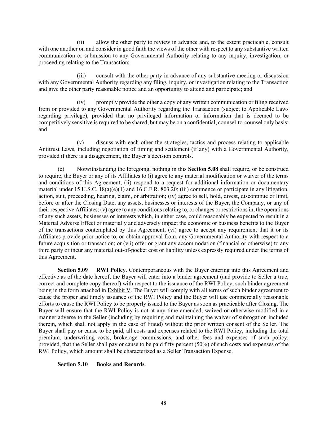 48 (ii) allow the other party to review in advance and, to the extent practicable, consult with one another on and consider in good faith the views of the other with respect to any substantive written communication or submission to any Governmental Authority relating to any inquiry, investigation, or proceeding relating to the Transaction; (iii) consult with the other party in advance of any substantive meeting or discussion with any Governmental Authority regarding any filing, inquiry, or investigation relating to the Transaction and give the other party reasonable notice and an opportunity to attend and participate; and (iv) promptly provide the other a copy of any written communication or filing received from or provided to any Governmental Authority regarding the Transaction (subject to Applicable Laws regarding privilege), provided that no privileged information or information that is deemed to be competitively sensitive is required to be shared, but may be on a confidential, counsel-to-counsel only basis; and (v) discuss with each other the strategies, tactics and process relating to applicable Antitrust Laws, including negotiation of timing and settlement (if any) with a Governmental Authority, provided if there is a disagreement, the Buyer’s decision controls. (e) Notwithstanding the foregoing, nothing in this Section 5.08 shall require, or be construed to require, the Buyer or any of its Affiliates to (i) agree to any material modification or waiver of the terms and conditions of this Agreement; (ii) respond to a request for additional information or documentary material under 15 U.S.C. 18(a)(e)(1) and 16 C.F.R. 803.20; (iii) commence or participate in any litigation, action, suit, proceeding, hearing, claim, or arbitration; (iv) agree to sell, hold, divest, discontinue or limit, before or after the Closing Date, any assets, businesses or interests of the Buyer, the Company, or any of their respective Affiliates; (v) agree to any conditions relating to, or changes or restrictions in, the operations of any such assets, businesses or interests which, in either case, could reasonably be expected to result in a Material Adverse Effect or materially and adversely impact the economic or business benefits to the Buyer of the transactions contemplated by this Agreement; (vi) agree to accept any requirement that it or its Affiliates provide prior notice to, or obtain approval from, any Governmental Authority with respect to a future acquisition or transaction; or (vii) offer or grant any accommodation (financial or otherwise) to any third party or incur any material out-of-pocket cost or liability unless expressly required under the terms of this Agreement. Section 5.09 RWI Policy. Contemporaneous with the Buyer entering into this Agreement and effective as of the date hereof, the Buyer will enter into a binder agreement (and provide to Seller a true, correct and complete copy thereof) with respect to the issuance of the RWI Policy, such binder agreement being in the form attached in Exhibit V. The Buyer will comply with all terms of such binder agreement to cause the proper and timely issuance of the RWI Policy and the Buyer will use commercially reasonable efforts to cause the RWI Policy to be properly issued to the Buyer as soon as practicable after Closing. The Buyer will ensure that the RWI Policy is not at any time amended, waived or otherwise modified in a manner adverse to the Seller (including by requiring and maintaining the waiver of subrogation included therein, which shall not apply in the case of Fraud) without the prior written consent of the Seller. The Buyer shall pay or cause to be paid, all costs and expenses related to the RWI Policy, including the total premium, underwriting costs, brokerage commissions, and other fees and expenses of such policy; provided, that the Seller shall pay or cause to be paid fifty percent (50%) of such costs and expenses of the RWI Policy, which amount shall be characterized as a Seller Transaction Expense. Section 5.10 Books and Records.