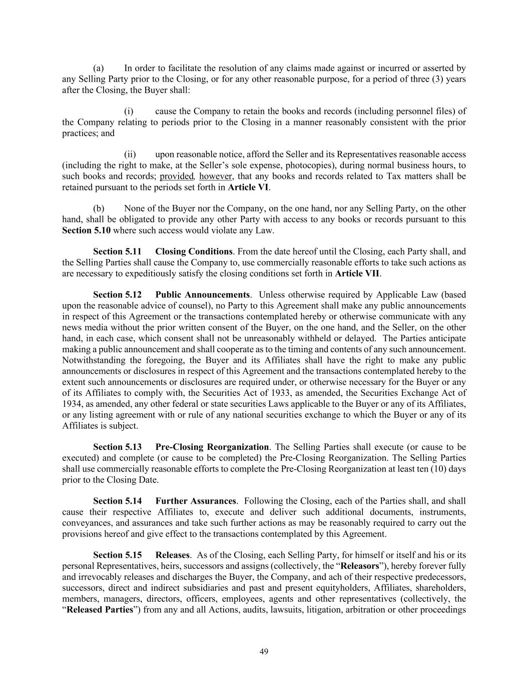49 (a) In order to facilitate the resolution of any claims made against or incurred or asserted by any Selling Party prior to the Closing, or for any other reasonable purpose, for a period of three (3) years after the Closing, the Buyer shall: (i) cause the Company to retain the books and records (including personnel files) of the Company relating to periods prior to the Closing in a manner reasonably consistent with the prior practices; and (ii) upon reasonable notice, afford the Seller and its Representatives reasonable access (including the right to make, at the Seller’s sole expense, photocopies), during normal business hours, to such books and records; provided, however, that any books and records related to Tax matters shall be retained pursuant to the periods set forth in Article VI. (b) None of the Buyer nor the Company, on the one hand, nor any Selling Party, on the other hand, shall be obligated to provide any other Party with access to any books or records pursuant to this Section 5.10 where such access would violate any Law. Section 5.11 Closing Conditions. From the date hereof until the Closing, each Party shall, and the Selling Parties shall cause the Company to, use commercially reasonable efforts to take such actions as are necessary to expeditiously satisfy the closing conditions set forth in Article VII. Section 5.12 Public Announcements. Unless otherwise required by Applicable Law (based upon the reasonable advice of counsel), no Party to this Agreement shall make any public announcements in respect of this Agreement or the transactions contemplated hereby or otherwise communicate with any news media without the prior written consent of the Buyer, on the one hand, and the Seller, on the other hand, in each case, which consent shall not be unreasonably withheld or delayed. The Parties anticipate making a public announcement and shall cooperate as to the timing and contents of any such announcement. Notwithstanding the foregoing, the Buyer and its Affiliates shall have the right to make any public announcements or disclosures in respect of this Agreement and the transactions contemplated hereby to the extent such announcements or disclosures are required under, or otherwise necessary for the Buyer or any of its Affiliates to comply with, the Securities Act of 1933, as amended, the Securities Exchange Act of 1934, as amended, any other federal or state securities Laws applicable to the Buyer or any of its Affiliates, or any listing agreement with or rule of any national securities exchange to which the Buyer or any of its Affiliates is subject. Section 5.13 Pre-Closing Reorganization. The Selling Parties shall execute (or cause to be executed) and complete (or cause to be completed) the Pre-Closing Reorganization. The Selling Parties shall use commercially reasonable efforts to complete the Pre-Closing Reorganization at least ten (10) days prior to the Closing Date. Section 5.14 Further Assurances. Following the Closing, each of the Parties shall, and shall cause their respective Affiliates to, execute and deliver such additional documents, instruments, conveyances, and assurances and take such further actions as may be reasonably required to carry out the provisions hereof and give effect to the transactions contemplated by this Agreement. Section 5.15 Releases. As of the Closing, each Selling Party, for himself or itself and his or its personal Representatives, heirs, successors and assigns (collectively, the “Releasors”), hereby forever fully and irrevocably releases and discharges the Buyer, the Company, and ach of their respective predecessors, successors, direct and indirect subsidiaries and past and present equityholders, Affiliates, shareholders, members, managers, directors, officers, employees, agents and other representatives (collectively, the “Released Parties”) from any and all Actions, audits, lawsuits, litigation, arbitration or other proceedings