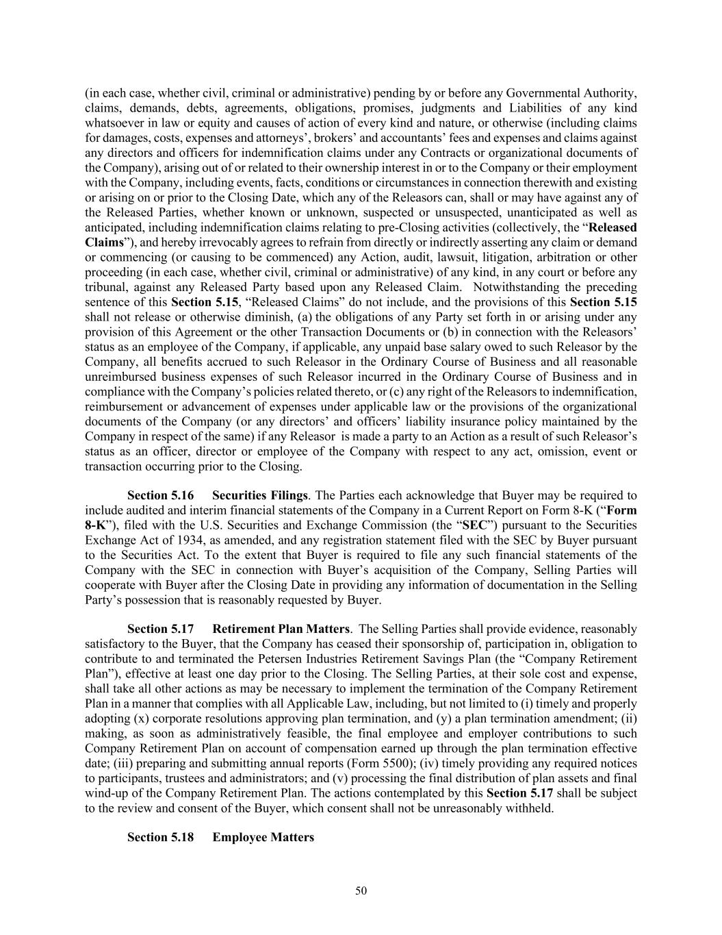 50 (in each case, whether civil, criminal or administrative) pending by or before any Governmental Authority, claims, demands, debts, agreements, obligations, promises, judgments and Liabilities of any kind whatsoever in law or equity and causes of action of every kind and nature, or otherwise (including claims for damages, costs, expenses and attorneys’, brokers’ and accountants’ fees and expenses and claims against any directors and officers for indemnification claims under any Contracts or organizational documents of the Company), arising out of or related to their ownership interest in or to the Company or their employment with the Company, including events, facts, conditions or circumstances in connection therewith and existing or arising on or prior to the Closing Date, which any of the Releasors can, shall or may have against any of the Released Parties, whether known or unknown, suspected or unsuspected, unanticipated as well as anticipated, including indemnification claims relating to pre-Closing activities (collectively, the “Released Claims”), and hereby irrevocably agrees to refrain from directly or indirectly asserting any claim or demand or commencing (or causing to be commenced) any Action, audit, lawsuit, litigation, arbitration or other proceeding (in each case, whether civil, criminal or administrative) of any kind, in any court or before any tribunal, against any Released Party based upon any Released Claim. Notwithstanding the preceding sentence of this Section 5.15, “Released Claims” do not include, and the provisions of this Section 5.15 shall not release or otherwise diminish, (a) the obligations of any Party set forth in or arising under any provision of this Agreement or the other Transaction Documents or (b) in connection with the Releasors’ status as an employee of the Company, if applicable, any unpaid base salary owed to such Releasor by the Company, all benefits accrued to such Releasor in the Ordinary Course of Business and all reasonable unreimbursed business expenses of such Releasor incurred in the Ordinary Course of Business and in compliance with the Company’s policies related thereto, or (c) any right of the Releasors to indemnification, reimbursement or advancement of expenses under applicable law or the provisions of the organizational documents of the Company (or any directors’ and officers’ liability insurance policy maintained by the Company in respect of the same) if any Releasor is made a party to an Action as a result of such Releasor’s status as an officer, director or employee of the Company with respect to any act, omission, event or transaction occurring prior to the Closing. Section 5.16 Securities Filings. The Parties each acknowledge that Buyer may be required to include audited and interim financial statements of the Company in a Current Report on Form 8-K (“Form 8-K”), filed with the U.S. Securities and Exchange Commission (the “SEC”) pursuant to the Securities Exchange Act of 1934, as amended, and any registration statement filed with the SEC by Buyer pursuant to the Securities Act. To the extent that Buyer is required to file any such financial statements of the Company with the SEC in connection with Buyer’s acquisition of the Company, Selling Parties will cooperate with Buyer after the Closing Date in providing any information of documentation in the Selling Party’s possession that is reasonably requested by Buyer. Section 5.17 Retirement Plan Matters. The Selling Parties shall provide evidence, reasonably satisfactory to the Buyer, that the Company has ceased their sponsorship of, participation in, obligation to contribute to and terminated the Petersen Industries Retirement Savings Plan (the “Company Retirement Plan”), effective at least one day prior to the Closing. The Selling Parties, at their sole cost and expense, shall take all other actions as may be necessary to implement the termination of the Company Retirement Plan in a manner that complies with all Applicable Law, including, but not limited to (i) timely and properly adopting (x) corporate resolutions approving plan termination, and (y) a plan termination amendment; (ii) making, as soon as administratively feasible, the final employee and employer contributions to such Company Retirement Plan on account of compensation earned up through the plan termination effective date; (iii) preparing and submitting annual reports (Form 5500); (iv) timely providing any required notices to participants, trustees and administrators; and (v) processing the final distribution of plan assets and final wind-up of the Company Retirement Plan. The actions contemplated by this Section 5.17 shall be subject to the review and consent of the Buyer, which consent shall not be unreasonably withheld. Section 5.18 Employee Matters