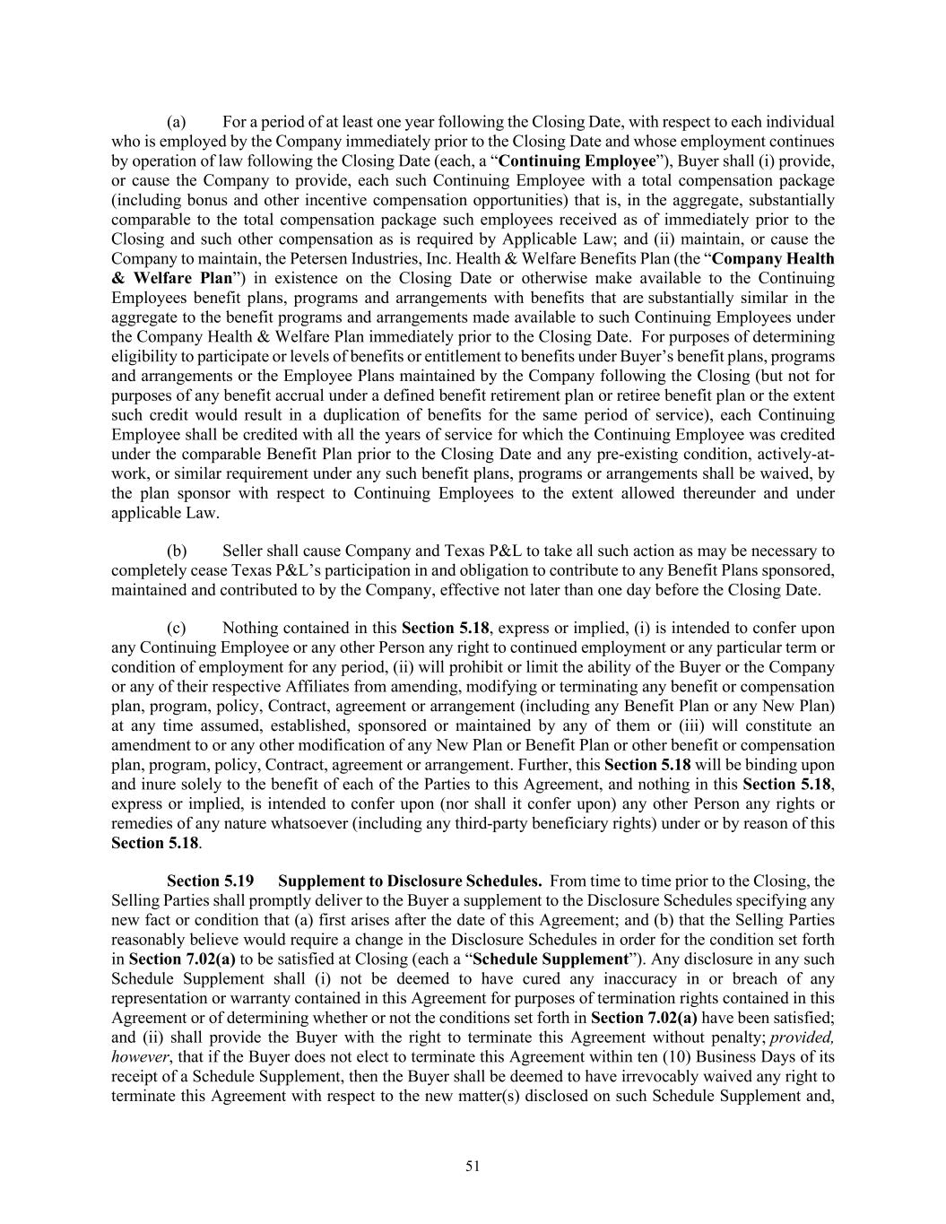 51 (a) For a period of at least one year following the Closing Date, with respect to each individual who is employed by the Company immediately prior to the Closing Date and whose employment continues by operation of law following the Closing Date (each, a “Continuing Employee”), Buyer shall (i) provide, or cause the Company to provide, each such Continuing Employee with a total compensation package (including bonus and other incentive compensation opportunities) that is, in the aggregate, substantially comparable to the total compensation package such employees received as of immediately prior to the Closing and such other compensation as is required by Applicable Law; and (ii) maintain, or cause the Company to maintain, the Petersen Industries, Inc. Health & Welfare Benefits Plan (the “Company Health & Welfare Plan”) in existence on the Closing Date or otherwise make available to the Continuing Employees benefit plans, programs and arrangements with benefits that are substantially similar in the aggregate to the benefit programs and arrangements made available to such Continuing Employees under the Company Health & Welfare Plan immediately prior to the Closing Date. For purposes of determining eligibility to participate or levels of benefits or entitlement to benefits under Buyer’s benefit plans, programs and arrangements or the Employee Plans maintained by the Company following the Closing (but not for purposes of any benefit accrual under a defined benefit retirement plan or retiree benefit plan or the extent such credit would result in a duplication of benefits for the same period of service), each Continuing Employee shall be credited with all the years of service for which the Continuing Employee was credited under the comparable Benefit Plan prior to the Closing Date and any pre-existing condition, actively-at- work, or similar requirement under any such benefit plans, programs or arrangements shall be waived, by the plan sponsor with respect to Continuing Employees to the extent allowed thereunder and under applicable Law. (b) Seller shall cause Company and Texas P&L to take all such action as may be necessary to completely cease Texas P&L’s participation in and obligation to contribute to any Benefit Plans sponsored, maintained and contributed to by the Company, effective not later than one day before the Closing Date. (c) Nothing contained in this Section 5.18, express or implied, (i) is intended to confer upon any Continuing Employee or any other Person any right to continued employment or any particular term or condition of employment for any period, (ii) will prohibit or limit the ability of the Buyer or the Company or any of their respective Affiliates from amending, modifying or terminating any benefit or compensation plan, program, policy, Contract, agreement or arrangement (including any Benefit Plan or any New Plan) at any time assumed, established, sponsored or maintained by any of them or (iii) will constitute an amendment to or any other modification of any New Plan or Benefit Plan or other benefit or compensation plan, program, policy, Contract, agreement or arrangement. Further, this Section 5.18 will be binding upon and inure solely to the benefit of each of the Parties to this Agreement, and nothing in this Section 5.18, express or implied, is intended to confer upon (nor shall it confer upon) any other Person any rights or remedies of any nature whatsoever (including any third-party beneficiary rights) under or by reason of this Section 5.18. Section 5.19 Supplement to Disclosure Schedules. From time to time prior to the Closing, the Selling Parties shall promptly deliver to the Buyer a supplement to the Disclosure Schedules specifying any new fact or condition that (a) first arises after the date of this Agreement; and (b) that the Selling Parties reasonably believe would require a change in the Disclosure Schedules in order for the condition set forth in Section 7.02(a) to be satisfied at Closing (each a “Schedule Supplement”). Any disclosure in any such Schedule Supplement shall (i) not be deemed to have cured any inaccuracy in or breach of any representation or warranty contained in this Agreement for purposes of termination rights contained in this Agreement or of determining whether or not the conditions set forth in Section 7.02(a) have been satisfied; and (ii) shall provide the Buyer with the right to terminate this Agreement without penalty; provided, however, that if the Buyer does not elect to terminate this Agreement within ten (10) Business Days of its receipt of a Schedule Supplement, then the Buyer shall be deemed to have irrevocably waived any right to terminate this Agreement with respect to the new matter(s) disclosed on such Schedule Supplement and,