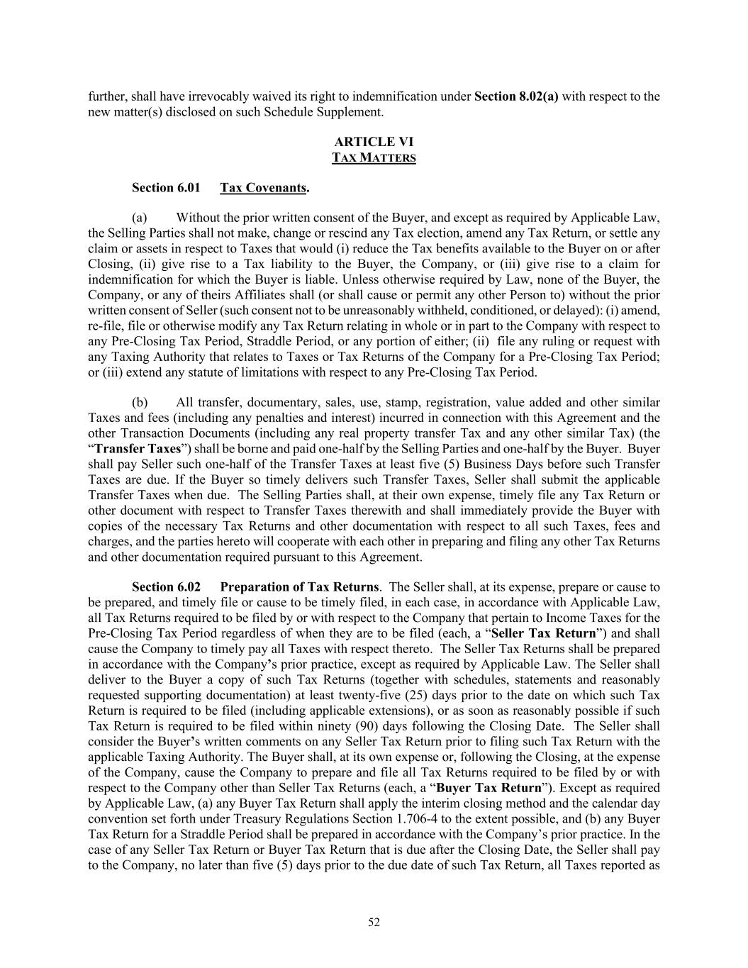 52 further, shall have irrevocably waived its right to indemnification under Section 8.02(a) with respect to the new matter(s) disclosed on such Schedule Supplement. ARTICLE VI TAX MATTERS Section 6.01 Tax Covenants. (a) Without the prior written consent of the Buyer, and except as required by Applicable Law, the Selling Parties shall not make, change or rescind any Tax election, amend any Tax Return, or settle any claim or assets in respect to Taxes that would (i) reduce the Tax benefits available to the Buyer on or after Closing, (ii) give rise to a Tax liability to the Buyer, the Company, or (iii) give rise to a claim for indemnification for which the Buyer is liable. Unless otherwise required by Law, none of the Buyer, the Company, or any of theirs Affiliates shall (or shall cause or permit any other Person to) without the prior written consent of Seller (such consent not to be unreasonably withheld, conditioned, or delayed): (i) amend, re-file, file or otherwise modify any Tax Return relating in whole or in part to the Company with respect to any Pre-Closing Tax Period, Straddle Period, or any portion of either; (ii) file any ruling or request with any Taxing Authority that relates to Taxes or Tax Returns of the Company for a Pre-Closing Tax Period; or (iii) extend any statute of limitations with respect to any Pre-Closing Tax Period. (b) All transfer, documentary, sales, use, stamp, registration, value added and other similar Taxes and fees (including any penalties and interest) incurred in connection with this Agreement and the other Transaction Documents (including any real property transfer Tax and any other similar Tax) (the “Transfer Taxes”) shall be borne and paid one-half by the Selling Parties and one-half by the Buyer. Buyer shall pay Seller such one-half of the Transfer Taxes at least five (5) Business Days before such Transfer Taxes are due. If the Buyer so timely delivers such Transfer Taxes, Seller shall submit the applicable Transfer Taxes when due. The Selling Parties shall, at their own expense, timely file any Tax Return or other document with respect to Transfer Taxes therewith and shall immediately provide the Buyer with copies of the necessary Tax Returns and other documentation with respect to all such Taxes, fees and charges, and the parties hereto will cooperate with each other in preparing and filing any other Tax Returns and other documentation required pursuant to this Agreement. Section 6.02 Preparation of Tax Returns. The Seller shall, at its expense, prepare or cause to be prepared, and timely file or cause to be timely filed, in each case, in accordance with Applicable Law, all Tax Returns required to be filed by or with respect to the Company that pertain to Income Taxes for the Pre-Closing Tax Period regardless of when they are to be filed (each, a “Seller Tax Return”) and shall cause the Company to timely pay all Taxes with respect thereto. The Seller Tax Returns shall be prepared in accordance with the Company’s prior practice, except as required by Applicable Law. The Seller shall deliver to the Buyer a copy of such Tax Returns (together with schedules, statements and reasonably requested supporting documentation) at least twenty-five (25) days prior to the date on which such Tax Return is required to be filed (including applicable extensions), or as soon as reasonably possible if such Tax Return is required to be filed within ninety (90) days following the Closing Date. The Seller shall consider the Buyer’s written comments on any Seller Tax Return prior to filing such Tax Return with the applicable Taxing Authority. The Buyer shall, at its own expense or, following the Closing, at the expense of the Company, cause the Company to prepare and file all Tax Returns required to be filed by or with respect to the Company other than Seller Tax Returns (each, a “Buyer Tax Return”). Except as required by Applicable Law, (a) any Buyer Tax Return shall apply the interim closing method and the calendar day convention set forth under Treasury Regulations Section 1.706-4 to the extent possible, and (b) any Buyer Tax Return for a Straddle Period shall be prepared in accordance with the Company’s prior practice. In the case of any Seller Tax Return or Buyer Tax Return that is due after the Closing Date, the Seller shall pay to the Company, no later than five (5) days prior to the due date of such Tax Return, all Taxes reported as