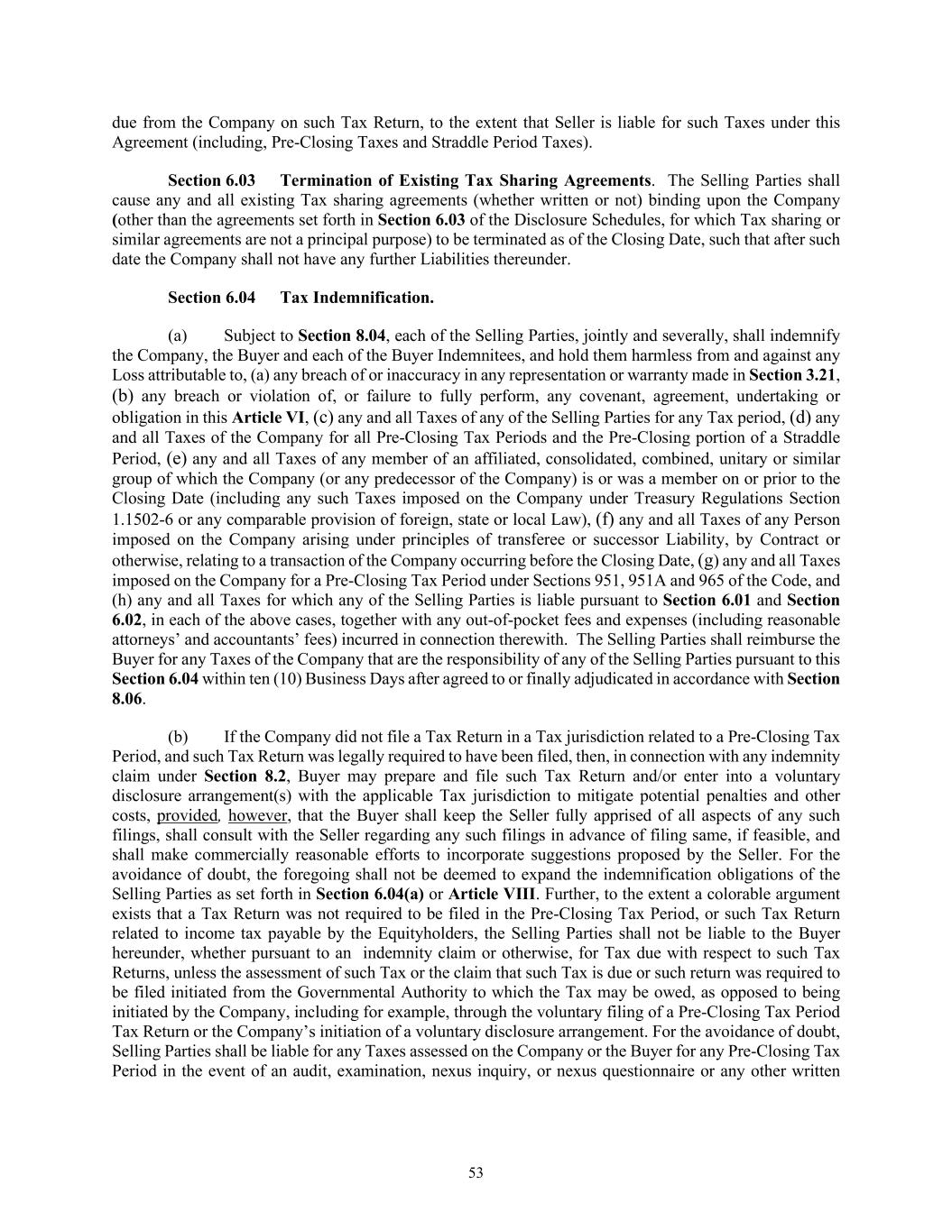 53 due from the Company on such Tax Return, to the extent that Seller is liable for such Taxes under this Agreement (including, Pre-Closing Taxes and Straddle Period Taxes). Section 6.03 Termination of Existing Tax Sharing Agreements. The Selling Parties shall cause any and all existing Tax sharing agreements (whether written or not) binding upon the Company (other than the agreements set forth in Section 6.03 of the Disclosure Schedules, for which Tax sharing or similar agreements are not a principal purpose) to be terminated as of the Closing Date, such that after such date the Company shall not have any further Liabilities thereunder. Section 6.04 Tax Indemnification. (a) Subject to Section 8.04, each of the Selling Parties, jointly and severally, shall indemnify the Company, the Buyer and each of the Buyer Indemnitees, and hold them harmless from and against any Loss attributable to, (a) any breach of or inaccuracy in any representation or warranty made in Section 3.21, (b) any breach or violation of, or failure to fully perform, any covenant, agreement, undertaking or obligation in this Article VI, (c) any and all Taxes of any of the Selling Parties for any Tax period, (d) any and all Taxes of the Company for all Pre-Closing Tax Periods and the Pre-Closing portion of a Straddle Period, (e) any and all Taxes of any member of an affiliated, consolidated, combined, unitary or similar group of which the Company (or any predecessor of the Company) is or was a member on or prior to the Closing Date (including any such Taxes imposed on the Company under Treasury Regulations Section 1.1502-6 or any comparable provision of foreign, state or local Law), (f) any and all Taxes of any Person imposed on the Company arising under principles of transferee or successor Liability, by Contract or otherwise, relating to a transaction of the Company occurring before the Closing Date, (g) any and all Taxes imposed on the Company for a Pre-Closing Tax Period under Sections 951, 951A and 965 of the Code, and (h) any and all Taxes for which any of the Selling Parties is liable pursuant to Section 6.01 and Section 6.02, in each of the above cases, together with any out-of-pocket fees and expenses (including reasonable attorneys’ and accountants’ fees) incurred in connection therewith. The Selling Parties shall reimburse the Buyer for any Taxes of the Company that are the responsibility of any of the Selling Parties pursuant to this Section 6.04 within ten (10) Business Days after agreed to or finally adjudicated in accordance with Section 8.06. (b) If the Company did not file a Tax Return in a Tax jurisdiction related to a Pre-Closing Tax Period, and such Tax Return was legally required to have been filed, then, in connection with any indemnity claim under Section 8.2, Buyer may prepare and file such Tax Return and/or enter into a voluntary disclosure arrangement(s) with the applicable Tax jurisdiction to mitigate potential penalties and other costs, provided, however, that the Buyer shall keep the Seller fully apprised of all aspects of any such filings, shall consult with the Seller regarding any such filings in advance of filing same, if feasible, and shall make commercially reasonable efforts to incorporate suggestions proposed by the Seller. For the avoidance of doubt, the foregoing shall not be deemed to expand the indemnification obligations of the Selling Parties as set forth in Section 6.04(a) or Article VIII. Further, to the extent a colorable argument exists that a Tax Return was not required to be filed in the Pre-Closing Tax Period, or such Tax Return related to income tax payable by the Equityholders, the Selling Parties shall not be liable to the Buyer hereunder, whether pursuant to an indemnity claim or otherwise, for Tax due with respect to such Tax Returns, unless the assessment of such Tax or the claim that such Tax is due or such return was required to be filed initiated from the Governmental Authority to which the Tax may be owed, as opposed to being initiated by the Company, including for example, through the voluntary filing of a Pre-Closing Tax Period Tax Return or the Company’s initiation of a voluntary disclosure arrangement. For the avoidance of doubt, Selling Parties shall be liable for any Taxes assessed on the Company or the Buyer for any Pre-Closing Tax Period in the event of an audit, examination, nexus inquiry, or nexus questionnaire or any other written