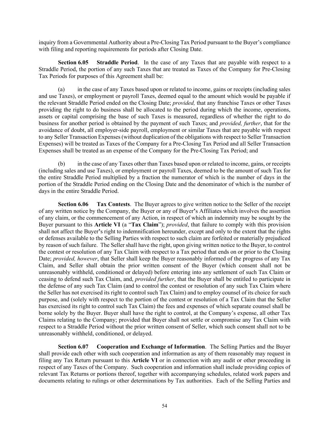 54 inquiry from a Governmental Authority about a Pre-Closing Tax Period pursuant to the Buyer’s compliance with filing and reporting requirements for periods after Closing Date. Section 6.05 Straddle Period. In the case of any Taxes that are payable with respect to a Straddle Period, the portion of any such Taxes that are treated as Taxes of the Company for Pre-Closing Tax Periods for purposes of this Agreement shall be: (a) in the case of any Taxes based upon or related to income, gains or receipts (including sales and use Taxes), or employment or payroll Taxes, deemed equal to the amount which would be payable if the relevant Straddle Period ended on the Closing Date; provided, that any franchise Taxes or other Taxes providing the right to do business shall be allocated to the period during which the income, operations, assets or capital comprising the base of such Taxes is measured, regardless of whether the right to do business for another period is obtained by the payment of such Taxes; and provided, further, that for the avoidance of doubt, all employer-side payroll, employment or similar Taxes that are payable with respect to any Seller Transaction Expenses (without duplication of the obligations with respect to Seller Transaction Expenses) will be treated as Taxes of the Company for a Pre-Closing Tax Period and all Seller Transaction Expenses shall be treated as an expense of the Company for the Pre-Closing Tax Period; and (b) in the case of any Taxes other than Taxes based upon or related to income, gains, or receipts (including sales and use Taxes), or employment or payroll Taxes, deemed to be the amount of such Tax for the entire Straddle Period multiplied by a fraction the numerator of which is the number of days in the portion of the Straddle Period ending on the Closing Date and the denominator of which is the number of days in the entire Straddle Period. Section 6.06 Tax Contests. The Buyer agrees to give written notice to the Seller of the receipt of any written notice by the Company, the Buyer or any of Buyer’s Affiliates which involves the assertion of any claim, or the commencement of any Action, in respect of which an indemnity may be sought by the Buyer pursuant to this Article VI (a “Tax Claim”); provided, that failure to comply with this provision shall not affect the Buyer’s right to indemnification hereunder, except and only to the extent that the rights or defenses available to the Selling Parties with respect to such claim are forfeited or materially prejudiced by reason of such failure. The Seller shall have the right, upon giving written notice to the Buyer, to control the contest or resolution of any Tax Claim with respect to a Tax period that ends on or prior to the Closing Date; provided, however, that Seller shall keep the Buyer reasonably informed of the progress of any Tax Claim, and Seller shall obtain the prior written consent of the Buyer (which consent shall not be unreasonably withheld, conditioned or delayed) before entering into any settlement of such Tax Claim or ceasing to defend such Tax Claim, and, provided further, that the Buyer shall be entitled to participate in the defense of any such Tax Claim (and to control the contest or resolution of any such Tax Claim where the Seller has not exercised its right to control such Tax Claim) and to employ counsel of its choice for such purpose, and (solely with respect to the portion of the contest or resolution of a Tax Claim that the Seller has exercised its right to control such Tax Claim) the fees and expenses of which separate counsel shall be borne solely by the Buyer. Buyer shall have the right to control, at the Company’s expense, all other Tax Claims relating to the Company; provided that Buyer shall not settle or compromise any Tax Claim with respect to a Straddle Period without the prior written consent of Seller, which such consent shall not to be unreasonably withheld, conditioned, or delayed. Section 6.07 Cooperation and Exchange of Information. The Selling Parties and the Buyer shall provide each other with such cooperation and information as any of them reasonably may request in filing any Tax Return pursuant to this Article VI or in connection with any audit or other proceeding in respect of any Taxes of the Company. Such cooperation and information shall include providing copies of relevant Tax Returns or portions thereof, together with accompanying schedules, related work papers and documents relating to rulings or other determinations by Tax authorities. Each of the Selling Parties and