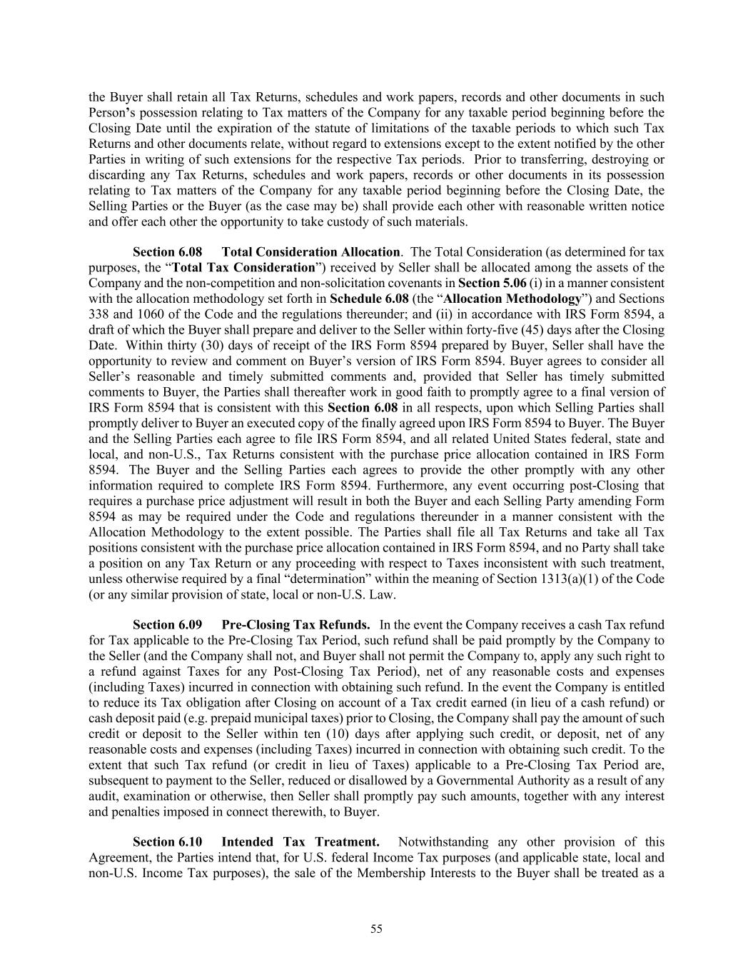 55 the Buyer shall retain all Tax Returns, schedules and work papers, records and other documents in such Person’s possession relating to Tax matters of the Company for any taxable period beginning before the Closing Date until the expiration of the statute of limitations of the taxable periods to which such Tax Returns and other documents relate, without regard to extensions except to the extent notified by the other Parties in writing of such extensions for the respective Tax periods. Prior to transferring, destroying or discarding any Tax Returns, schedules and work papers, records or other documents in its possession relating to Tax matters of the Company for any taxable period beginning before the Closing Date, the Selling Parties or the Buyer (as the case may be) shall provide each other with reasonable written notice and offer each other the opportunity to take custody of such materials. Section 6.08 Total Consideration Allocation. The Total Consideration (as determined for tax purposes, the “Total Tax Consideration”) received by Seller shall be allocated among the assets of the Company and the non-competition and non-solicitation covenants in Section 5.06 (i) in a manner consistent with the allocation methodology set forth in Schedule 6.08 (the “Allocation Methodology”) and Sections 338 and 1060 of the Code and the regulations thereunder; and (ii) in accordance with IRS Form 8594, a draft of which the Buyer shall prepare and deliver to the Seller within forty-five (45) days after the Closing Date. Within thirty (30) days of receipt of the IRS Form 8594 prepared by Buyer, Seller shall have the opportunity to review and comment on Buyer’s version of IRS Form 8594. Buyer agrees to consider all Seller’s reasonable and timely submitted comments and, provided that Seller has timely submitted comments to Buyer, the Parties shall thereafter work in good faith to promptly agree to a final version of IRS Form 8594 that is consistent with this Section 6.08 in all respects, upon which Selling Parties shall promptly deliver to Buyer an executed copy of the finally agreed upon IRS Form 8594 to Buyer. The Buyer and the Selling Parties each agree to file IRS Form 8594, and all related United States federal, state and local, and non-U.S., Tax Returns consistent with the purchase price allocation contained in IRS Form 8594. The Buyer and the Selling Parties each agrees to provide the other promptly with any other information required to complete IRS Form 8594. Furthermore, any event occurring post-Closing that requires a purchase price adjustment will result in both the Buyer and each Selling Party amending Form 8594 as may be required under the Code and regulations thereunder in a manner consistent with the Allocation Methodology to the extent possible. The Parties shall file all Tax Returns and take all Tax positions consistent with the purchase price allocation contained in IRS Form 8594, and no Party shall take a position on any Tax Return or any proceeding with respect to Taxes inconsistent with such treatment, unless otherwise required by a final “determination” within the meaning of Section 1313(a)(1) of the Code (or any similar provision of state, local or non-U.S. Law. Section 6.09 Pre-Closing Tax Refunds. In the event the Company receives a cash Tax refund for Tax applicable to the Pre-Closing Tax Period, such refund shall be paid promptly by the Company to the Seller (and the Company shall not, and Buyer shall not permit the Company to, apply any such right to a refund against Taxes for any Post-Closing Tax Period), net of any reasonable costs and expenses (including Taxes) incurred in connection with obtaining such refund. In the event the Company is entitled to reduce its Tax obligation after Closing on account of a Tax credit earned (in lieu of a cash refund) or cash deposit paid (e.g. prepaid municipal taxes) prior to Closing, the Company shall pay the amount of such credit or deposit to the Seller within ten (10) days after applying such credit, or deposit, net of any reasonable costs and expenses (including Taxes) incurred in connection with obtaining such credit. To the extent that such Tax refund (or credit in lieu of Taxes) applicable to a Pre-Closing Tax Period are, subsequent to payment to the Seller, reduced or disallowed by a Governmental Authority as a result of any audit, examination or otherwise, then Seller shall promptly pay such amounts, together with any interest and penalties imposed in connect therewith, to Buyer. Section 6.10 Intended Tax Treatment. Notwithstanding any other provision of this Agreement, the Parties intend that, for U.S. federal Income Tax purposes (and applicable state, local and non-U.S. Income Tax purposes), the sale of the Membership Interests to the Buyer shall be treated as a