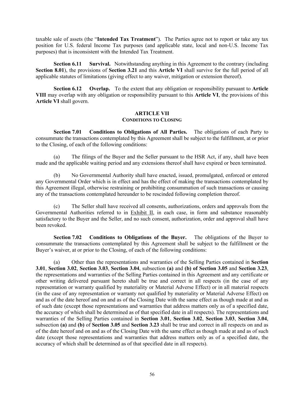 56 taxable sale of assets (the “Intended Tax Treatment”). The Parties agree not to report or take any tax position for U.S. federal Income Tax purposes (and applicable state, local and non-U.S. Income Tax purposes) that is inconsistent with the Intended Tax Treatment. Section 6.11 Survival. Notwithstanding anything in this Agreement to the contrary (including Section 8.01), the provisions of Section 3.21 and this Article VI shall survive for the full period of all applicable statutes of limitations (giving effect to any waiver, mitigation or extension thereof). Section 6.12 Overlap. To the extent that any obligation or responsibility pursuant to Article VIII may overlap with any obligation or responsibility pursuant to this Article VI, the provisions of this Article VI shall govern. ARTICLE VII CONDITIONS TO CLOSING Section 7.01 Conditions to Obligations of All Parties. The obligations of each Party to consummate the transactions contemplated by this Agreement shall be subject to the fulfillment, at or prior to the Closing, of each of the following conditions: (a) The filings of the Buyer and the Seller pursuant to the HSR Act, if any, shall have been made and the applicable waiting period and any extensions thereof shall have expired or been terminated. (b) No Governmental Authority shall have enacted, issued, promulgated, enforced or entered any Governmental Order which is in effect and has the effect of making the transactions contemplated by this Agreement illegal, otherwise restraining or prohibiting consummation of such transactions or causing any of the transactions contemplated hereunder to be rescinded following completion thereof. (c) The Seller shall have received all consents, authorizations, orders and approvals from the Governmental Authorities referred to in Exhibit II, in each case, in form and substance reasonably satisfactory to the Buyer and the Seller, and no such consent, authorization, order and approval shall have been revoked. Section 7.02 Conditions to Obligations of the Buyer. The obligations of the Buyer to consummate the transactions contemplated by this Agreement shall be subject to the fulfillment or the Buyer’s waiver, at or prior to the Closing, of each of the following conditions: (a) Other than the representations and warranties of the Selling Parties contained in Section 3.01, Section 3.02, Section 3.03, Section 3.04, subsection (a) and (b) of Section 3.05 and Section 3.23, the representations and warranties of the Selling Parties contained in this Agreement and any certificate or other writing delivered pursuant hereto shall be true and correct in all respects (in the case of any representation or warranty qualified by materiality or Material Adverse Effect) or in all material respects (in the case of any representation or warranty not qualified by materiality or Material Adverse Effect) on and as of the date hereof and on and as of the Closing Date with the same effect as though made at and as of such date (except those representations and warranties that address matters only as of a specified date, the accuracy of which shall be determined as of that specified date in all respects). The representations and warranties of the Selling Parties contained in Section 3.01, Section 3.02, Section 3.03, Section 3.04, subsection (a) and (b) of Section 3.05 and Section 3.23 shall be true and correct in all respects on and as of the date hereof and on and as of the Closing Date with the same effect as though made at and as of such date (except those representations and warranties that address matters only as of a specified date, the accuracy of which shall be determined as of that specified date in all respects).