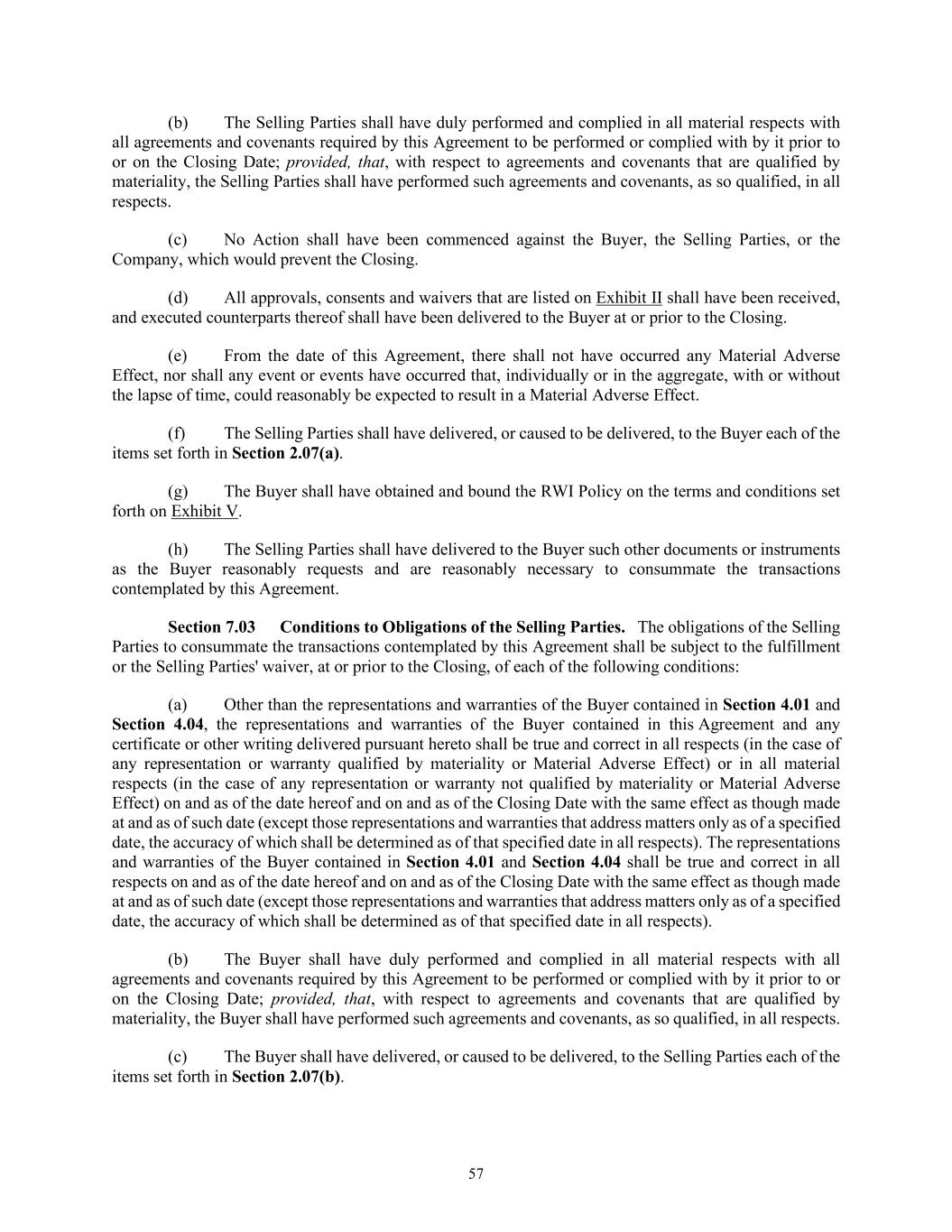 57 (b) The Selling Parties shall have duly performed and complied in all material respects with all agreements and covenants required by this Agreement to be performed or complied with by it prior to or on the Closing Date; provided, that, with respect to agreements and covenants that are qualified by materiality, the Selling Parties shall have performed such agreements and covenants, as so qualified, in all respects. (c) No Action shall have been commenced against the Buyer, the Selling Parties, or the Company, which would prevent the Closing. (d) All approvals, consents and waivers that are listed on Exhibit II shall have been received, and executed counterparts thereof shall have been delivered to the Buyer at or prior to the Closing. (e) From the date of this Agreement, there shall not have occurred any Material Adverse Effect, nor shall any event or events have occurred that, individually or in the aggregate, with or without the lapse of time, could reasonably be expected to result in a Material Adverse Effect. (f) The Selling Parties shall have delivered, or caused to be delivered, to the Buyer each of the items set forth in Section 2.07(a). (g) The Buyer shall have obtained and bound the RWI Policy on the terms and conditions set forth on Exhibit V. (h) The Selling Parties shall have delivered to the Buyer such other documents or instruments as the Buyer reasonably requests and are reasonably necessary to consummate the transactions contemplated by this Agreement. Section 7.03 Conditions to Obligations of the Selling Parties. The obligations of the Selling Parties to consummate the transactions contemplated by this Agreement shall be subject to the fulfillment or the Selling Parties' waiver, at or prior to the Closing, of each of the following conditions: (a) Other than the representations and warranties of the Buyer contained in Section 4.01 and Section 4.04, the representations and warranties of the Buyer contained in this Agreement and any certificate or other writing delivered pursuant hereto shall be true and correct in all respects (in the case of any representation or warranty qualified by materiality or Material Adverse Effect) or in all material respects (in the case of any representation or warranty not qualified by materiality or Material Adverse Effect) on and as of the date hereof and on and as of the Closing Date with the same effect as though made at and as of such date (except those representations and warranties that address matters only as of a specified date, the accuracy of which shall be determined as of that specified date in all respects). The representations and warranties of the Buyer contained in Section 4.01 and Section 4.04 shall be true and correct in all respects on and as of the date hereof and on and as of the Closing Date with the same effect as though made at and as of such date (except those representations and warranties that address matters only as of a specified date, the accuracy of which shall be determined as of that specified date in all respects). (b) The Buyer shall have duly performed and complied in all material respects with all agreements and covenants required by this Agreement to be performed or complied with by it prior to or on the Closing Date; provided, that, with respect to agreements and covenants that are qualified by materiality, the Buyer shall have performed such agreements and covenants, as so qualified, in all respects. (c) The Buyer shall have delivered, or caused to be delivered, to the Selling Parties each of the items set forth in Section 2.07(b).