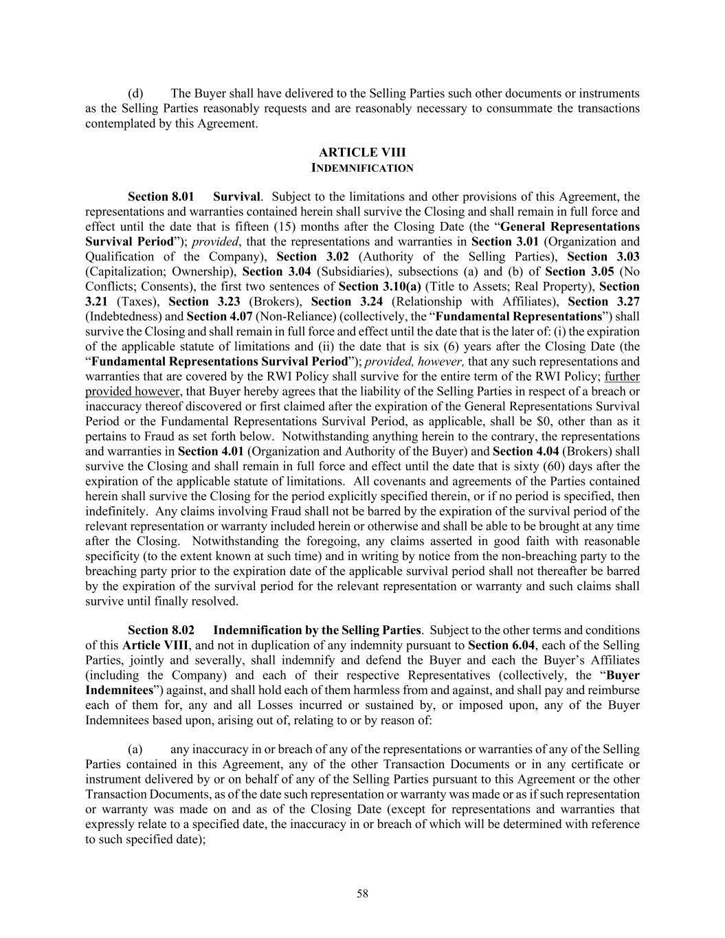 58 (d) The Buyer shall have delivered to the Selling Parties such other documents or instruments as the Selling Parties reasonably requests and are reasonably necessary to consummate the transactions contemplated by this Agreement. ARTICLE VIII INDEMNIFICATION Section 8.01 Survival. Subject to the limitations and other provisions of this Agreement, the representations and warranties contained herein shall survive the Closing and shall remain in full force and effect until the date that is fifteen (15) months after the Closing Date (the “General Representations Survival Period”); provided, that the representations and warranties in Section 3.01 (Organization and Qualification of the Company), Section 3.02 (Authority of the Selling Parties), Section 3.03 (Capitalization; Ownership), Section 3.04 (Subsidiaries), subsections (a) and (b) of Section 3.05 (No Conflicts; Consents), the first two sentences of Section 3.10(a) (Title to Assets; Real Property), Section 3.21 (Taxes), Section 3.23 (Brokers), Section 3.24 (Relationship with Affiliates), Section 3.27 (Indebtedness) and Section 4.07 (Non-Reliance) (collectively, the “Fundamental Representations”) shall survive the Closing and shall remain in full force and effect until the date that is the later of: (i) the expiration of the applicable statute of limitations and (ii) the date that is six (6) years after the Closing Date (the “Fundamental Representations Survival Period”); provided, however, that any such representations and warranties that are covered by the RWI Policy shall survive for the entire term of the RWI Policy; further provided however, that Buyer hereby agrees that the liability of the Selling Parties in respect of a breach or inaccuracy thereof discovered or first claimed after the expiration of the General Representations Survival Period or the Fundamental Representations Survival Period, as applicable, shall be $0, other than as it pertains to Fraud as set forth below. Notwithstanding anything herein to the contrary, the representations and warranties in Section 4.01 (Organization and Authority of the Buyer) and Section 4.04 (Brokers) shall survive the Closing and shall remain in full force and effect until the date that is sixty (60) days after the expiration of the applicable statute of limitations. All covenants and agreements of the Parties contained herein shall survive the Closing for the period explicitly specified therein, or if no period is specified, then indefinitely. Any claims involving Fraud shall not be barred by the expiration of the survival period of the relevant representation or warranty included herein or otherwise and shall be able to be brought at any time after the Closing. Notwithstanding the foregoing, any claims asserted in good faith with reasonable specificity (to the extent known at such time) and in writing by notice from the non-breaching party to the breaching party prior to the expiration date of the applicable survival period shall not thereafter be barred by the expiration of the survival period for the relevant representation or warranty and such claims shall survive until finally resolved. Section 8.02 Indemnification by the Selling Parties. Subject to the other terms and conditions of this Article VIII, and not in duplication of any indemnity pursuant to Section 6.04, each of the Selling Parties, jointly and severally, shall indemnify and defend the Buyer and each the Buyer’s Affiliates (including the Company) and each of their respective Representatives (collectively, the “Buyer Indemnitees”) against, and shall hold each of them harmless from and against, and shall pay and reimburse each of them for, any and all Losses incurred or sustained by, or imposed upon, any of the Buyer Indemnitees based upon, arising out of, relating to or by reason of: (a) any inaccuracy in or breach of any of the representations or warranties of any of the Selling Parties contained in this Agreement, any of the other Transaction Documents or in any certificate or instrument delivered by or on behalf of any of the Selling Parties pursuant to this Agreement or the other Transaction Documents, as of the date such representation or warranty was made or as if such representation or warranty was made on and as of the Closing Date (except for representations and warranties that expressly relate to a specified date, the inaccuracy in or breach of which will be determined with reference to such specified date);