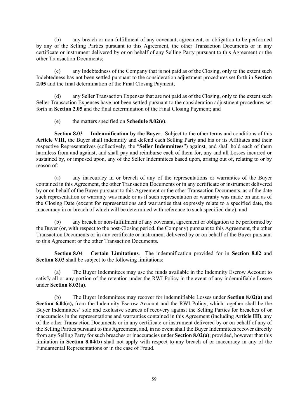 59 (b) any breach or non-fulfillment of any covenant, agreement, or obligation to be performed by any of the Selling Parties pursuant to this Agreement, the other Transaction Documents or in any certificate or instrument delivered by or on behalf of any Selling Party pursuant to this Agreement or the other Transaction Documents; (c) any Indebtedness of the Company that is not paid as of the Closing, only to the extent such Indebtedness has not been settled pursuant to the consideration adjustment procedures set forth in Section 2.05 and the final determination of the Final Closing Payment; (d) any Seller Transaction Expenses that are not paid as of the Closing, only to the extent such Seller Transaction Expenses have not been settled pursuant to the consideration adjustment procedures set forth in Section 2.05 and the final determination of the Final Closing Payment; and (e) the matters specified on Schedule 8.02(e). Section 8.03 Indemnification by the Buyer. Subject to the other terms and conditions of this Article VIII, the Buyer shall indemnify and defend each Selling Party and his or its Affiliates and their respective Representatives (collectively, the “Seller Indemnitees”) against, and shall hold each of them harmless from and against, and shall pay and reimburse each of them for, any and all Losses incurred or sustained by, or imposed upon, any of the Seller Indemnitees based upon, arising out of, relating to or by reason of: (a) any inaccuracy in or breach of any of the representations or warranties of the Buyer contained in this Agreement, the other Transaction Documents or in any certificate or instrument delivered by or on behalf of the Buyer pursuant to this Agreement or the other Transaction Documents, as of the date such representation or warranty was made or as if such representation or warranty was made on and as of the Closing Date (except for representations and warranties that expressly relate to a specified date, the inaccuracy in or breach of which will be determined with reference to such specified date); and (b) any breach or non-fulfillment of any covenant, agreement or obligation to be performed by the Buyer (or, with respect to the post-Closing period, the Company) pursuant to this Agreement, the other Transaction Documents or in any certificate or instrument delivered by or on behalf of the Buyer pursuant to this Agreement or the other Transaction Documents. Section 8.04 Certain Limitations. The indemnification provided for in Section 8.02 and Section 8.03 shall be subject to the following limitations: (a) The Buyer Indemnitees may use the funds available in the Indemnity Escrow Account to satisfy all or any portion of the retention under the RWI Policy in the event of any indemnifiable Losses under Section 8.02(a). (b) The Buyer Indemnitees may recover for indemnifiable Losses under Section 8.02(a) and Section 6.04(a), from the Indemnity Escrow Account and the RWI Policy, which together shall be the Buyer Indemnitees’ sole and exclusive sources of recovery against the Selling Parties for breaches of or inaccuracies in the representations and warranties contained in this Agreement (including Article III), any of the other Transaction Documents or in any certificate or instrument delivered by or on behalf of any of the Selling Parties pursuant to this Agreement, and, in no event shall the Buyer Indemnitees recover directly from any Selling Party for such breaches or inaccuracies under Section 8.02(a); provided, however that this limitation in Section 8.04(b) shall not apply with respect to any breach of or inaccuracy in any of the Fundamental Representations or in the case of Fraud.