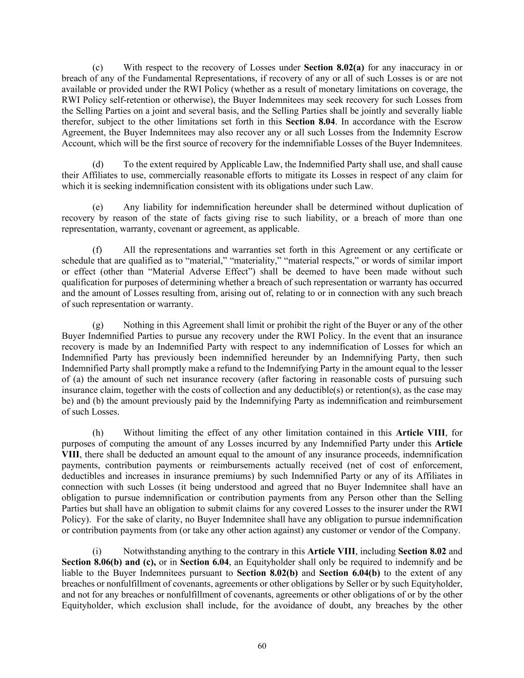 60 (c) With respect to the recovery of Losses under Section 8.02(a) for any inaccuracy in or breach of any of the Fundamental Representations, if recovery of any or all of such Losses is or are not available or provided under the RWI Policy (whether as a result of monetary limitations on coverage, the RWI Policy self-retention or otherwise), the Buyer Indemnitees may seek recovery for such Losses from the Selling Parties on a joint and several basis, and the Selling Parties shall be jointly and severally liable therefor, subject to the other limitations set forth in this Section 8.04. In accordance with the Escrow Agreement, the Buyer Indemnitees may also recover any or all such Losses from the Indemnity Escrow Account, which will be the first source of recovery for the indemnifiable Losses of the Buyer Indemnitees. (d) To the extent required by Applicable Law, the Indemnified Party shall use, and shall cause their Affiliates to use, commercially reasonable efforts to mitigate its Losses in respect of any claim for which it is seeking indemnification consistent with its obligations under such Law. (e) Any liability for indemnification hereunder shall be determined without duplication of recovery by reason of the state of facts giving rise to such liability, or a breach of more than one representation, warranty, covenant or agreement, as applicable. (f) All the representations and warranties set forth in this Agreement or any certificate or schedule that are qualified as to “material,” “materiality,” “material respects,” or words of similar import or effect (other than “Material Adverse Effect”) shall be deemed to have been made without such qualification for purposes of determining whether a breach of such representation or warranty has occurred and the amount of Losses resulting from, arising out of, relating to or in connection with any such breach of such representation or warranty. (g) Nothing in this Agreement shall limit or prohibit the right of the Buyer or any of the other Buyer Indemnified Parties to pursue any recovery under the RWI Policy. In the event that an insurance recovery is made by an Indemnified Party with respect to any indemnification of Losses for which an Indemnified Party has previously been indemnified hereunder by an Indemnifying Party, then such Indemnified Party shall promptly make a refund to the Indemnifying Party in the amount equal to the lesser of (a) the amount of such net insurance recovery (after factoring in reasonable costs of pursuing such insurance claim, together with the costs of collection and any deductible(s) or retention(s), as the case may be) and (b) the amount previously paid by the Indemnifying Party as indemnification and reimbursement of such Losses. (h) Without limiting the effect of any other limitation contained in this Article VIII, for purposes of computing the amount of any Losses incurred by any Indemnified Party under this Article VIII, there shall be deducted an amount equal to the amount of any insurance proceeds, indemnification payments, contribution payments or reimbursements actually received (net of cost of enforcement, deductibles and increases in insurance premiums) by such Indemnified Party or any of its Affiliates in connection with such Losses (it being understood and agreed that no Buyer Indemnitee shall have an obligation to pursue indemnification or contribution payments from any Person other than the Selling Parties but shall have an obligation to submit claims for any covered Losses to the insurer under the RWI Policy). For the sake of clarity, no Buyer Indemnitee shall have any obligation to pursue indemnification or contribution payments from (or take any other action against) any customer or vendor of the Company. (i) Notwithstanding anything to the contrary in this Article VIII, including Section 8.02 and Section 8.06(b) and (c), or in Section 6.04, an Equityholder shall only be required to indemnify and be liable to the Buyer Indemnitees pursuant to Section 8.02(b) and Section 6.04(b) to the extent of any breaches or nonfulfillment of covenants, agreements or other obligations by Seller or by such Equityholder, and not for any breaches or nonfulfillment of covenants, agreements or other obligations of or by the other Equityholder, which exclusion shall include, for the avoidance of doubt, any breaches by the other