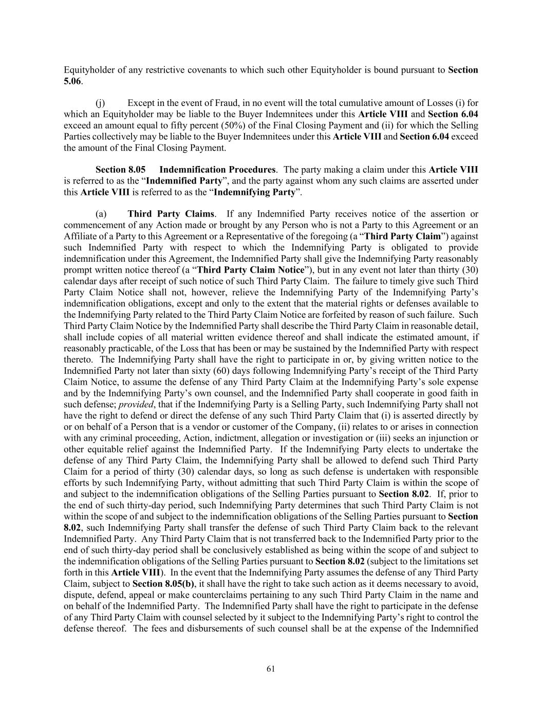 61 Equityholder of any restrictive covenants to which such other Equityholder is bound pursuant to Section 5.06. (j) Except in the event of Fraud, in no event will the total cumulative amount of Losses (i) for which an Equityholder may be liable to the Buyer Indemnitees under this Article VIII and Section 6.04 exceed an amount equal to fifty percent (50%) of the Final Closing Payment and (ii) for which the Selling Parties collectively may be liable to the Buyer Indemnitees under this Article VIII and Section 6.04 exceed the amount of the Final Closing Payment. Section 8.05 Indemnification Procedures. The party making a claim under this Article VIII is referred to as the “Indemnified Party”, and the party against whom any such claims are asserted under this Article VIII is referred to as the “Indemnifying Party”. (a) Third Party Claims. If any Indemnified Party receives notice of the assertion or commencement of any Action made or brought by any Person who is not a Party to this Agreement or an Affiliate of a Party to this Agreement or a Representative of the foregoing (a “Third Party Claim”) against such Indemnified Party with respect to which the Indemnifying Party is obligated to provide indemnification under this Agreement, the Indemnified Party shall give the Indemnifying Party reasonably prompt written notice thereof (a “Third Party Claim Notice”), but in any event not later than thirty (30) calendar days after receipt of such notice of such Third Party Claim. The failure to timely give such Third Party Claim Notice shall not, however, relieve the Indemnifying Party of the Indemnifying Party’s indemnification obligations, except and only to the extent that the material rights or defenses available to the Indemnifying Party related to the Third Party Claim Notice are forfeited by reason of such failure. Such Third Party Claim Notice by the Indemnified Party shall describe the Third Party Claim in reasonable detail, shall include copies of all material written evidence thereof and shall indicate the estimated amount, if reasonably practicable, of the Loss that has been or may be sustained by the Indemnified Party with respect thereto. The Indemnifying Party shall have the right to participate in or, by giving written notice to the Indemnified Party not later than sixty (60) days following Indemnifying Party’s receipt of the Third Party Claim Notice, to assume the defense of any Third Party Claim at the Indemnifying Party’s sole expense and by the Indemnifying Party’s own counsel, and the Indemnified Party shall cooperate in good faith in such defense; provided, that if the Indemnifying Party is a Selling Party, such Indemnifying Party shall not have the right to defend or direct the defense of any such Third Party Claim that (i) is asserted directly by or on behalf of a Person that is a vendor or customer of the Company, (ii) relates to or arises in connection with any criminal proceeding, Action, indictment, allegation or investigation or (iii) seeks an injunction or other equitable relief against the Indemnified Party. If the Indemnifying Party elects to undertake the defense of any Third Party Claim, the Indemnifying Party shall be allowed to defend such Third Party Claim for a period of thirty (30) calendar days, so long as such defense is undertaken with responsible efforts by such Indemnifying Party, without admitting that such Third Party Claim is within the scope of and subject to the indemnification obligations of the Selling Parties pursuant to Section 8.02. If, prior to the end of such thirty-day period, such Indemnifying Party determines that such Third Party Claim is not within the scope of and subject to the indemnification obligations of the Selling Parties pursuant to Section 8.02, such Indemnifying Party shall transfer the defense of such Third Party Claim back to the relevant Indemnified Party. Any Third Party Claim that is not transferred back to the Indemnified Party prior to the end of such thirty-day period shall be conclusively established as being within the scope of and subject to the indemnification obligations of the Selling Parties pursuant to Section 8.02 (subject to the limitations set forth in this Article VIII). In the event that the Indemnifying Party assumes the defense of any Third Party Claim, subject to Section 8.05(b), it shall have the right to take such action as it deems necessary to avoid, dispute, defend, appeal or make counterclaims pertaining to any such Third Party Claim in the name and on behalf of the Indemnified Party. The Indemnified Party shall have the right to participate in the defense of any Third Party Claim with counsel selected by it subject to the Indemnifying Party’s right to control the defense thereof. The fees and disbursements of such counsel shall be at the expense of the Indemnified