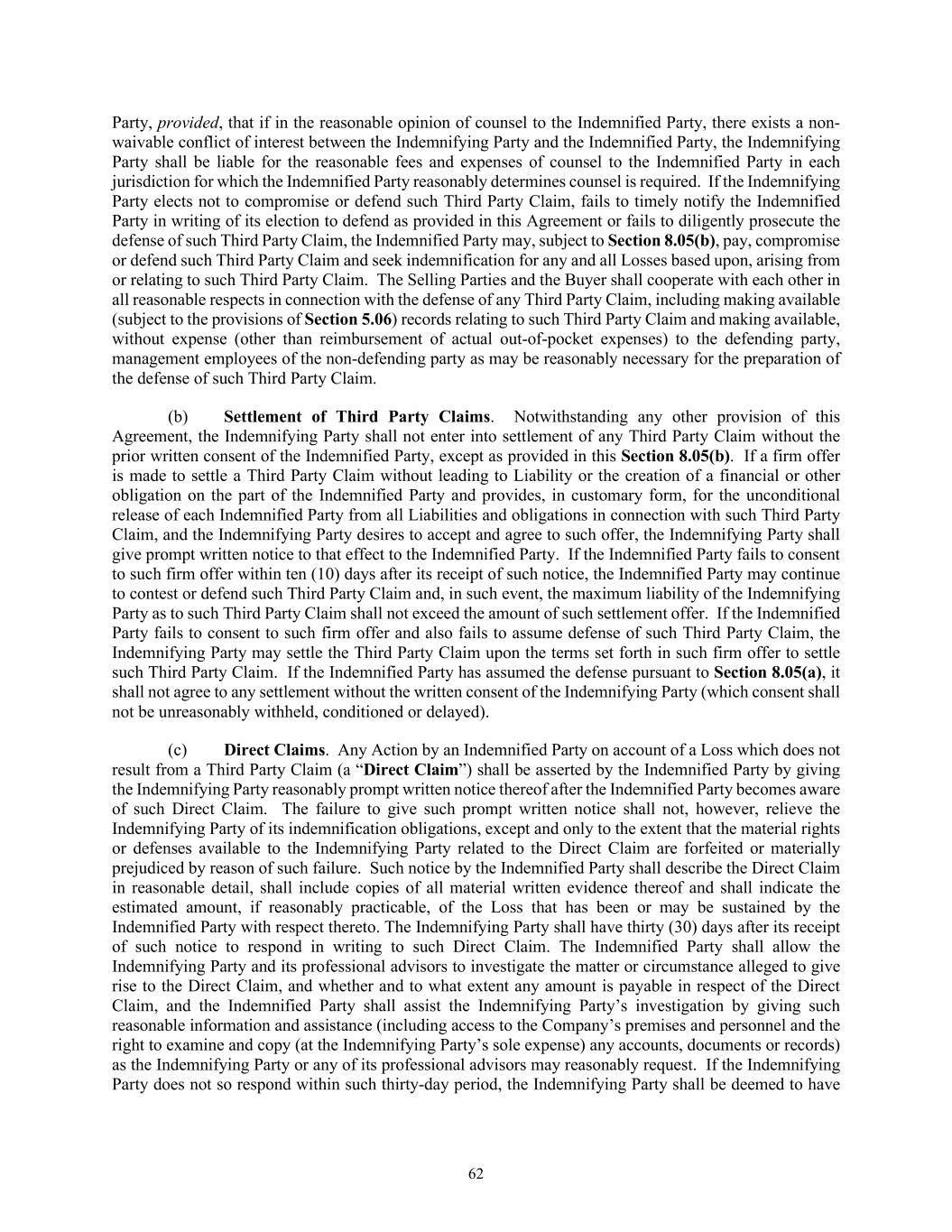 62 Party, provided, that if in the reasonable opinion of counsel to the Indemnified Party, there exists a non- waivable conflict of interest between the Indemnifying Party and the Indemnified Party, the Indemnifying Party shall be liable for the reasonable fees and expenses of counsel to the Indemnified Party in each jurisdiction for which the Indemnified Party reasonably determines counsel is required. If the Indemnifying Party elects not to compromise or defend such Third Party Claim, fails to timely notify the Indemnified Party in writing of its election to defend as provided in this Agreement or fails to diligently prosecute the defense of such Third Party Claim, the Indemnified Party may, subject to Section 8.05(b), pay, compromise or defend such Third Party Claim and seek indemnification for any and all Losses based upon, arising from or relating to such Third Party Claim. The Selling Parties and the Buyer shall cooperate with each other in all reasonable respects in connection with the defense of any Third Party Claim, including making available (subject to the provisions of Section 5.06) records relating to such Third Party Claim and making available, without expense (other than reimbursement of actual out-of-pocket expenses) to the defending party, management employees of the non-defending party as may be reasonably necessary for the preparation of the defense of such Third Party Claim. (b) Settlement of Third Party Claims. Notwithstanding any other provision of this Agreement, the Indemnifying Party shall not enter into settlement of any Third Party Claim without the prior written consent of the Indemnified Party, except as provided in this Section 8.05(b). If a firm offer is made to settle a Third Party Claim without leading to Liability or the creation of a financial or other obligation on the part of the Indemnified Party and provides, in customary form, for the unconditional release of each Indemnified Party from all Liabilities and obligations in connection with such Third Party Claim, and the Indemnifying Party desires to accept and agree to such offer, the Indemnifying Party shall give prompt written notice to that effect to the Indemnified Party. If the Indemnified Party fails to consent to such firm offer within ten (10) days after its receipt of such notice, the Indemnified Party may continue to contest or defend such Third Party Claim and, in such event, the maximum liability of the Indemnifying Party as to such Third Party Claim shall not exceed the amount of such settlement offer. If the Indemnified Party fails to consent to such firm offer and also fails to assume defense of such Third Party Claim, the Indemnifying Party may settle the Third Party Claim upon the terms set forth in such firm offer to settle such Third Party Claim. If the Indemnified Party has assumed the defense pursuant to Section 8.05(a), it shall not agree to any settlement without the written consent of the Indemnifying Party (which consent shall not be unreasonably withheld, conditioned or delayed). (c) Direct Claims. Any Action by an Indemnified Party on account of a Loss which does not result from a Third Party Claim (a “Direct Claim”) shall be asserted by the Indemnified Party by giving the Indemnifying Party reasonably prompt written notice thereof after the Indemnified Party becomes aware of such Direct Claim. The failure to give such prompt written notice shall not, however, relieve the Indemnifying Party of its indemnification obligations, except and only to the extent that the material rights or defenses available to the Indemnifying Party related to the Direct Claim are forfeited or materially prejudiced by reason of such failure. Such notice by the Indemnified Party shall describe the Direct Claim in reasonable detail, shall include copies of all material written evidence thereof and shall indicate the estimated amount, if reasonably practicable, of the Loss that has been or may be sustained by the Indemnified Party with respect thereto. The Indemnifying Party shall have thirty (30) days after its receipt of such notice to respond in writing to such Direct Claim. The Indemnified Party shall allow the Indemnifying Party and its professional advisors to investigate the matter or circumstance alleged to give rise to the Direct Claim, and whether and to what extent any amount is payable in respect of the Direct Claim, and the Indemnified Party shall assist the Indemnifying Party’s investigation by giving such reasonable information and assistance (including access to the Company’s premises and personnel and the right to examine and copy (at the Indemnifying Party’s sole expense) any accounts, documents or records) as the Indemnifying Party or any of its professional advisors may reasonably request. If the Indemnifying Party does not so respond within such thirty-day period, the Indemnifying Party shall be deemed to have
