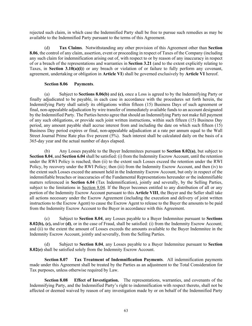 63 rejected such claim, in which case the Indemnified Party shall be free to pursue such remedies as may be available to the Indemnified Party pursuant to the terms of this Agreement. (d) Tax Claims. Notwithstanding any other provision of this Agreement other than Section 8.06, the control of any claim, assertion, event or proceeding in respect of Taxes of the Company (including any such claim for indemnification arising out of, with respect to or by reason of any inaccuracy in respect of or a breach of the representations and warranties in Section 3.21 (and to the extent explicitly relating to Taxes, in Section 3.10(a)(i)) or any breach or violation of or failure to fully perform any covenant, agreement, undertaking or obligation in Article VI) shall be governed exclusively by Article VI hereof. Section 8.06 Payments. (a) Subject to Sections 8.06(b) and (c), once a Loss is agreed to by the Indemnifying Party or finally adjudicated to be payable, in each case in accordance with the procedures set forth herein, the Indemnifying Party shall satisfy its obligations within fifteen (15) Business Days of such agreement or final, non-appealable adjudication by wire transfer of immediately available funds to an account designated by the Indemnified Party. The Parties hereto agree that should an Indemnifying Party not make full payment of any such obligations, or provide such joint written instructions, within such fifteen (15) Business Day period, any amount payable shall accrue interest from and including the date on which such fifteen (15) Business Day period expires or final, non-appealable adjudication at a rate per annum equal to the Wall Street Journal Prime Rate plus five percent (5%). Such interest shall be calculated daily on the basis of a 365-day year and the actual number of days elapsed. (b) Any Losses payable to the Buyer Indemnitees pursuant to Section 8.02(a), but subject to Section 8.04, and Section 6.04 shall be satisfied: (i) from the Indemnity Escrow Account, until the retention under the RWI Policy is reached; then (ii) to the extent such Losses exceed the retention under the RWI Policy, by recovery under the RWI Policy; then (iii) from the Indemnity Escrow Account, and then (iv) to the extent such Losses exceed the amount held in the Indemnity Escrow Account, but only in respect of the indemnifiable breaches or inaccuracies of the Fundamental Representations hereunder or the indemnifiable matters referenced in Section 6.04 (Tax Indemnification), jointly and severally, by the Selling Parties, subject to the limitations in Section 8.04. If the Buyer becomes entitled to any distribution of all or any portion of the Indemnity Escrow Account pursuant to this Article VIII, the Buyer and the Seller shall take all actions necessary under the Escrow Agreement (including the execution and delivery of joint written instructions to the Escrow Agent) to cause the Escrow Agent to release to the Buyer the amounts to be paid from the Indemnity Escrow Account to the Buyer in accordance with this Agreement. (c) Subject to Section 8.04, any Losses payable to a Buyer Indemnitee pursuant to Sections 8.02(b), (c), and/or (d), or in the case of Fraud, shall be satisfied: (i) from the Indemnity Escrow Account; and (ii) to the extent the amount of Losses exceeds the amounts available to the Buyer Indemnitee in the Indemnity Escrow Account, jointly and severally, from the Selling Parties. (d) Subject to Section 8.04, any Losses payable to a Buyer Indemnitee pursuant to Section 8.02(e) shall be satisfied solely from the Indemnity Escrow Account. Section 8.07 Tax Treatment of Indemnification Payments. All indemnification payments made under this Agreement shall be treated by the Parties as an adjustment to the Total Consideration for Tax purposes, unless otherwise required by Law. Section 8.08 Effect of Investigation. The representations, warranties, and covenants of the Indemnifying Party, and the Indemnified Party’s right to indemnification with respect thereto, shall not be affected or deemed waived by reason of any investigation made by or on behalf of the Indemnified Party