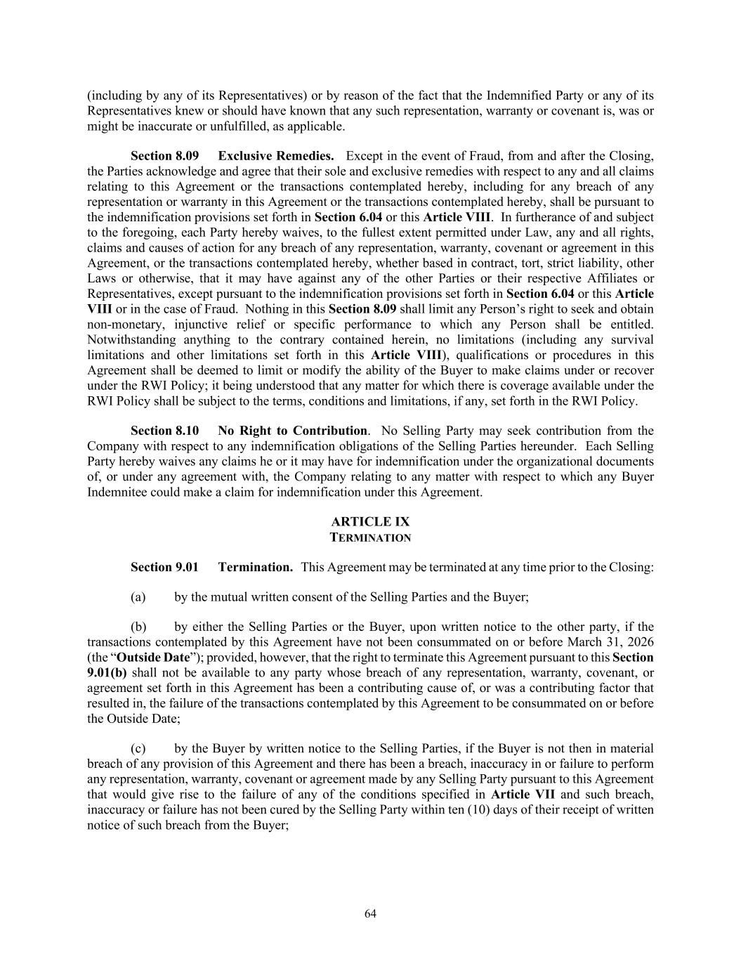 64 (including by any of its Representatives) or by reason of the fact that the Indemnified Party or any of its Representatives knew or should have known that any such representation, warranty or covenant is, was or might be inaccurate or unfulfilled, as applicable. Section 8.09 Exclusive Remedies. Except in the event of Fraud, from and after the Closing, the Parties acknowledge and agree that their sole and exclusive remedies with respect to any and all claims relating to this Agreement or the transactions contemplated hereby, including for any breach of any representation or warranty in this Agreement or the transactions contemplated hereby, shall be pursuant to the indemnification provisions set forth in Section 6.04 or this Article VIII. In furtherance of and subject to the foregoing, each Party hereby waives, to the fullest extent permitted under Law, any and all rights, claims and causes of action for any breach of any representation, warranty, covenant or agreement in this Agreement, or the transactions contemplated hereby, whether based in contract, tort, strict liability, other Laws or otherwise, that it may have against any of the other Parties or their respective Affiliates or Representatives, except pursuant to the indemnification provisions set forth in Section 6.04 or this Article VIII or in the case of Fraud. Nothing in this Section 8.09 shall limit any Person’s right to seek and obtain non-monetary, injunctive relief or specific performance to which any Person shall be entitled. Notwithstanding anything to the contrary contained herein, no limitations (including any survival limitations and other limitations set forth in this Article VIII), qualifications or procedures in this Agreement shall be deemed to limit or modify the ability of the Buyer to make claims under or recover under the RWI Policy; it being understood that any matter for which there is coverage available under the RWI Policy shall be subject to the terms, conditions and limitations, if any, set forth in the RWI Policy. Section 8.10 No Right to Contribution. No Selling Party may seek contribution from the Company with respect to any indemnification obligations of the Selling Parties hereunder. Each Selling Party hereby waives any claims he or it may have for indemnification under the organizational documents of, or under any agreement with, the Company relating to any matter with respect to which any Buyer Indemnitee could make a claim for indemnification under this Agreement. ARTICLE IX TERMINATION Section 9.01 Termination. This Agreement may be terminated at any time prior to the Closing: (a) by the mutual written consent of the Selling Parties and the Buyer; (b) by either the Selling Parties or the Buyer, upon written notice to the other party, if the transactions contemplated by this Agreement have not been consummated on or before March 31, 2026 (the “Outside Date”); provided, however, that the right to terminate this Agreement pursuant to this Section 9.01(b) shall not be available to any party whose breach of any representation, warranty, covenant, or agreement set forth in this Agreement has been a contributing cause of, or was a contributing factor that resulted in, the failure of the transactions contemplated by this Agreement to be consummated on or before the Outside Date; (c) by the Buyer by written notice to the Selling Parties, if the Buyer is not then in material breach of any provision of this Agreement and there has been a breach, inaccuracy in or failure to perform any representation, warranty, covenant or agreement made by any Selling Party pursuant to this Agreement that would give rise to the failure of any of the conditions specified in Article VII and such breach, inaccuracy or failure has not been cured by the Selling Party within ten (10) days of their receipt of written notice of such breach from the Buyer;