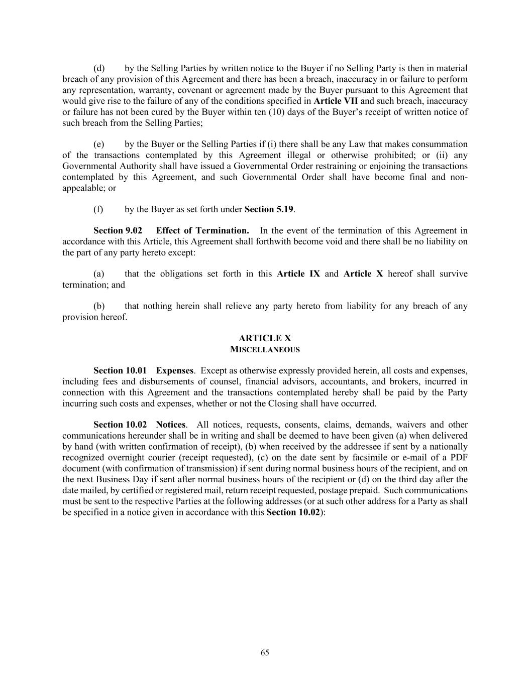 65 (d) by the Selling Parties by written notice to the Buyer if no Selling Party is then in material breach of any provision of this Agreement and there has been a breach, inaccuracy in or failure to perform any representation, warranty, covenant or agreement made by the Buyer pursuant to this Agreement that would give rise to the failure of any of the conditions specified in Article VII and such breach, inaccuracy or failure has not been cured by the Buyer within ten (10) days of the Buyer’s receipt of written notice of such breach from the Selling Parties; (e) by the Buyer or the Selling Parties if (i) there shall be any Law that makes consummation of the transactions contemplated by this Agreement illegal or otherwise prohibited; or (ii) any Governmental Authority shall have issued a Governmental Order restraining or enjoining the transactions contemplated by this Agreement, and such Governmental Order shall have become final and non- appealable; or (f) by the Buyer as set forth under Section 5.19. Section 9.02 Effect of Termination. In the event of the termination of this Agreement in accordance with this Article, this Agreement shall forthwith become void and there shall be no liability on the part of any party hereto except: (a) that the obligations set forth in this Article IX and Article X hereof shall survive termination; and (b) that nothing herein shall relieve any party hereto from liability for any breach of any provision hereof. ARTICLE X MISCELLANEOUS Section 10.01 Expenses. Except as otherwise expressly provided herein, all costs and expenses, including fees and disbursements of counsel, financial advisors, accountants, and brokers, incurred in connection with this Agreement and the transactions contemplated hereby shall be paid by the Party incurring such costs and expenses, whether or not the Closing shall have occurred. Section 10.02 Notices. All notices, requests, consents, claims, demands, waivers and other communications hereunder shall be in writing and shall be deemed to have been given (a) when delivered by hand (with written confirmation of receipt), (b) when received by the addressee if sent by a nationally recognized overnight courier (receipt requested), (c) on the date sent by facsimile or e-mail of a PDF document (with confirmation of transmission) if sent during normal business hours of the recipient, and on the next Business Day if sent after normal business hours of the recipient or (d) on the third day after the date mailed, by certified or registered mail, return receipt requested, postage prepaid. Such communications must be sent to the respective Parties at the following addresses (or at such other address for a Party as shall be specified in a notice given in accordance with this Section 10.02):