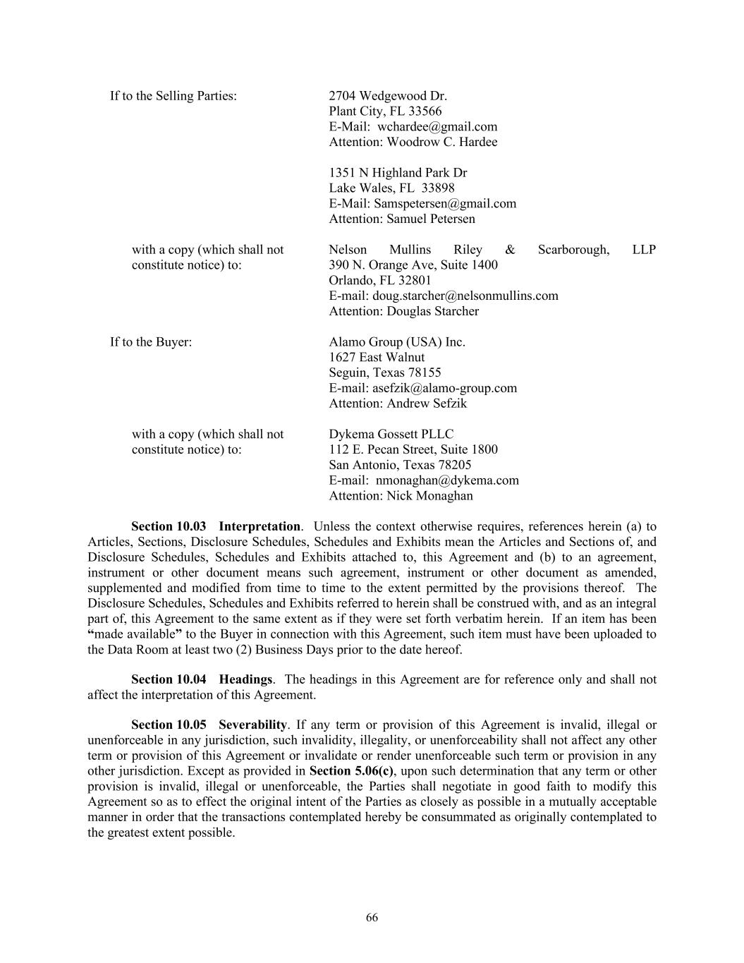 66 If to the Selling Parties: 2704 Wedgewood Dr. Plant City, FL 33566 E-Mail: wchardee@gmail.com Attention: Woodrow C. Hardee 1351 N Highland Park Dr Lake Wales, FL 33898 E-Mail: Samspetersen@gmail.com Attention: Samuel Petersen with a copy (which shall not constitute notice) to: Nelson Mullins Riley & Scarborough, LLP 390 N. Orange Ave, Suite 1400 Orlando, FL 32801 E-mail: doug.starcher@nelsonmullins.com Attention: Douglas Starcher If to the Buyer: Alamo Group (USA) Inc. 1627 East Walnut Seguin, Texas 78155 E-mail: asefzik@alamo-group.com Attention: Andrew Sefzik with a copy (which shall not constitute notice) to: Dykema Gossett PLLC 112 E. Pecan Street, Suite 1800 San Antonio, Texas 78205 E-mail: nmonaghan@dykema.com Attention: Nick Monaghan Section 10.03 Interpretation. Unless the context otherwise requires, references herein (a) to Articles, Sections, Disclosure Schedules, Schedules and Exhibits mean the Articles and Sections of, and Disclosure Schedules, Schedules and Exhibits attached to, this Agreement and (b) to an agreement, instrument or other document means such agreement, instrument or other document as amended, supplemented and modified from time to time to the extent permitted by the provisions thereof. The Disclosure Schedules, Schedules and Exhibits referred to herein shall be construed with, and as an integral part of, this Agreement to the same extent as if they were set forth verbatim herein. If an item has been “made available” to the Buyer in connection with this Agreement, such item must have been uploaded to the Data Room at least two (2) Business Days prior to the date hereof. Section 10.04 Headings. The headings in this Agreement are for reference only and shall not affect the interpretation of this Agreement. Section 10.05 Severability. If any term or provision of this Agreement is invalid, illegal or unenforceable in any jurisdiction, such invalidity, illegality, or unenforceability shall not affect any other term or provision of this Agreement or invalidate or render unenforceable such term or provision in any other jurisdiction. Except as provided in Section 5.06(c), upon such determination that any term or other provision is invalid, illegal or unenforceable, the Parties shall negotiate in good faith to modify this Agreement so as to effect the original intent of the Parties as closely as possible in a mutually acceptable manner in order that the transactions contemplated hereby be consummated as originally contemplated to the greatest extent possible.