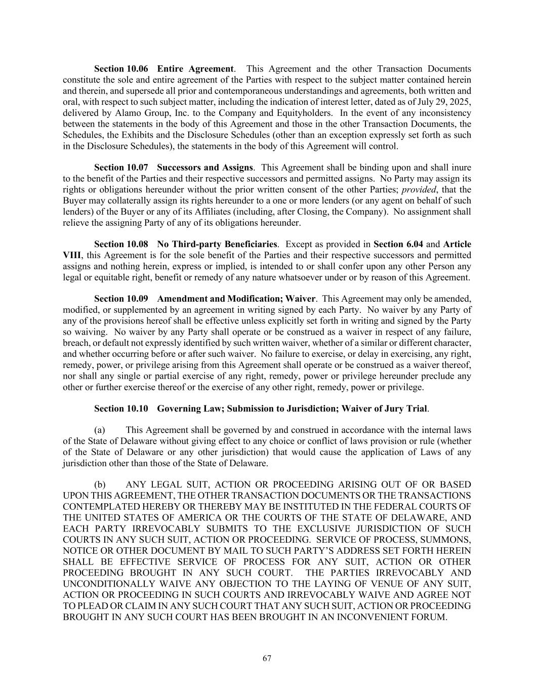 67 Section 10.06 Entire Agreement. This Agreement and the other Transaction Documents constitute the sole and entire agreement of the Parties with respect to the subject matter contained herein and therein, and supersede all prior and contemporaneous understandings and agreements, both written and oral, with respect to such subject matter, including the indication of interest letter, dated as of July 29, 2025, delivered by Alamo Group, Inc. to the Company and Equityholders. In the event of any inconsistency between the statements in the body of this Agreement and those in the other Transaction Documents, the Schedules, the Exhibits and the Disclosure Schedules (other than an exception expressly set forth as such in the Disclosure Schedules), the statements in the body of this Agreement will control. Section 10.07 Successors and Assigns. This Agreement shall be binding upon and shall inure to the benefit of the Parties and their respective successors and permitted assigns. No Party may assign its rights or obligations hereunder without the prior written consent of the other Parties; provided, that the Buyer may collaterally assign its rights hereunder to a one or more lenders (or any agent on behalf of such lenders) of the Buyer or any of its Affiliates (including, after Closing, the Company). No assignment shall relieve the assigning Party of any of its obligations hereunder. Section 10.08 No Third-party Beneficiaries. Except as provided in Section 6.04 and Article VIII, this Agreement is for the sole benefit of the Parties and their respective successors and permitted assigns and nothing herein, express or implied, is intended to or shall confer upon any other Person any legal or equitable right, benefit or remedy of any nature whatsoever under or by reason of this Agreement. Section 10.09 Amendment and Modification; Waiver. This Agreement may only be amended, modified, or supplemented by an agreement in writing signed by each Party. No waiver by any Party of any of the provisions hereof shall be effective unless explicitly set forth in writing and signed by the Party so waiving. No waiver by any Party shall operate or be construed as a waiver in respect of any failure, breach, or default not expressly identified by such written waiver, whether of a similar or different character, and whether occurring before or after such waiver. No failure to exercise, or delay in exercising, any right, remedy, power, or privilege arising from this Agreement shall operate or be construed as a waiver thereof, nor shall any single or partial exercise of any right, remedy, power or privilege hereunder preclude any other or further exercise thereof or the exercise of any other right, remedy, power or privilege. Section 10.10 Governing Law; Submission to Jurisdiction; Waiver of Jury Trial. (a) This Agreement shall be governed by and construed in accordance with the internal laws of the State of Delaware without giving effect to any choice or conflict of laws provision or rule (whether of the State of Delaware or any other jurisdiction) that would cause the application of Laws of any jurisdiction other than those of the State of Delaware. (b) ANY LEGAL SUIT, ACTION OR PROCEEDING ARISING OUT OF OR BASED UPON THIS AGREEMENT, THE OTHER TRANSACTION DOCUMENTS OR THE TRANSACTIONS CONTEMPLATED HEREBY OR THEREBY MAY BE INSTITUTED IN THE FEDERAL COURTS OF THE UNITED STATES OF AMERICA OR THE COURTS OF THE STATE OF DELAWARE, AND EACH PARTY IRREVOCABLY SUBMITS TO THE EXCLUSIVE JURISDICTION OF SUCH COURTS IN ANY SUCH SUIT, ACTION OR PROCEEDING. SERVICE OF PROCESS, SUMMONS, NOTICE OR OTHER DOCUMENT BY MAIL TO SUCH PARTY’S ADDRESS SET FORTH HEREIN SHALL BE EFFECTIVE SERVICE OF PROCESS FOR ANY SUIT, ACTION OR OTHER PROCEEDING BROUGHT IN ANY SUCH COURT. THE PARTIES IRREVOCABLY AND UNCONDITIONALLY WAIVE ANY OBJECTION TO THE LAYING OF VENUE OF ANY SUIT, ACTION OR PROCEEDING IN SUCH COURTS AND IRREVOCABLY WAIVE AND AGREE NOT TO PLEAD OR CLAIM IN ANY SUCH COURT THAT ANY SUCH SUIT, ACTION OR PROCEEDING BROUGHT IN ANY SUCH COURT HAS BEEN BROUGHT IN AN INCONVENIENT FORUM.