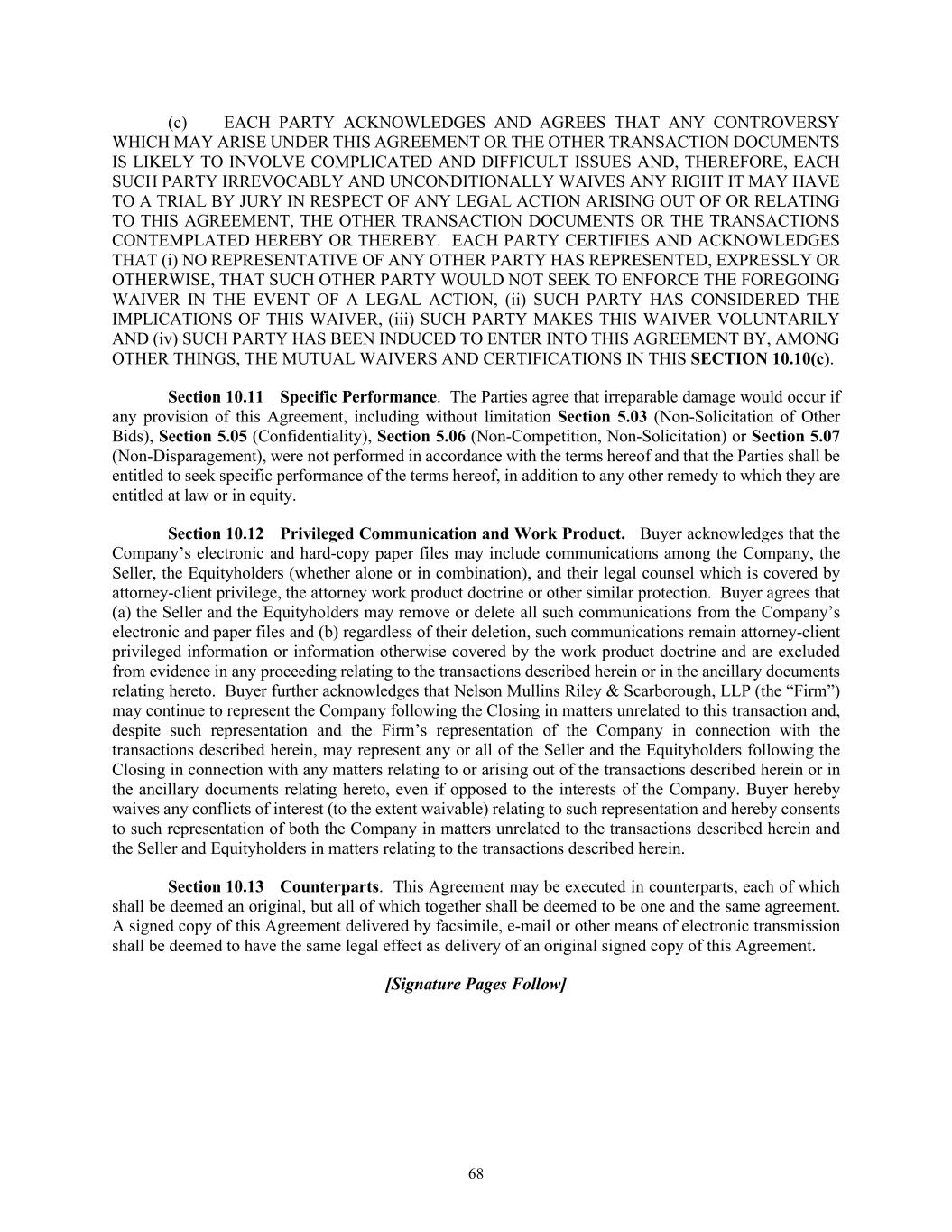 68 (c) EACH PARTY ACKNOWLEDGES AND AGREES THAT ANY CONTROVERSY WHICH MAY ARISE UNDER THIS AGREEMENT OR THE OTHER TRANSACTION DOCUMENTS IS LIKELY TO INVOLVE COMPLICATED AND DIFFICULT ISSUES AND, THEREFORE, EACH SUCH PARTY IRREVOCABLY AND UNCONDITIONALLY WAIVES ANY RIGHT IT MAY HAVE TO A TRIAL BY JURY IN RESPECT OF ANY LEGAL ACTION ARISING OUT OF OR RELATING TO THIS AGREEMENT, THE OTHER TRANSACTION DOCUMENTS OR THE TRANSACTIONS CONTEMPLATED HEREBY OR THEREBY. EACH PARTY CERTIFIES AND ACKNOWLEDGES THAT (i) NO REPRESENTATIVE OF ANY OTHER PARTY HAS REPRESENTED, EXPRESSLY OR OTHERWISE, THAT SUCH OTHER PARTY WOULD NOT SEEK TO ENFORCE THE FOREGOING WAIVER IN THE EVENT OF A LEGAL ACTION, (ii) SUCH PARTY HAS CONSIDERED THE IMPLICATIONS OF THIS WAIVER, (iii) SUCH PARTY MAKES THIS WAIVER VOLUNTARILY AND (iv) SUCH PARTY HAS BEEN INDUCED TO ENTER INTO THIS AGREEMENT BY, AMONG OTHER THINGS, THE MUTUAL WAIVERS AND CERTIFICATIONS IN THIS SECTION 10.10(c). Section 10.11 Specific Performance. The Parties agree that irreparable damage would occur if any provision of this Agreement, including without limitation Section 5.03 (Non-Solicitation of Other Bids), Section 5.05 (Confidentiality), Section 5.06 (Non-Competition, Non-Solicitation) or Section 5.07 (Non-Disparagement), were not performed in accordance with the terms hereof and that the Parties shall be entitled to seek specific performance of the terms hereof, in addition to any other remedy to which they are entitled at law or in equity. Section 10.12 Privileged Communication and Work Product. Buyer acknowledges that the Company’s electronic and hard-copy paper files may include communications among the Company, the Seller, the Equityholders (whether alone or in combination), and their legal counsel which is covered by attorney-client privilege, the attorney work product doctrine or other similar protection. Buyer agrees that (a) the Seller and the Equityholders may remove or delete all such communications from the Company’s electronic and paper files and (b) regardless of their deletion, such communications remain attorney-client privileged information or information otherwise covered by the work product doctrine and are excluded from evidence in any proceeding relating to the transactions described herein or in the ancillary documents relating hereto. Buyer further acknowledges that Nelson Mullins Riley & Scarborough, LLP (the “Firm”) may continue to represent the Company following the Closing in matters unrelated to this transaction and, despite such representation and the Firm’s representation of the Company in connection with the transactions described herein, may represent any or all of the Seller and the Equityholders following the Closing in connection with any matters relating to or arising out of the transactions described herein or in the ancillary documents relating hereto, even if opposed to the interests of the Company. Buyer hereby waives any conflicts of interest (to the extent waivable) relating to such representation and hereby consents to such representation of both the Company in matters unrelated to the transactions described herein and the Seller and Equityholders in matters relating to the transactions described herein. Section 10.13 Counterparts. This Agreement may be executed in counterparts, each of which shall be deemed an original, but all of which together shall be deemed to be one and the same agreement. A signed copy of this Agreement delivered by facsimile, e-mail or other means of electronic transmission shall be deemed to have the same legal effect as delivery of an original signed copy of this Agreement. [Signature Pages Follow]