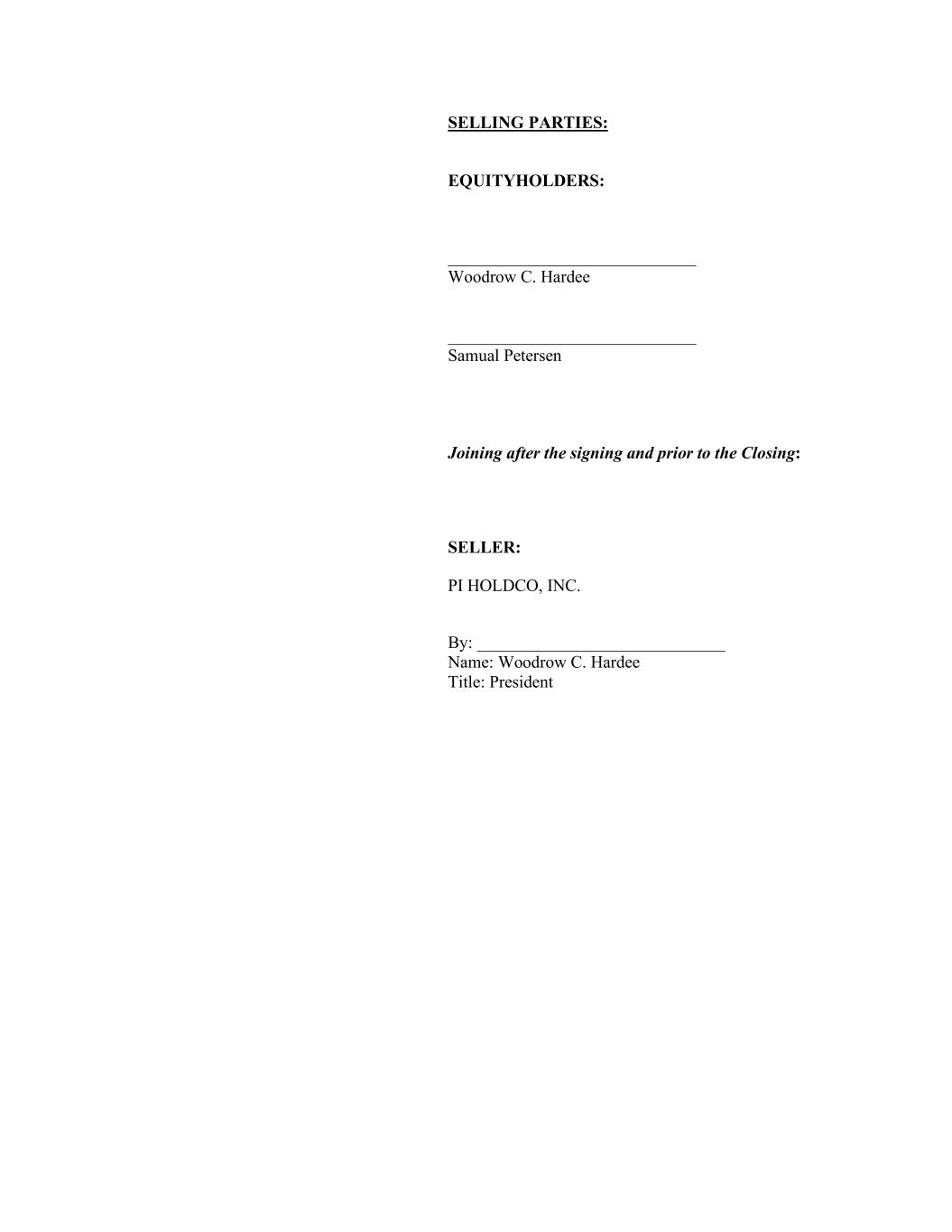 SELLING PARTIES: EQUITYHOLDERS: _____________________________ Woodrow C. Hardee _____________________________ Samual Petersen Joining after the signing and prior to the Closing: SELLER: PI HOLDCO, INC. By: _____________________________ Name: Woodrow C. Hardee Title: President