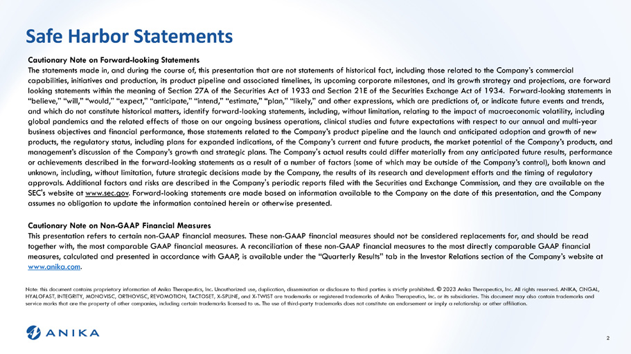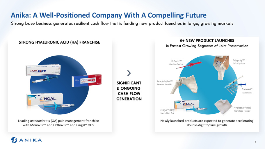 Safe Harbor Statements 2 Cautionary Note on Forward - looking Statements The statements made in, and during the course of, this presentation that are not statements of historical fact, including those related to the Company’s commercial capabilities, initiatives and production, its product pipeline and associated timelines, its upcoming corporate milestones, and its growth strategy and projections, are forward looking statements within the meaning of Section 27A of the Securities Act of 1933 and Section 21E of the Securities Exchange Act of 1934. Forward - looking statements in “believe,” “will,” “would,” “expect,” “anticipate,” “intend,” “estimate,” “plan,” “likely,” and other expressions, which are predictions of, or indicate future events and trends, and which do not constitute historical matters, identify forward - looking statements, including, without limitation, relating to the impact of macroeconomic volatility, including global pandemics and the related effects of those on our ongoing business operations, clinical studies and future expectations with respect to our annual and multi - year business objectives and financial performance, those statements related to the Company’s product pipeline and the launch and anticipated adoption and growth of new products, the regulatory status, including plans for expanded indications, of the Company’s current and future products, the market potential of the Company’s products, and management’s discussion of the Company’s growth and strategic plans. The Company's actual results could differ materially from any anticipated future results, performance or achievements described in the forward - looking statements as a result of a number of factors (some of which may be outside of the Company’s control), both known and unknown, including, without limitation, future strategic decisions made by the Company, the results of its research and development efforts and the timing of regulatory approvals. Additional factors and risks are described in the Company's periodic reports filed with the Securities and Exchange Commission, and they are available on the SEC's website at www.sec.gov . Forward - looking statements are made based on information available to the Company on the date of this presentation, and the Company assumes no obligation to update the information contained herein or otherwise presented. Cautionary Note on Non - GAAP Financial Measures This presentation refers to certain non - GAAP financial measures. These non - GAAP financial measures should not be considered replacements for, and should be read together with, the most comparable GAAP financial measures. A reconciliation of these non - GAAP financial measures to the most directly comparable GAAP financial measures, calculated and presented in accordance with GAAP, is available under the “Quarterly Results” tab in the Investor Relations section of the Company’s website at www.anika.com . Note: this document contains proprietary information of Anika Therapeutics, Inc. Unauthorized use, duplication, dissemination or disclosure to third parties is strictly prohibited. © 2023 Anika Therapeutics, Inc. All rights reserved. ANIKA, CINGAL, HYALOFAST, INTEGRITY, MONOVISC, ORTHOVISC, REVOMOTION, TACTOSET, X - SPLINE, and X - TWIST are trademarks or registered trademarks of Anika Therapeutics, Inc. or its subsidiaries. This document may also contain trademarks and service marks that are the property of other companies, including certain trademarks licensed to us. The use of third - party trademarks does not constitute an endorsement or imply a relationship or other affiliation.