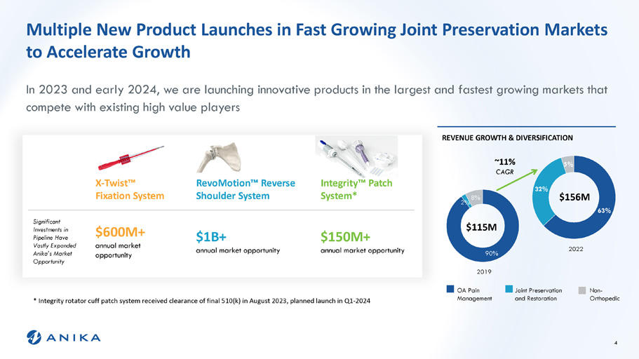 6+ NEW PRODUCT LAUNCHES in Fastest Growing Segments of Joint Preservation SIGNIFICANT & ONGOING CASH FLOW GENERATION STRONG HYALURONIC ACID (HA) FRANCHISE Leading osteoarthritis (OA) pain management franchise with Monovisc® and Orthovisc® and Cingal® OUS Newly launched products are expected to generate accelerating double - digit topline growth Anika: A Well - Positioned Company With A Compelling Future Strong base business generates resilient cash flow that is funding new product launches in large, growing markets X - Twist TM Fixation System Integrity TM Patch System Tactoset ® Expansion Hyalofast ® (US) Cartilage Repair Cingal ® (US) Next - Gen OA RevoMotion TM Reverse Shoulder 3