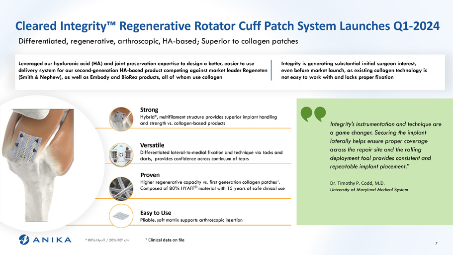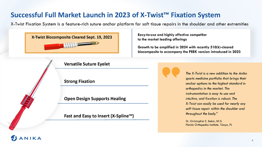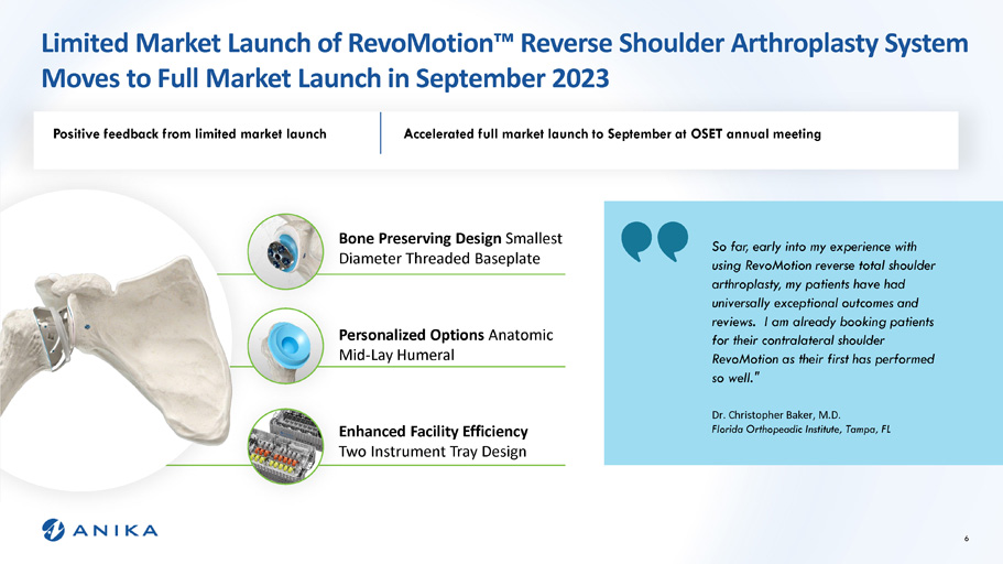 Versatile Suture Eyelet Strong Fixation Open Design Supports Healing Fast and Easy to Insert (X - Spline Ρ ) Successful Full Market Launch in 2023 of X - Twist Ρ Fixation System X - Twist Fixation System is a feature - rich suture anchor platform for soft tissue repairs in the shoulder and other extremities Easy - to - use and highly effective competitor to the market leading offerings Growth to be amplified in 2024 with recently 510(k) - cleared biocomposite to accompany the PEEK version introduced in 2023 The X - Twist is a new addition to the Anika sports medicine portfolio that brings their anchor options to the highest standard in orthopedics in the market. The instrumentation is easy to use and intuitive, and fixation is robust. The X - Twist can easily be used for nearly any soft tissue repair within the shoulder and throughout the body . ” Dr . Christopher E . Baker, M . D . Florida Orthopedics Institute, Tampa, FL X - Twist Biocomposite Cleared Sept. 19, 2023 5