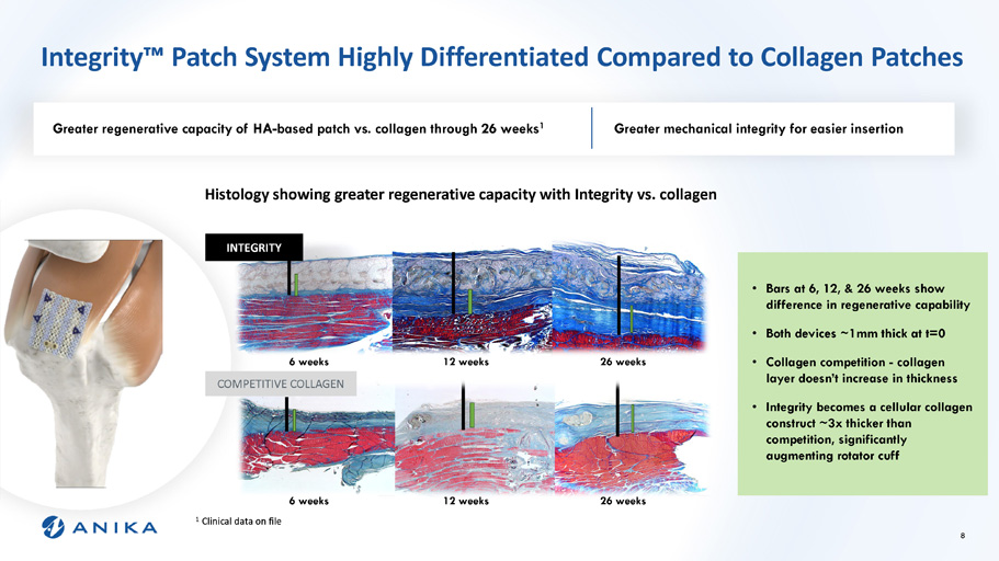 Strong Hybrid*, multifilament structure provides superior implant handling and strength vs. collagen - based products Versatile Differentiated lateral - to - medial fixation and technique via tacks and darts, provides confidence across continuum of tears Proven Higher regenerative capacity vs. first generation collagen patches 1 . Composed of 80% HYAFF ® material with 15 years of safe clinical use Easy to Use Pliable, soft matrix supports arthroscopic insertion * 80% Hyaff / 20% PET v/v Cleared Integrity Ρ Regenerative Rotator Cuff Patch System Launches Q1 - 2024 Differentiated, regenerative, arthroscopic, HA - based; Superior to collagen patches Leveraged our hyaluronic acid (HA) and joint preservation expertise to design a better, easier to use delivery system for our second - generation HA - based product competing against market leader Regeneten (Smith & Nephew), as well as Embody and BioRez products, all of whom use collagen Integrity is generating substantial initial surgeon interest, even before market launch, as existing collagen technology is not easy to work with and lacks proper fixation Integrity’s instrumentation and technique are a game changer. Securing the implant laterally helps ensure proper coverage across the repair site and the rolling deployment tool provides consistent and repeatable implant placement.” Dr. Timothy P. Codd, M.D. University of Maryland Medical System 1 Clinical data on file 7