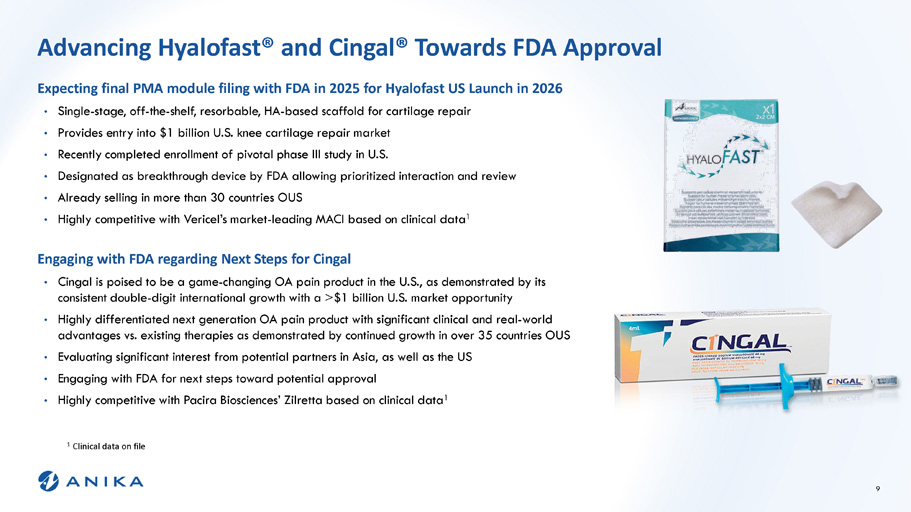 Advancing Hyalofast® and Cingal® Towards FDA Approval Expecting final PMA module filing with FDA in 2025 for Hyalofast US Launch in 2026 • Single - stage, off - the - shelf, resorbable, HA - based scaffold for cartilage repair • Provides entry into $1 billion U.S. knee cartilage repair market • Recently completed enrollment of pivotal phase III study in U.S. • Designated as breakthrough device by FDA allowing prioritized interaction and review • Already selling in more than 30 countries OUS • Highly competitive with Vericel’s market - leading MACI based on clinical data 1 Engaging with FDA regarding Next Steps for Cingal • Cingal is poised to be a game - changing OA pain product in the U.S., as demonstrated by its consistent double - digit international growth with a >$1 billion U.S. market opportunity • Highly differentiated next generation OA pain product with significant clinical and real - world advantages vs. existing therapies as demonstrated by continued growth in over 35 countries OUS • Evaluating significant interest from potential partners in Asia, as well as the US • Engaging with FDA for next steps toward potential approval • Highly competitive with Pacira Biosciences’ Zilretta based on clinical data 1 1 Clinical data on file 9